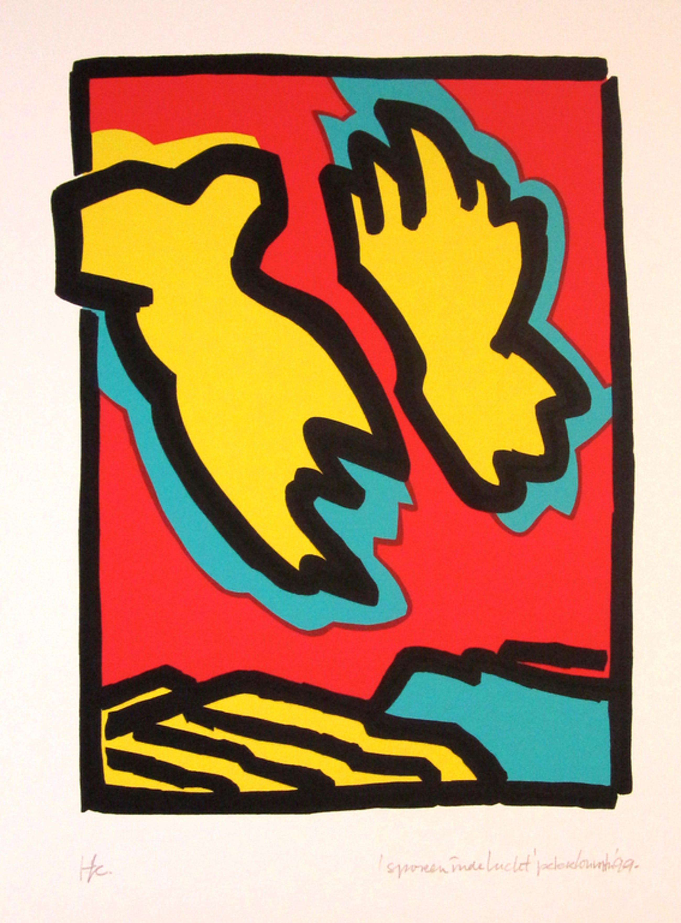 Peter Louman: Sporen in de lucht - kleuren zeefdruk HC in perfecte conditie. Papier grootte is 40 x 50 cm en de afbeelding is 29 x 38 cm.