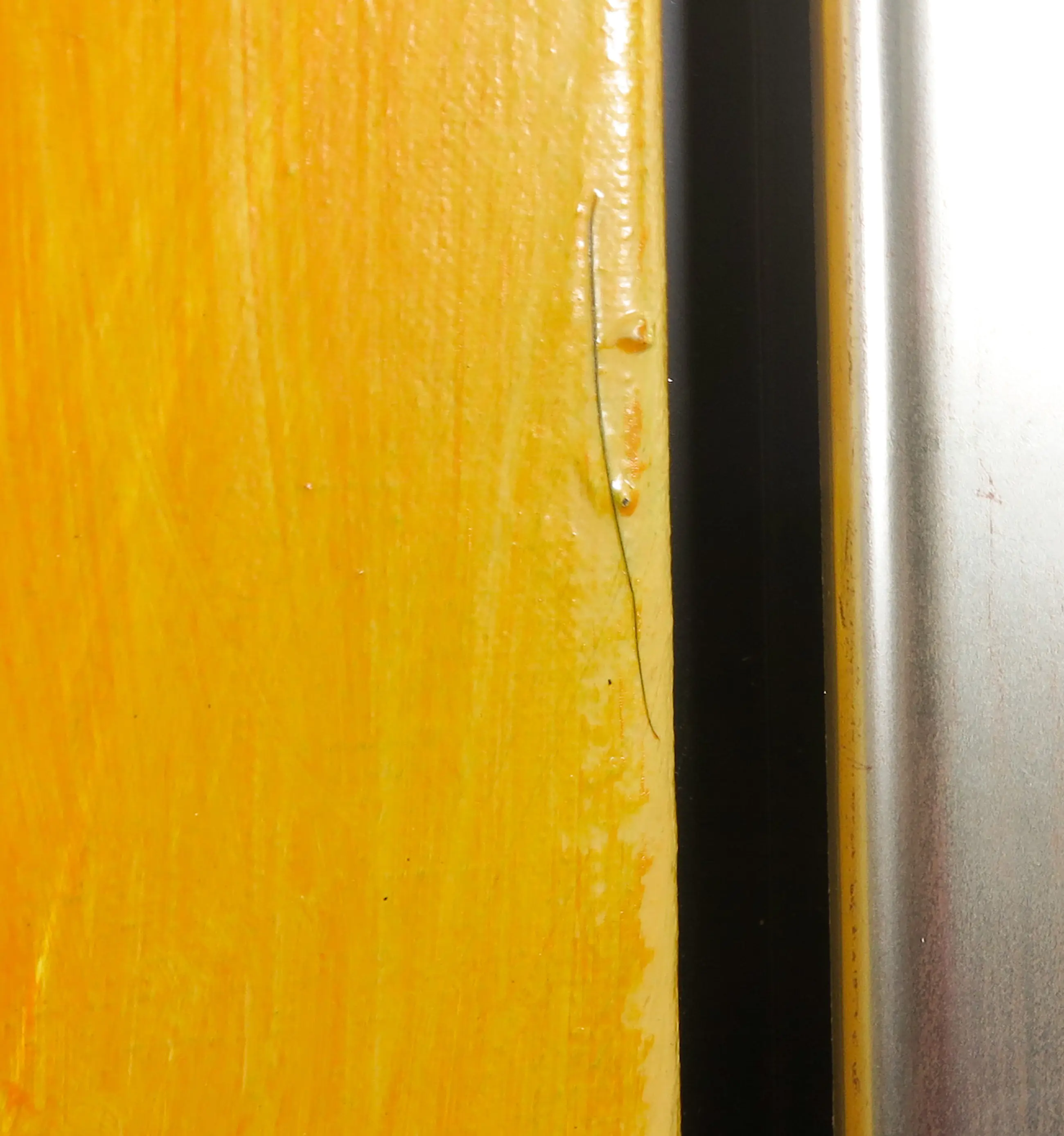 | Wat vlekjes links onderin de compositie, zoals op de detailfoto's is te zien. Daarnaast zijn er een haartje vast in de verflaag aan de rechterrand van de compositie. | |