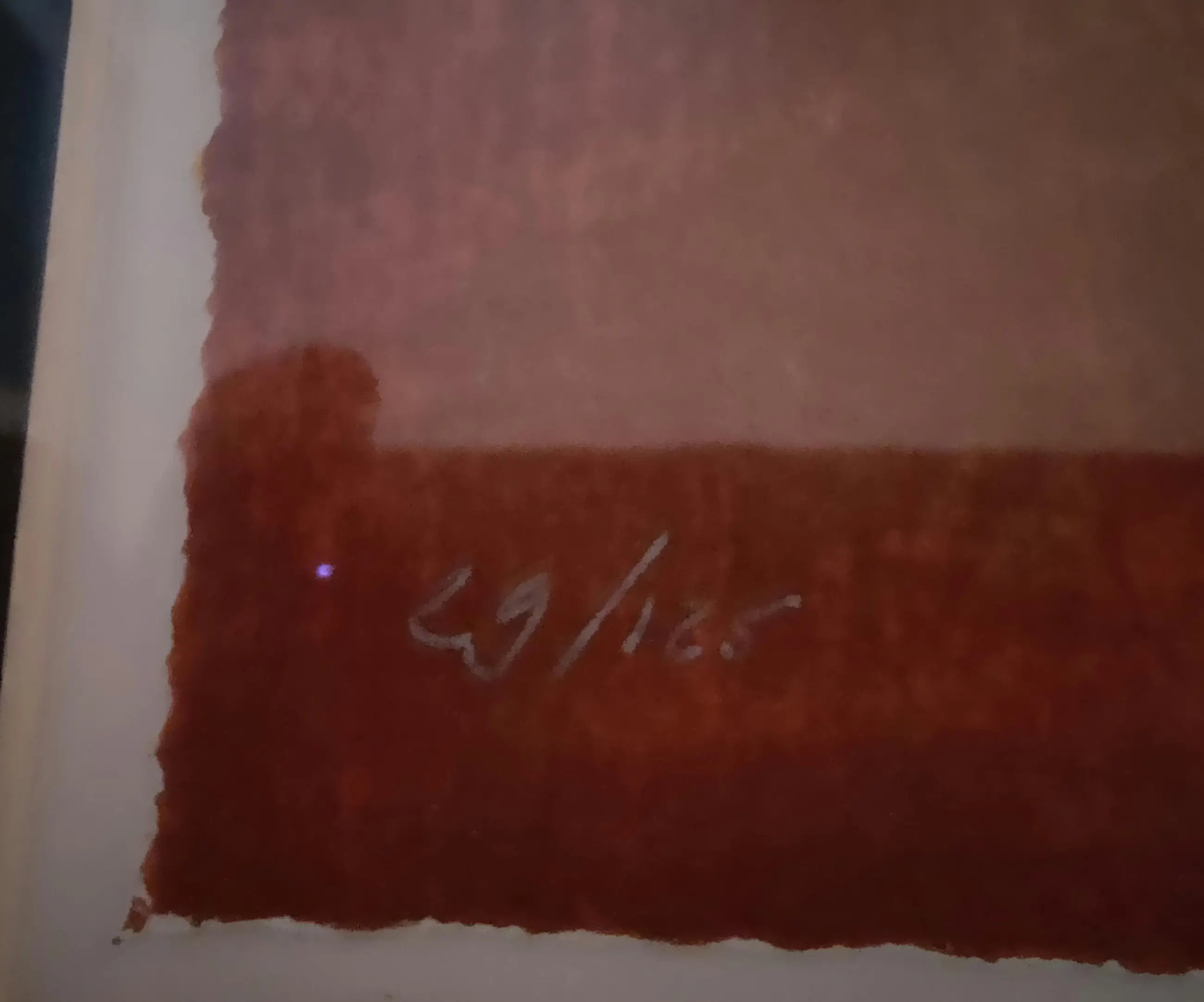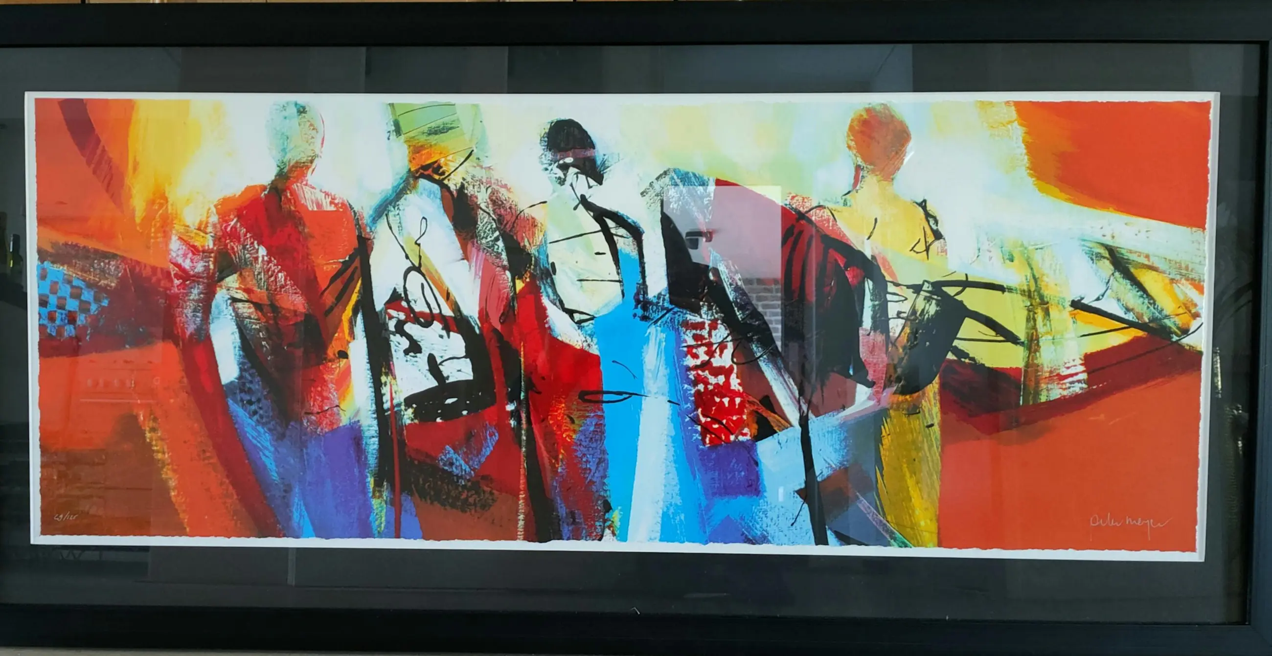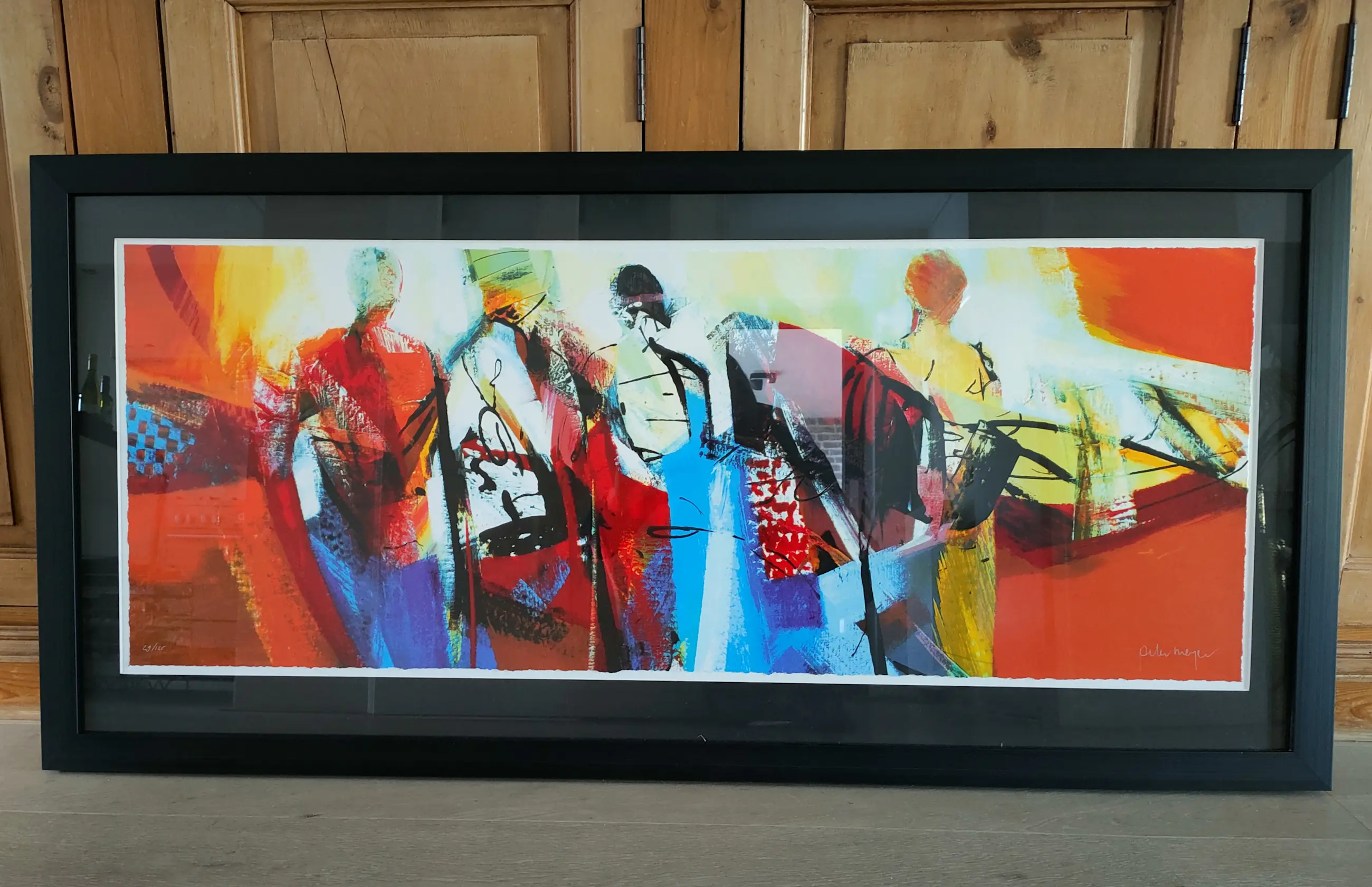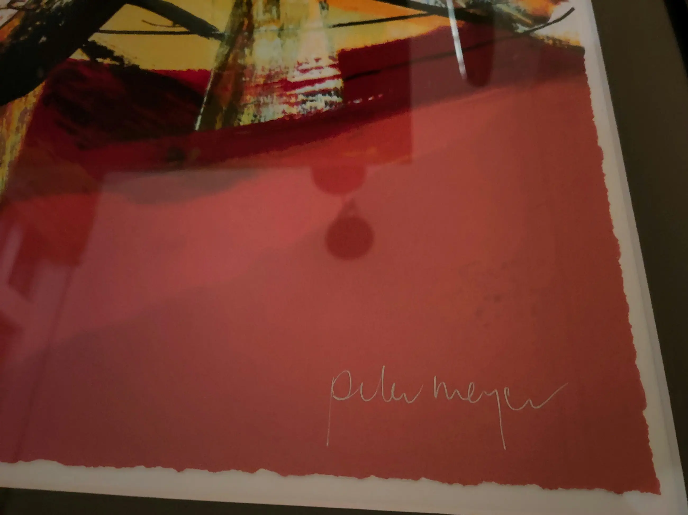 Zeefdruk van Peter Meijer, onder glas in een nieuwe zwarte houden lijst. (nieuwprijs €950,00 via de kunstuitleen)