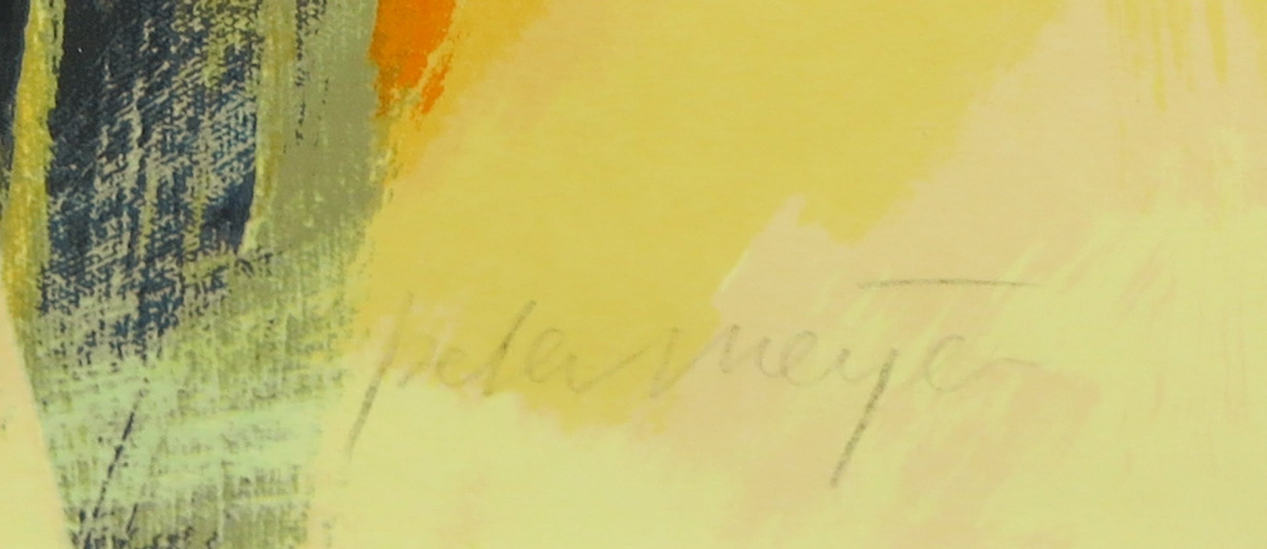 | Goede staat, maar er zit geen glas meer in de lijst. Lichte golving/krasjes in het passe-partout en blad, meerdere veegjes op het passe-partout. De aluminium lijst is op de hoeken wat beschadigd/gebogen. | |