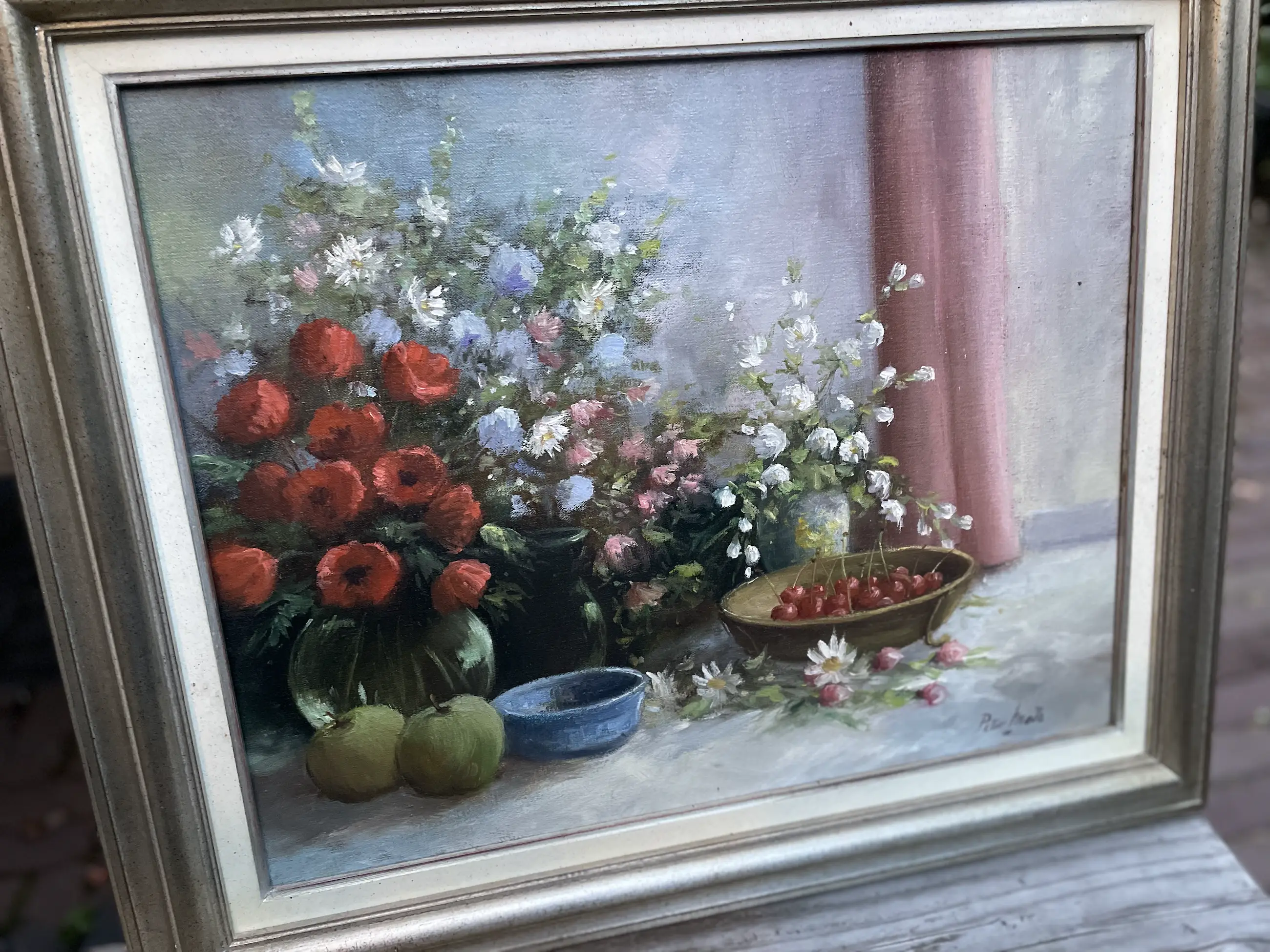 Dit rustieke stilleven van een zomers veldboeket met gipskruit en rode ranonkels heeft een ingetogen en klassiek karakter. Het doek heeft een prachtige houten lijst en is in goede staat.