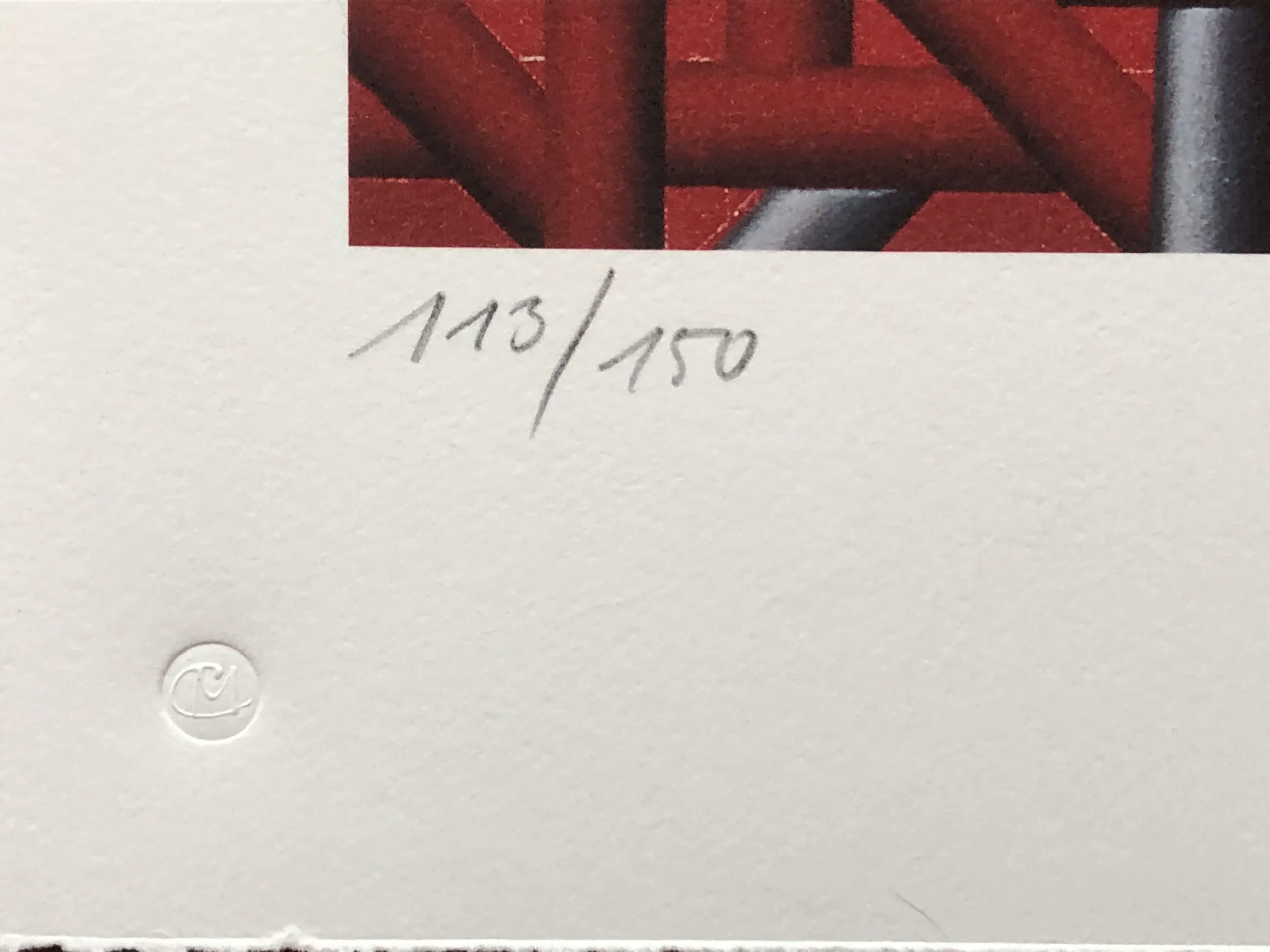 Prachtige afbeelding in nieuwstaat (niet ingelijst). Gemengde techniek van 6 panelen gebaseerd op een ontwerp van de kunstenaar. Het drukken vond plaats in de werkplaats voor kunstlithografie van Christian Müller in Leipzig. Oplage: 150. Motiefformaat 50 x 50 cm. Bladformaat 56 x 59,5 cm.