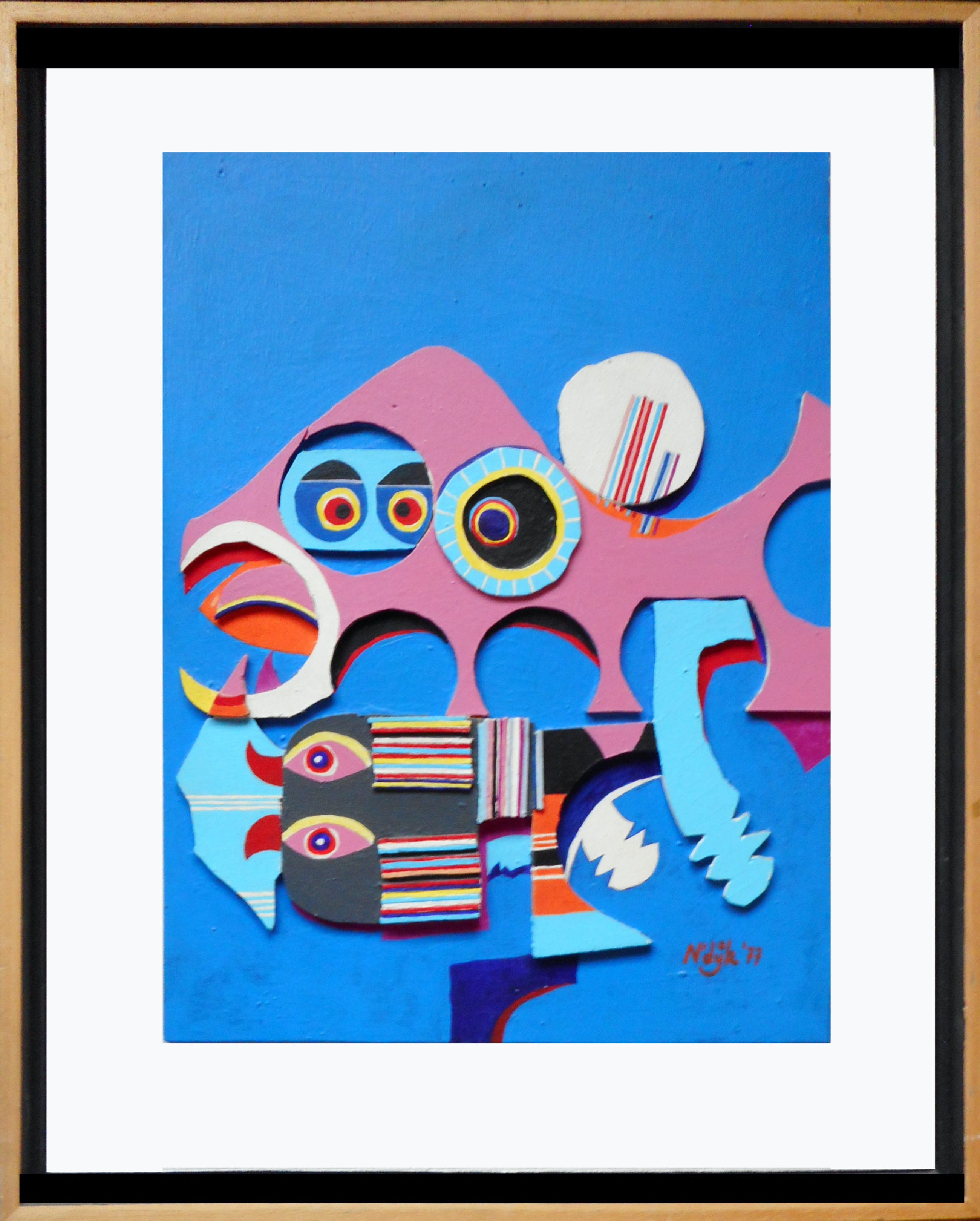 beschilderd houtreliëf uit jaren 70 van post cobra schilder Nieuwendijk in baklijst, hangklaar