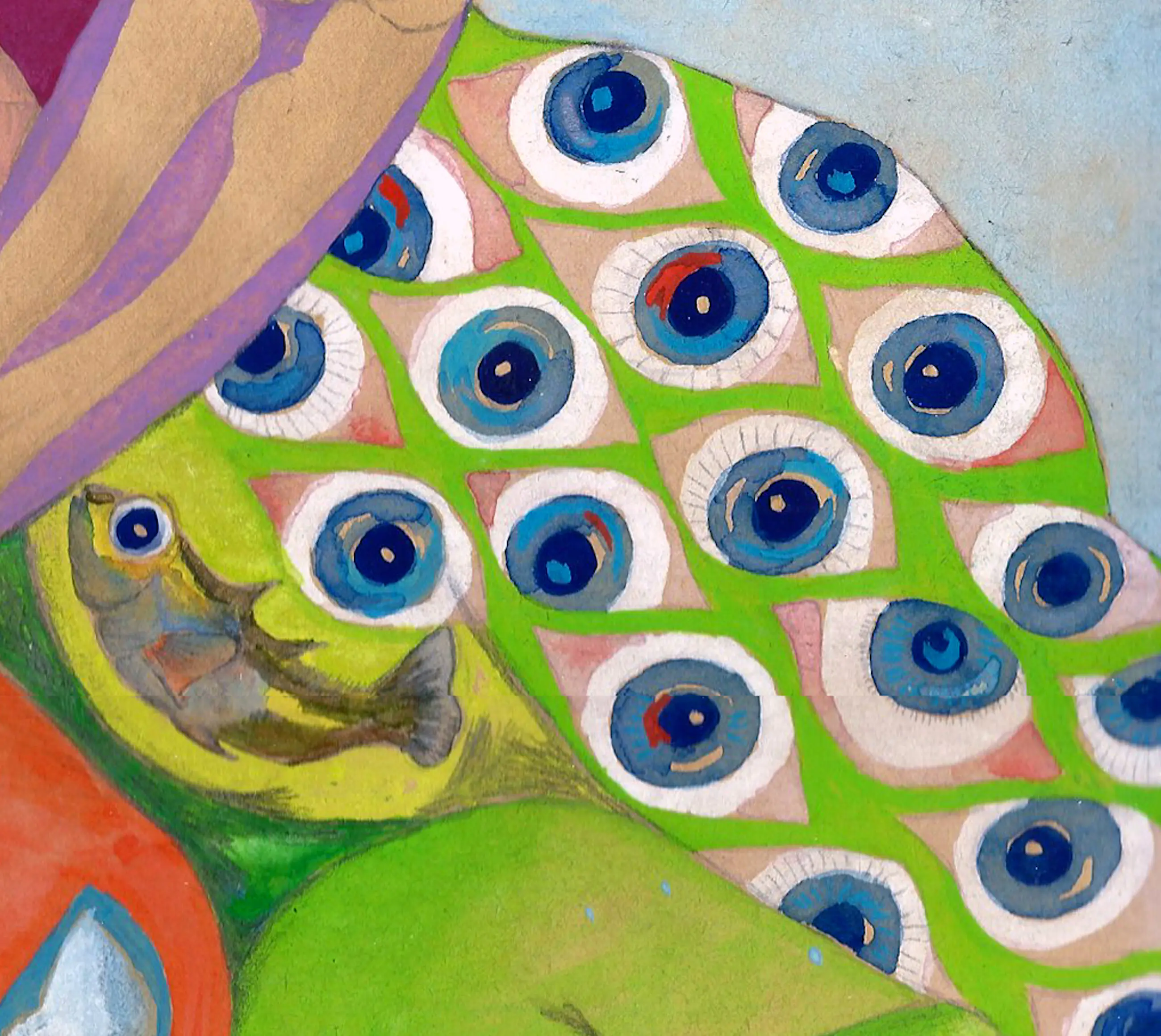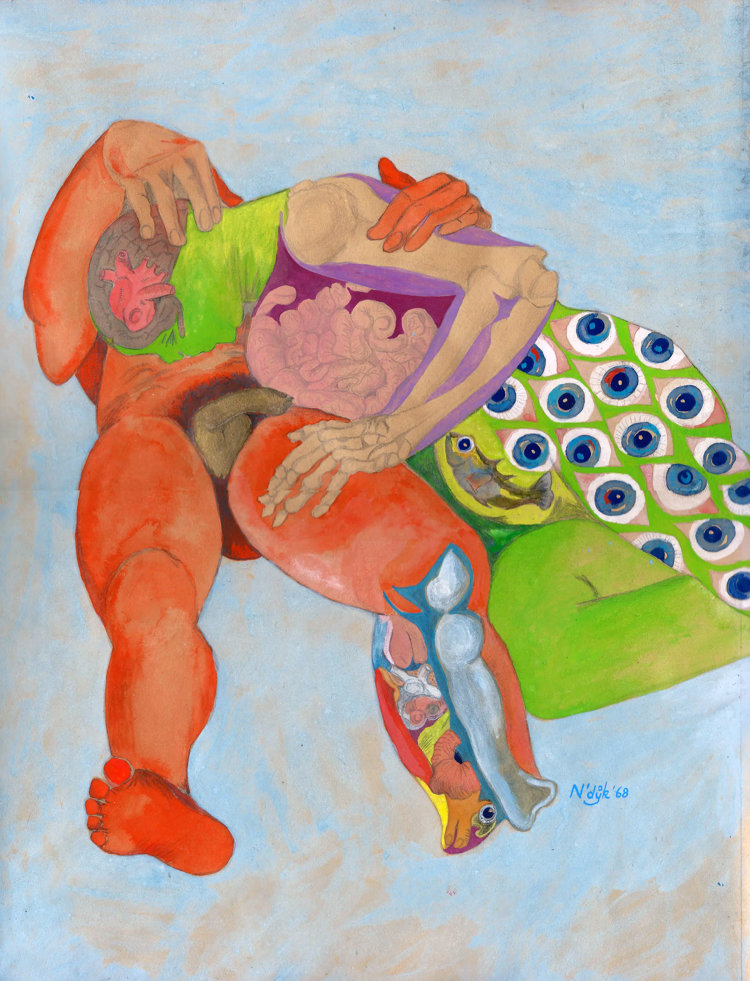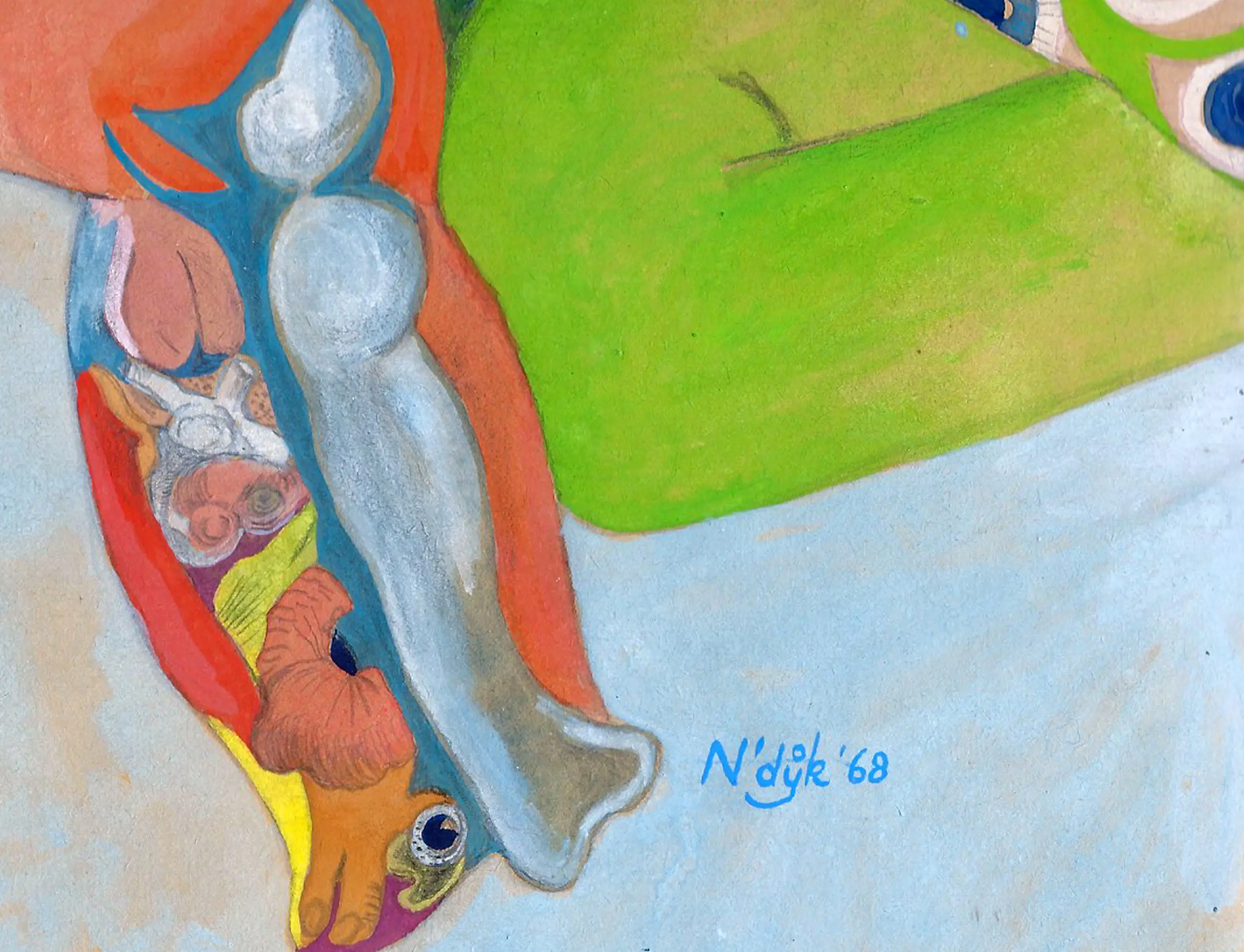 een jeugdwerk van de bijna 80 jarige kunstenaar op de achterzijde van behang beschilderd