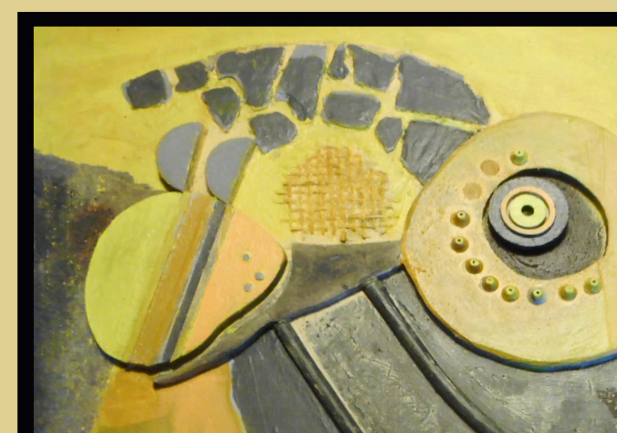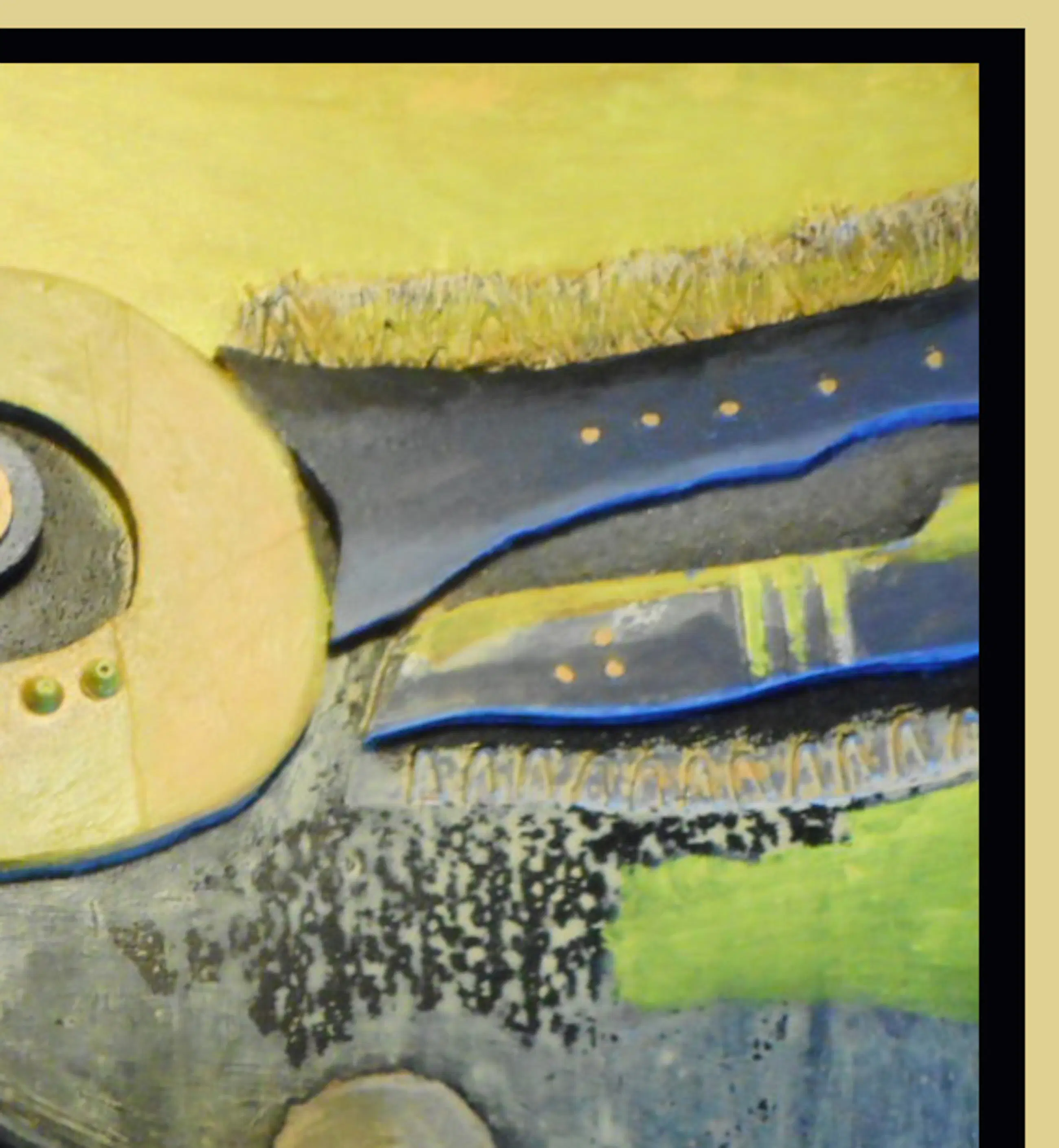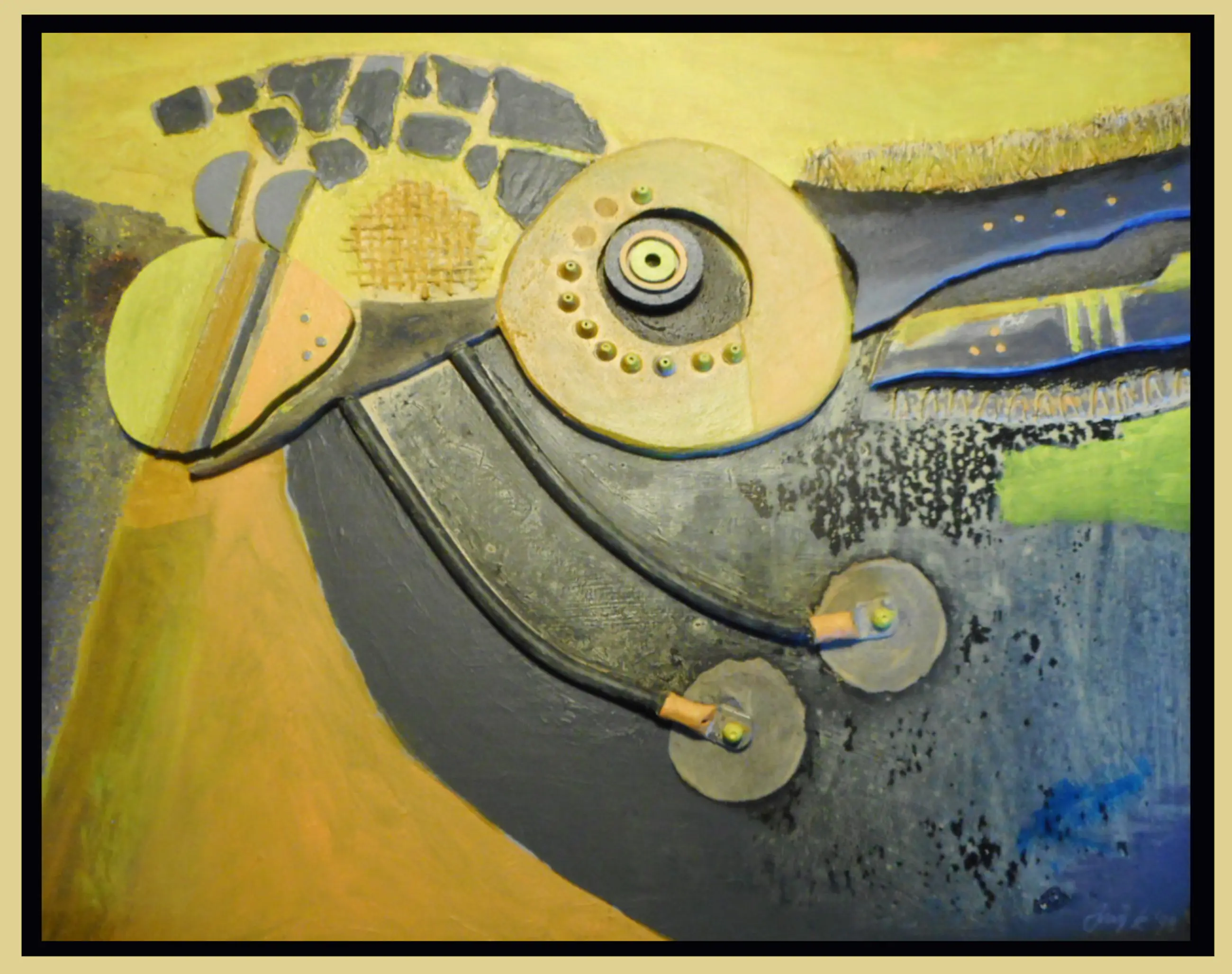 Materieschilderij op paneel met acrylverf hou steen papier etc. "Homage aan Jaap Wagemaker". Uit de serie Landschappen.