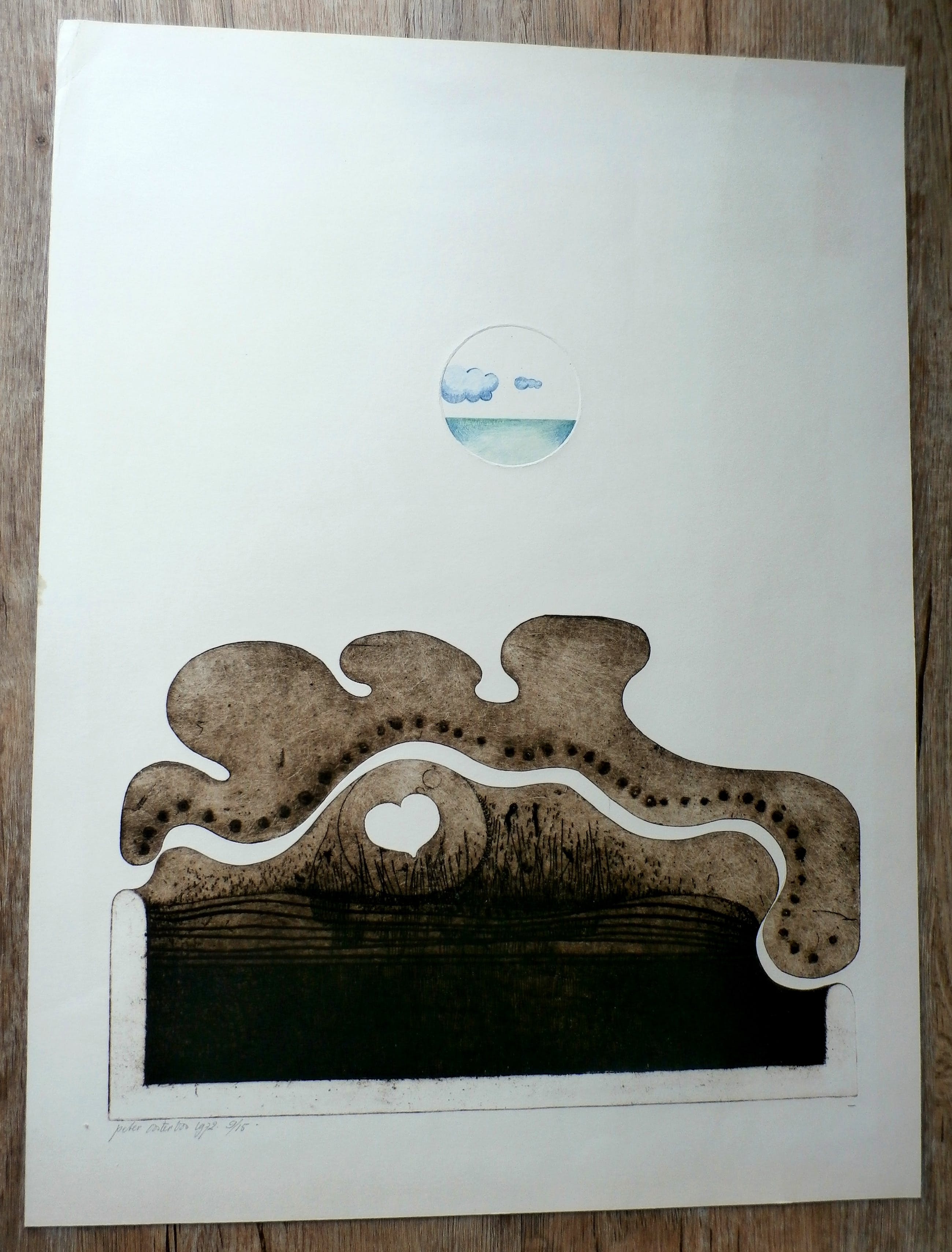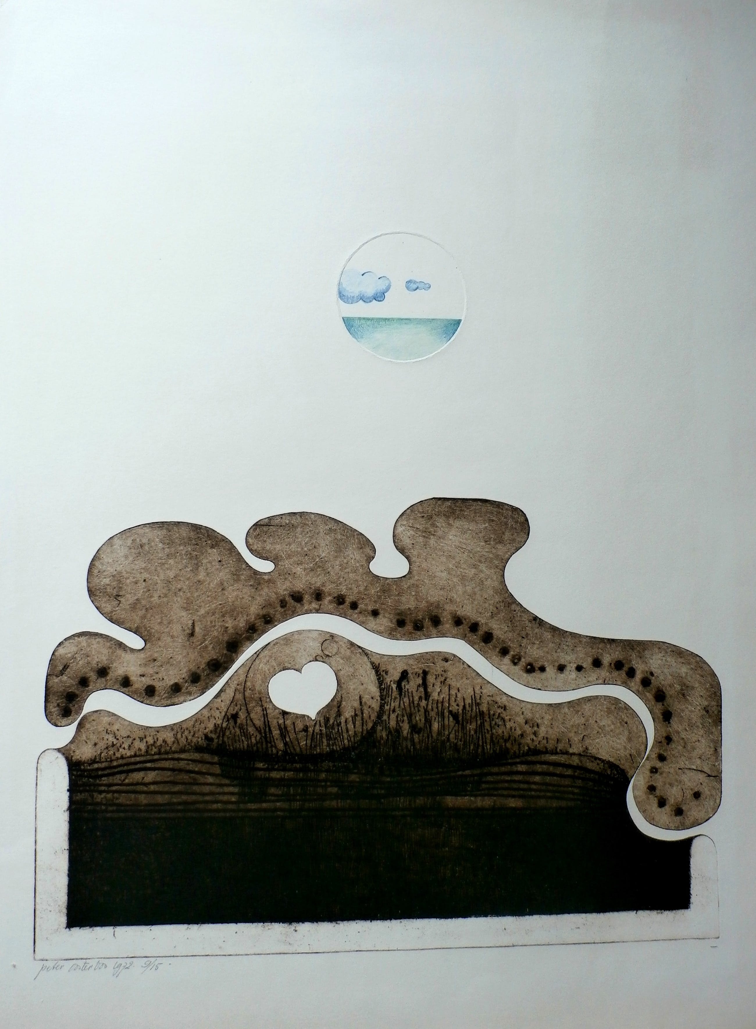 Ets van Peter Oosterbos. Jaar: 1972. Nummer: 9/15. Afmetingen blad: H62 x b47 cm. Afmetingen voorstelling: H42 x b40 cm. Het werk is linksonderin , met potlood, gesigneerd door de kunstenaar.