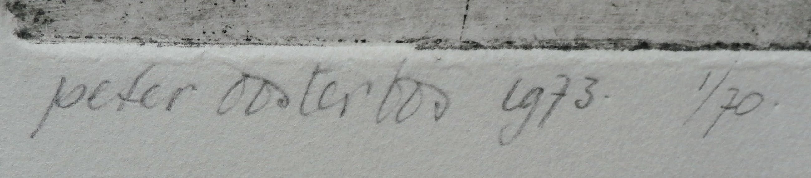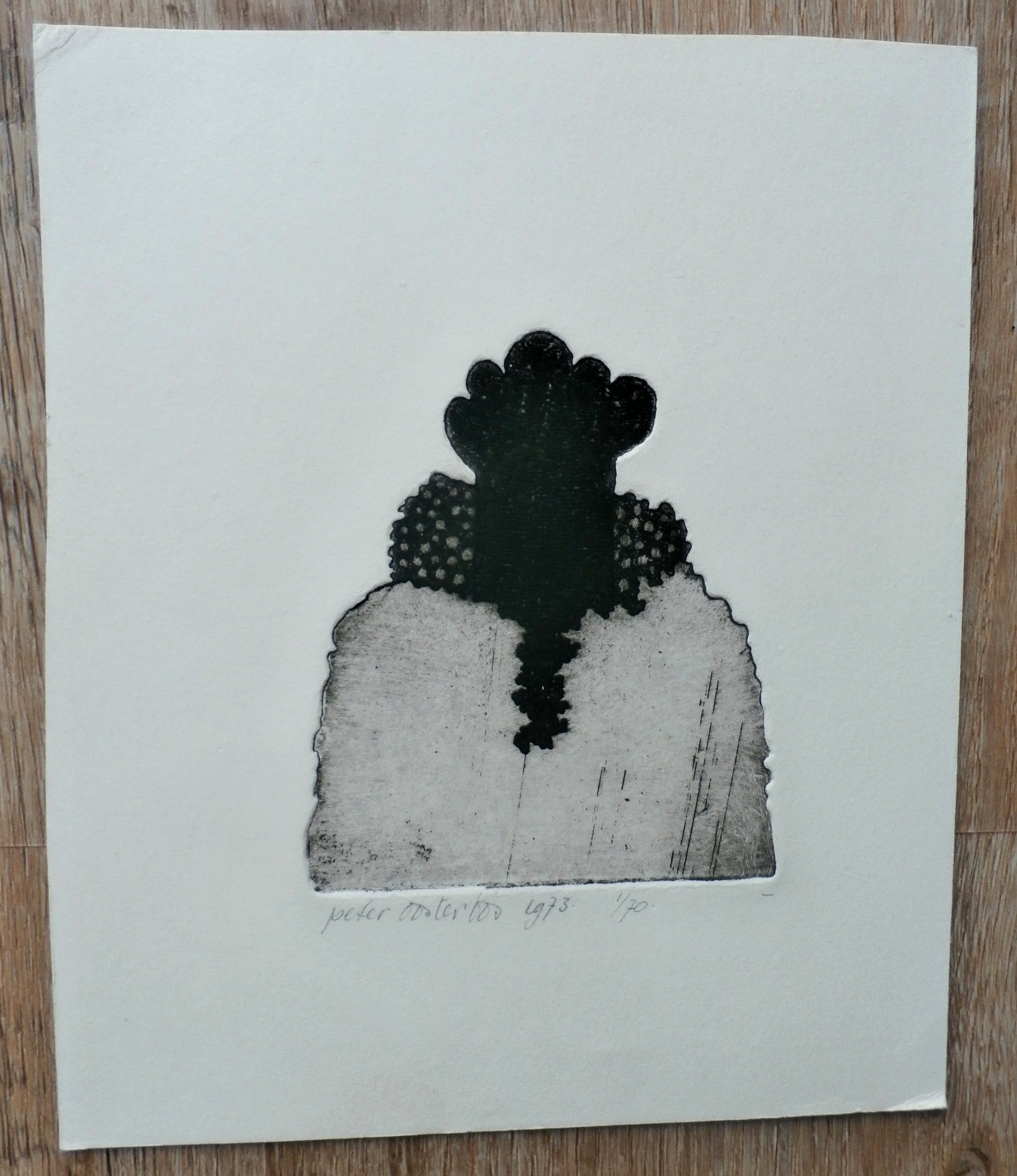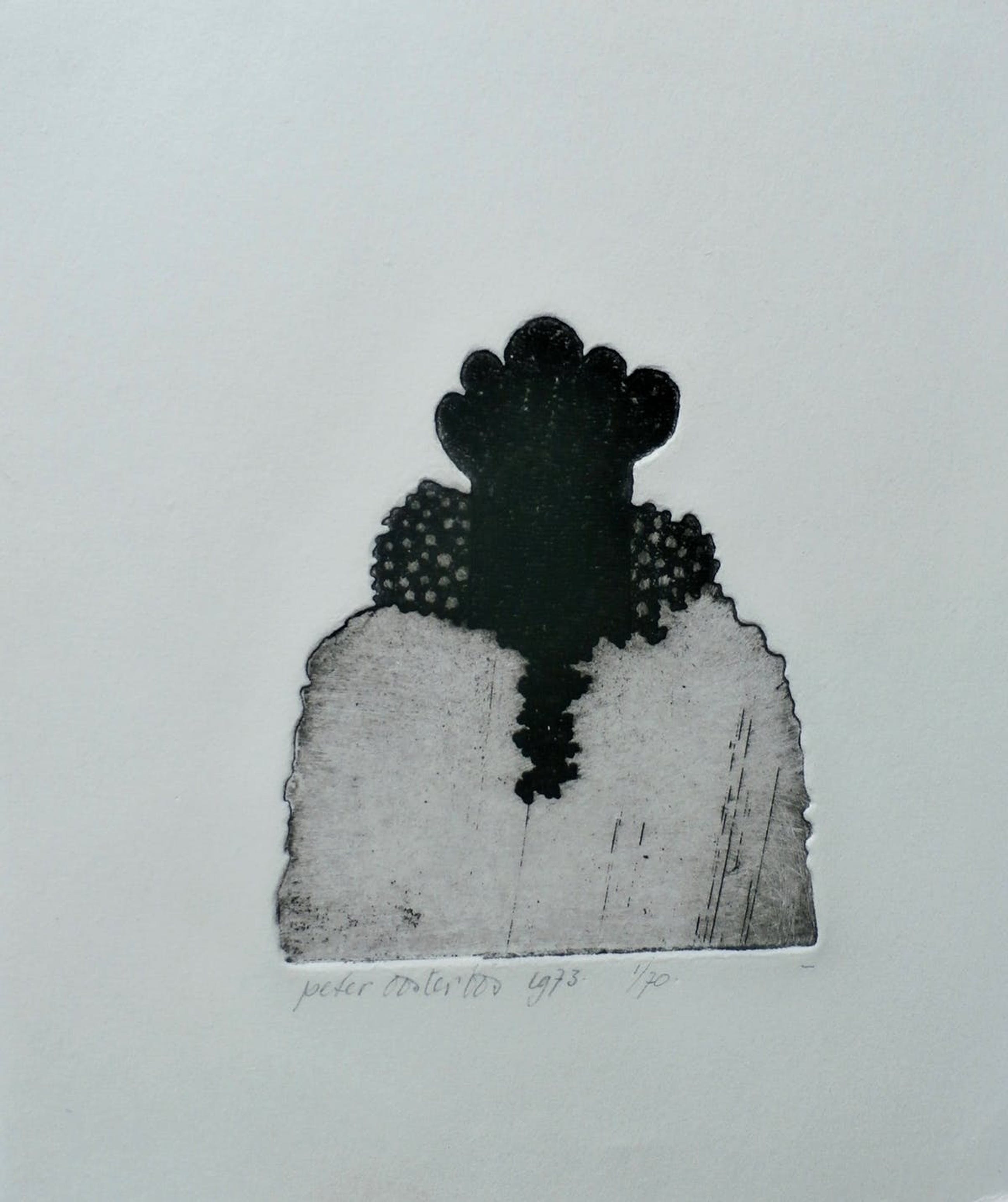 Ets van Peter Oosterbos. Jaar: 1973. Nummer: 1/70. Afmetingen blad: H19 x b16 cm. Afmetingen voorstelling: H10 x b9 cm. Het werk is, met potlood, gesigneerd door de kunstenaar.