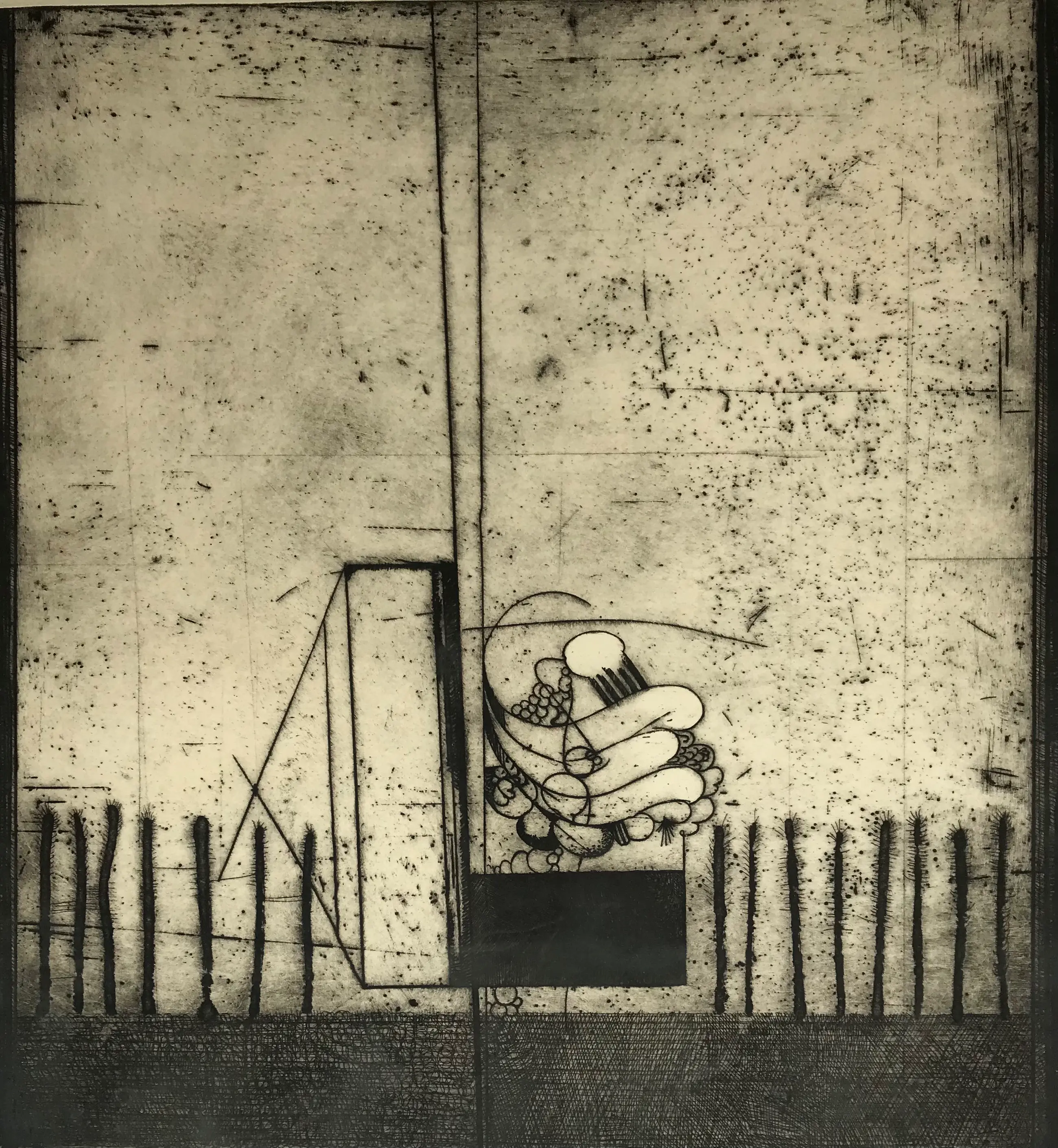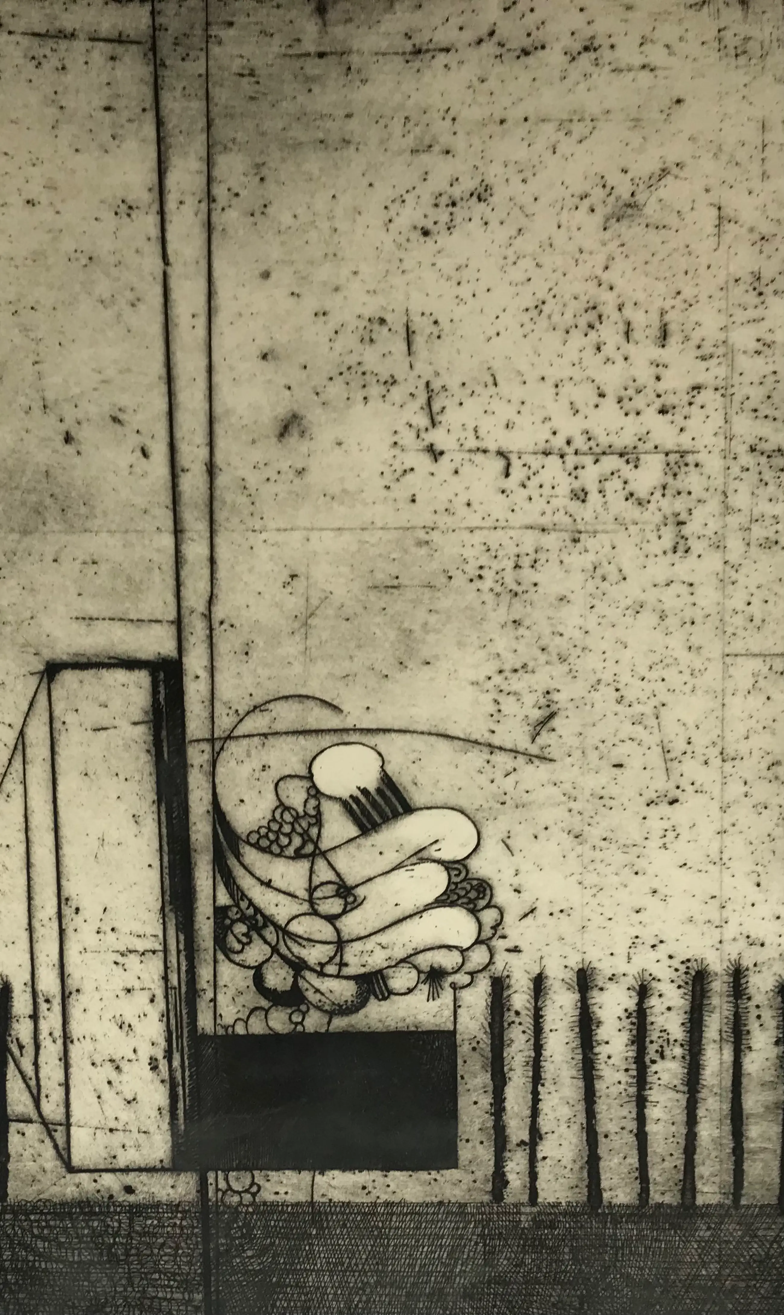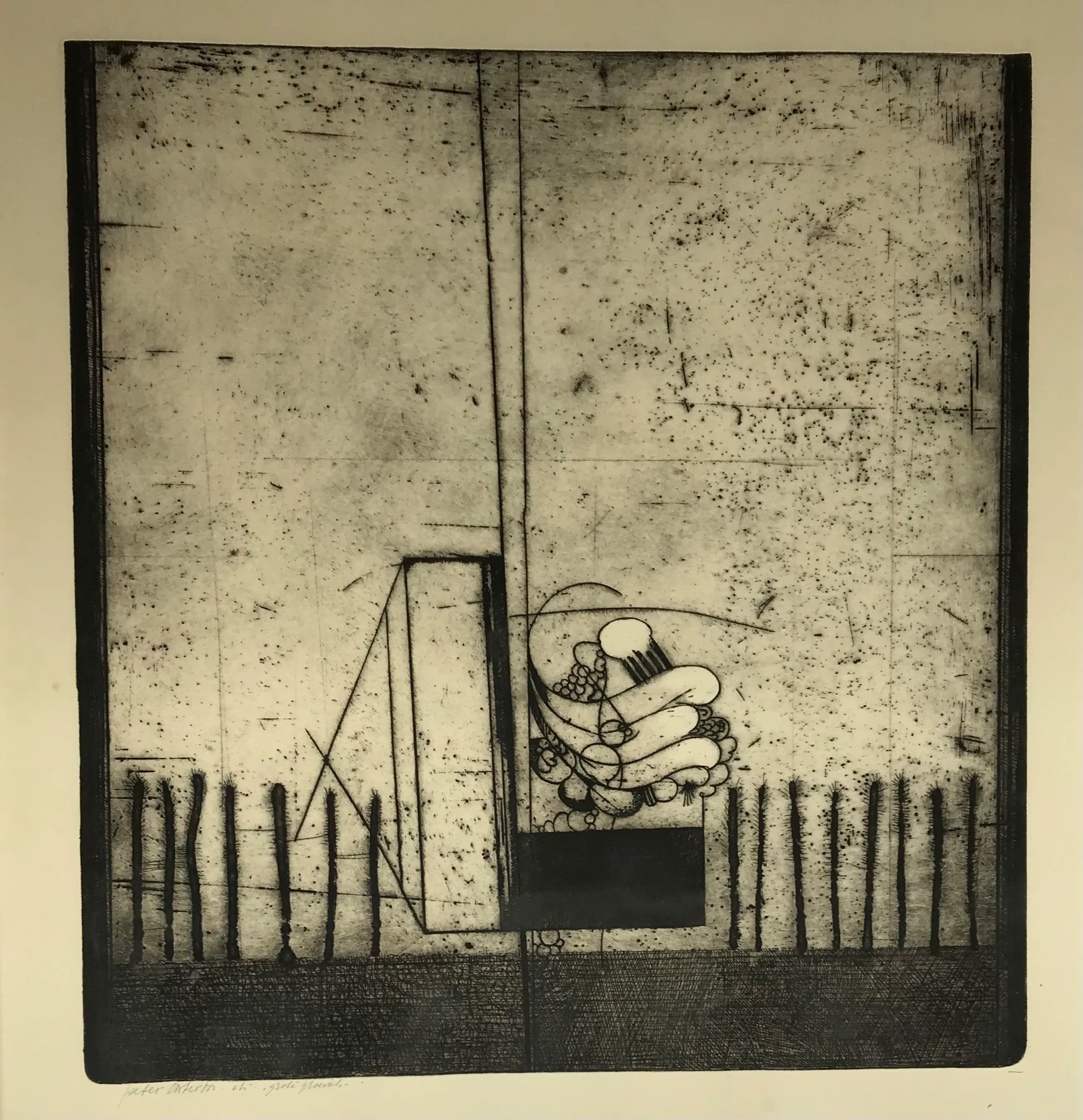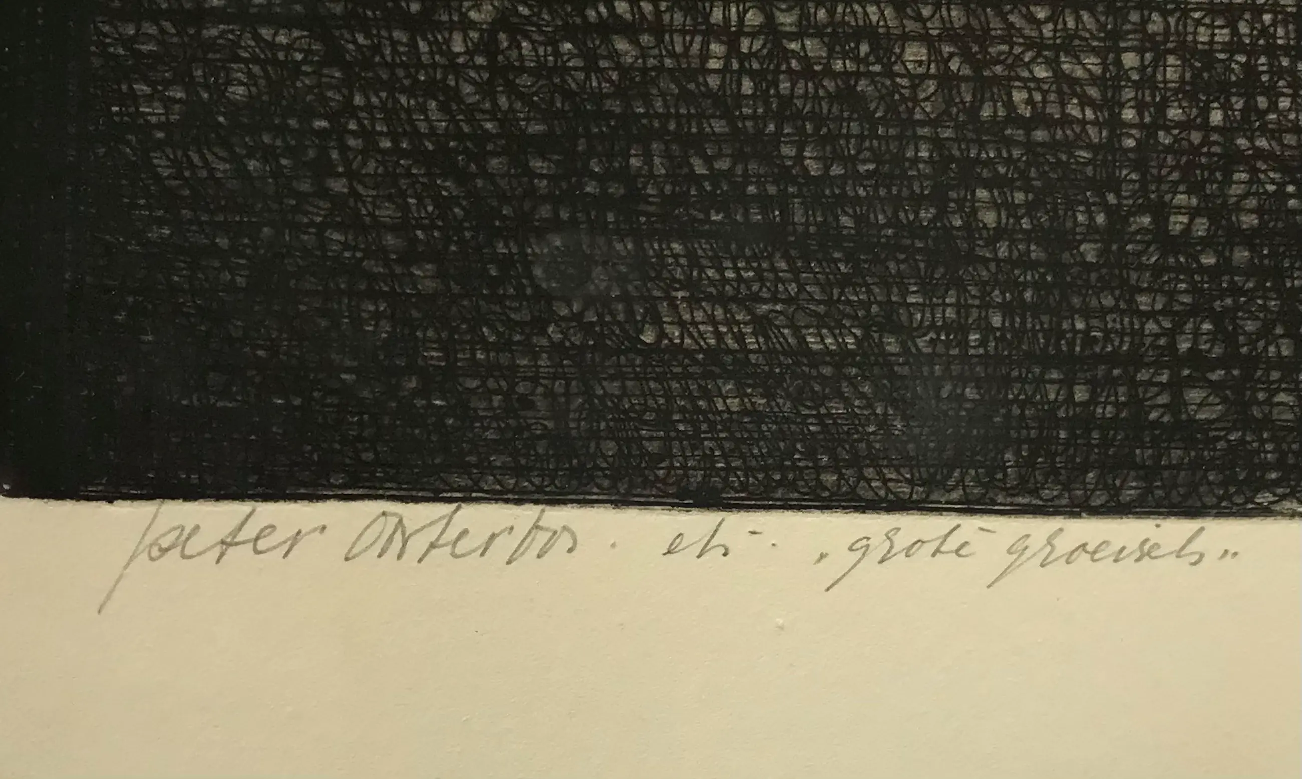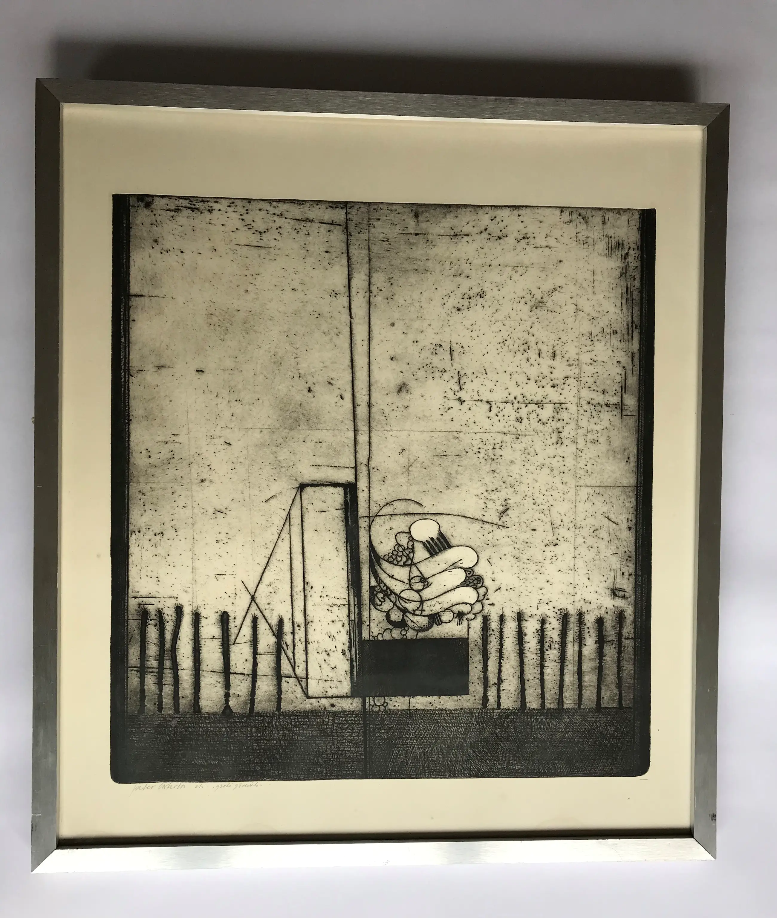 In en een zilverkleurige aluminium lijst onder glas ingelijste ets van Peter Oosterbos. Hand gesigneerd in potlood, titel en ets is bijgeschreven. Onderin in het kader (dus ruim van de ets zelf) zitten vage vlekken. Bij het plaatsen van een passe- partout valt dit geheel weg.