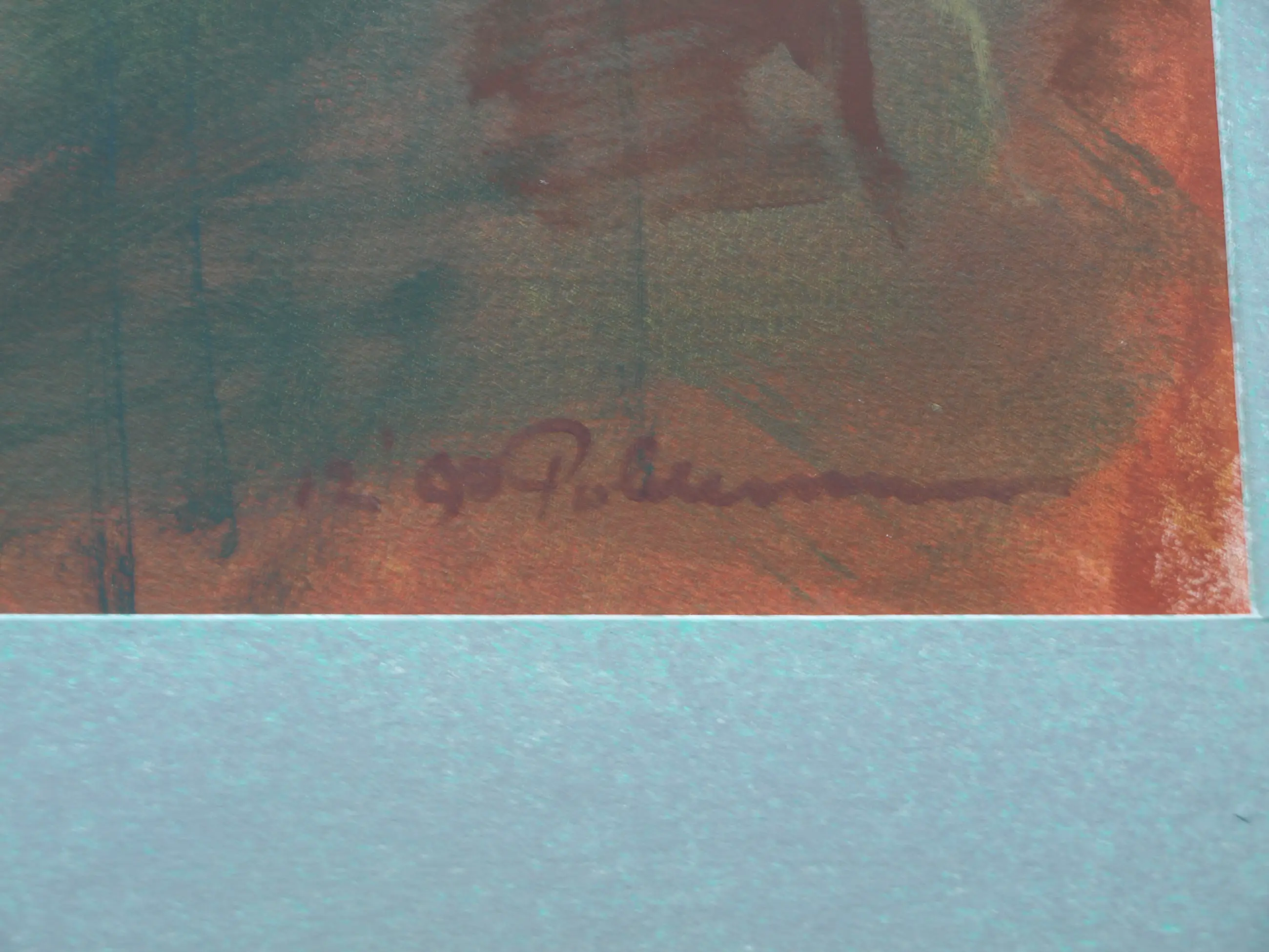 Een groot ingelijst schilderij uit 1990 van de Nederlandse kunstenaar Peter Polderman (1933-1998). -Gesigneerd en gedateerd rechtsonder. -Ingelijst in een houten lijst met passe-partout en glasplaat. Klaar om op te hangen. -Afmetingen: Lijst, 78 x 97 x 2 cm. Beeld, 49 x 69 cm. -Herkomst: Uit een inboedel. -Conditie: In zeer goede staat. De houten lijst heeft slijtplekjes. Zie ook de foto’s voor een eigen indruk. Kan zo aan de muur.