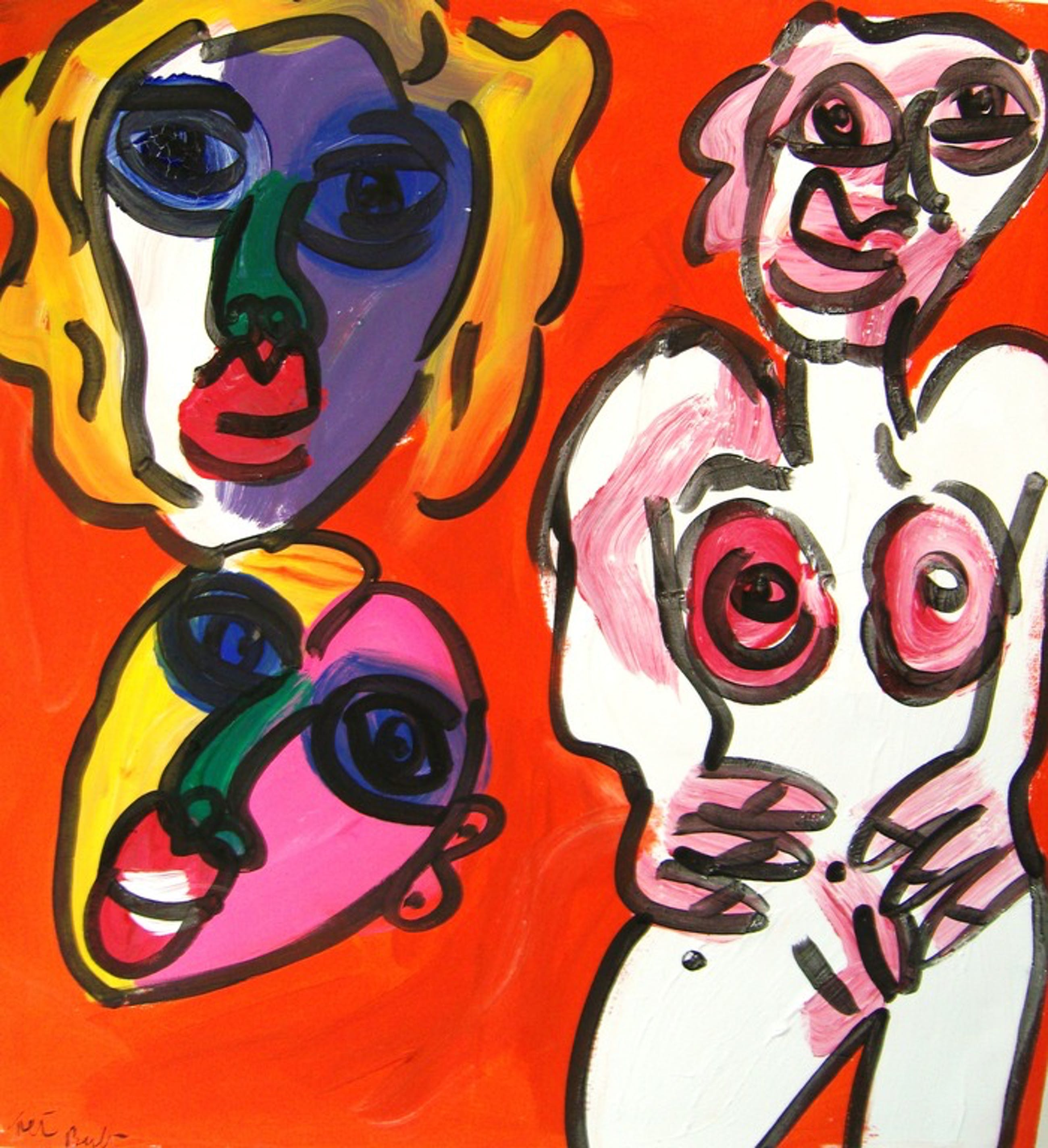 2 grote kleurrijke gezichten en 1 naakt. Door de zeer dikke verf een beetje craquelé op 1 van de ogen,vandaar de lagere inzet.( zie foto 4.) Eén van zijn mooiere werken!