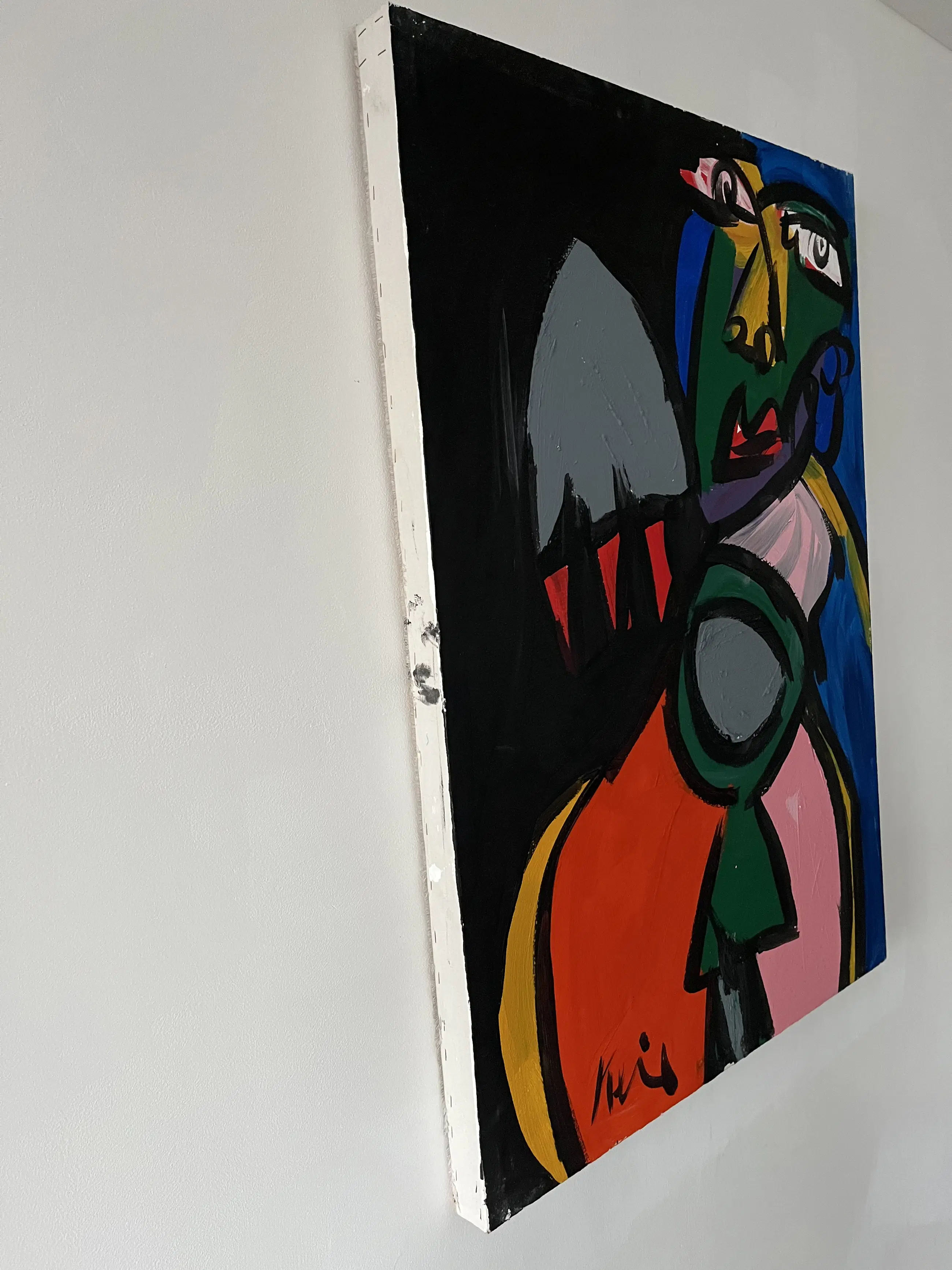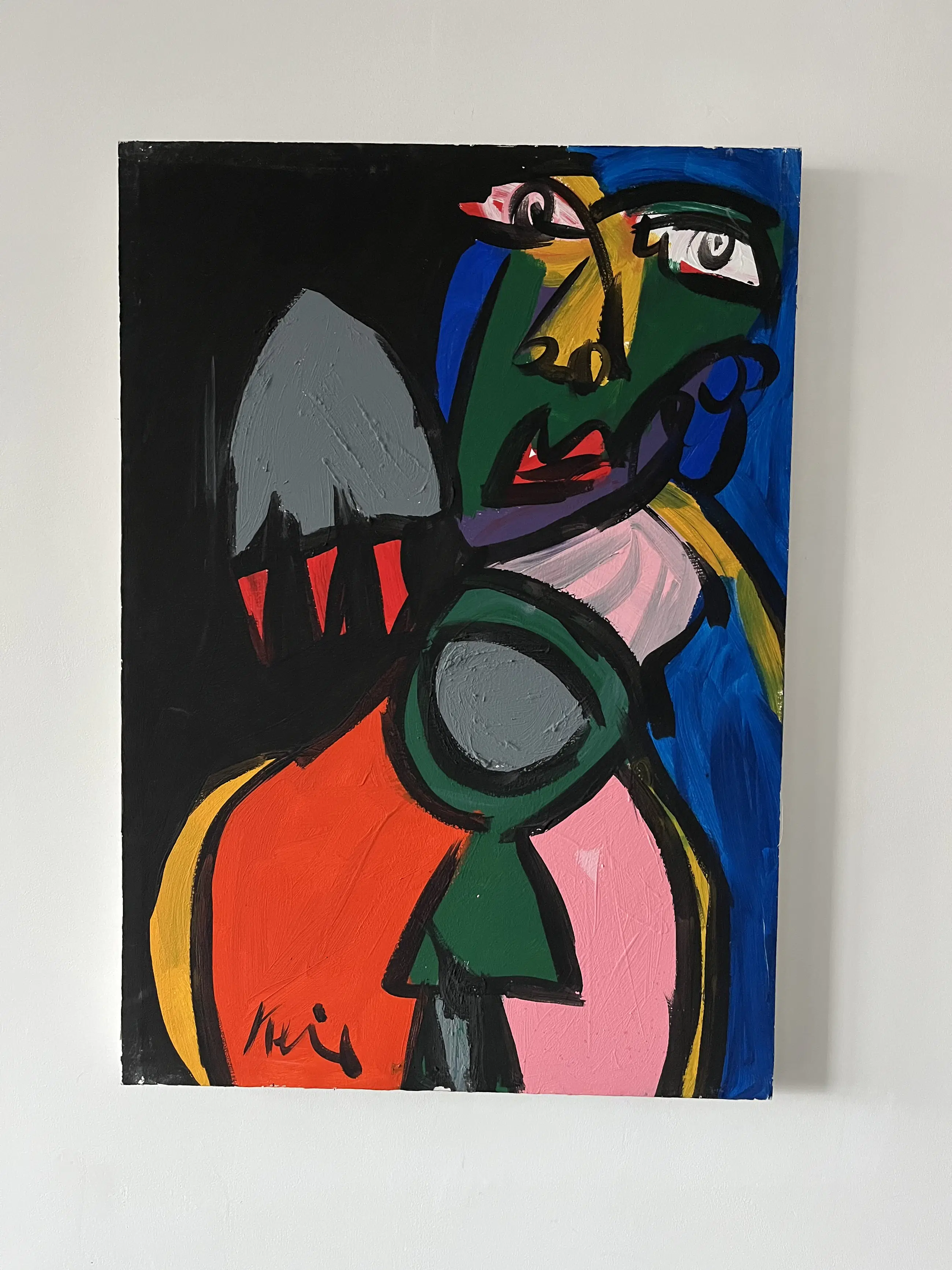 Dit typische Peter Keil schilderij toont een gefragmenteerd gezicht/figuur in krachtige kleuren — groen, blauw, oranje, geel en roze — op een zwarte achtergrond. Gesigneerd door de kunstenaar linksonder.