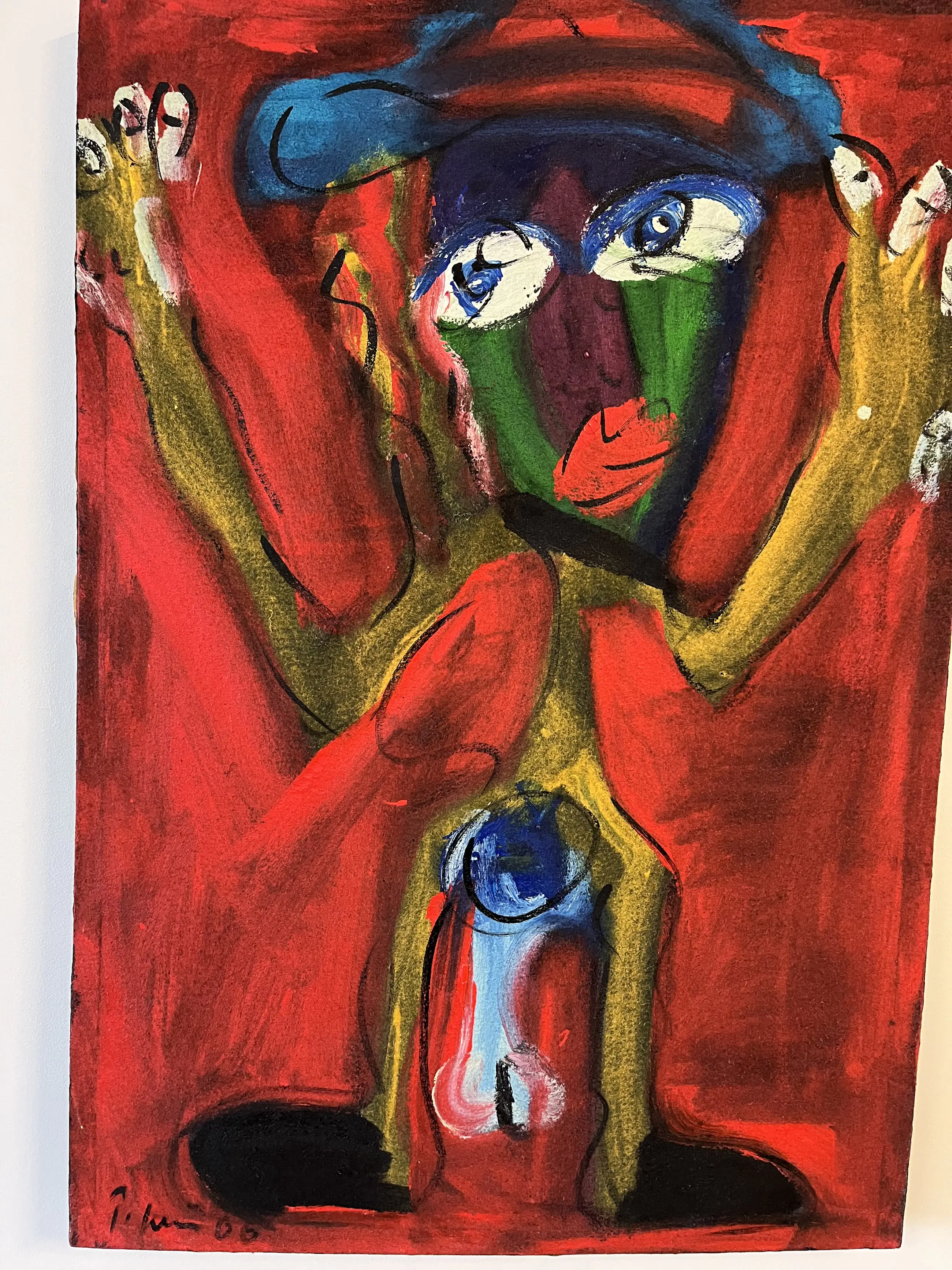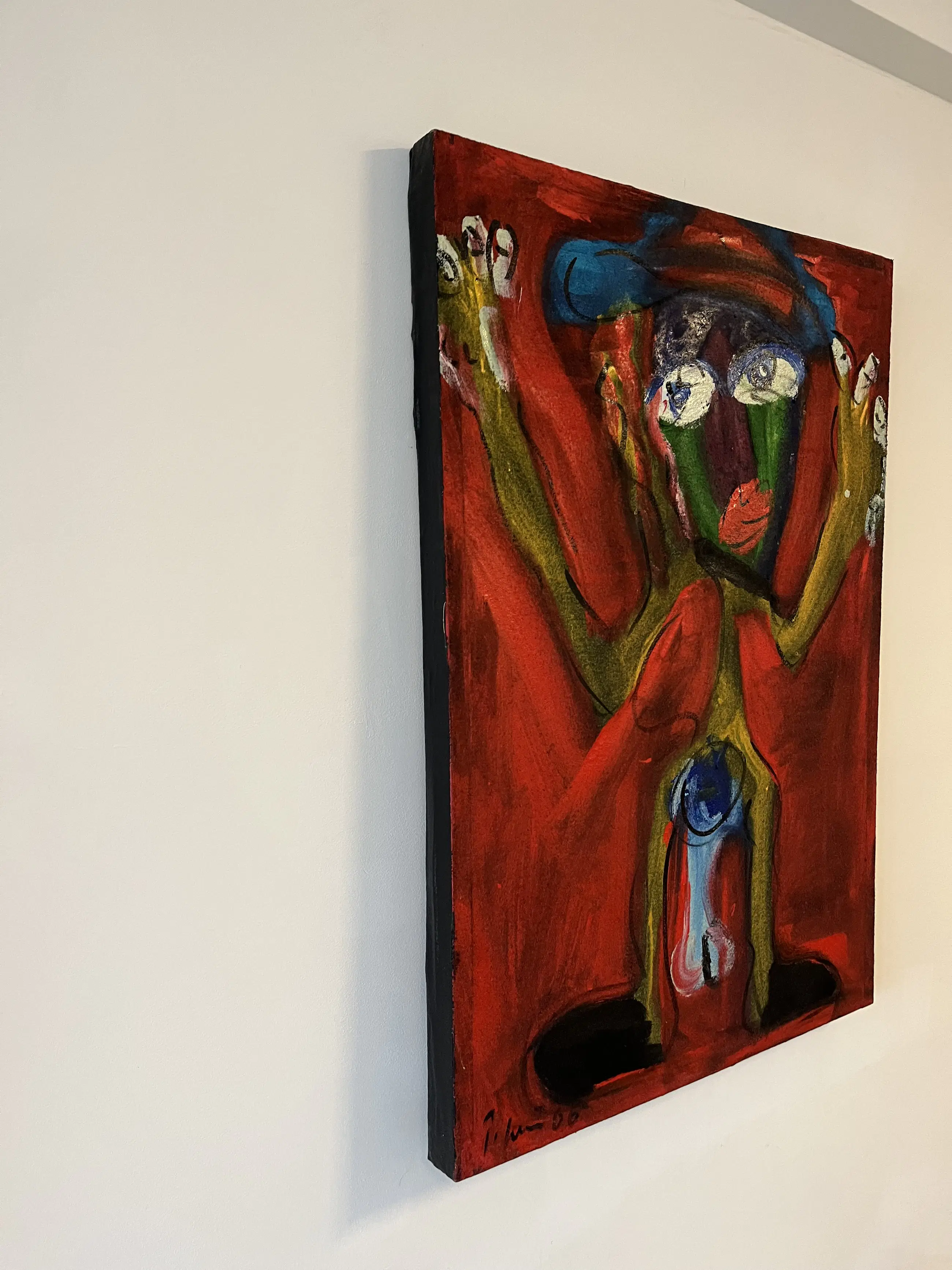 Kleurrijk en krachtig werk van de bekende neo‑expressionistische kunstenaar Peter Robert Keil. Het schilderij toont een expressieve figuur met intense kleuren en een losse, energieke penseelvoering. Typisch voor Keils herkenbare stijl en sterke emotionele uitstraling. Gesigneerd linksonder. Een opvallend en decoratief werk dat direct de aandacht trekt.