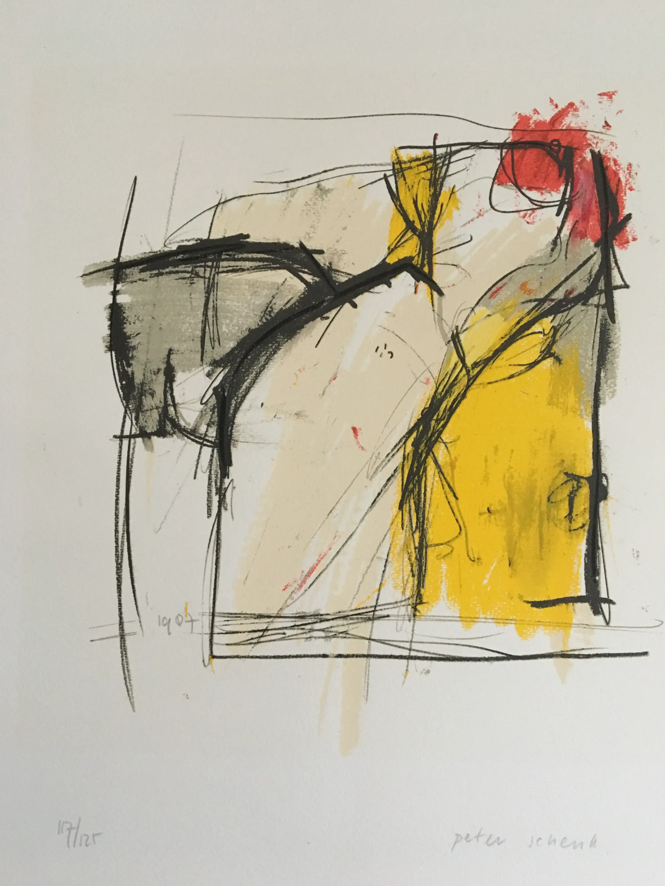 Ingelijste abstracte litho van Peter Schenk uit 1987. Nummer: 117/125. Jaar: 1987. Afmetingen incl. lijst: H 50 x b40 cm. Conditie: in goede staat.