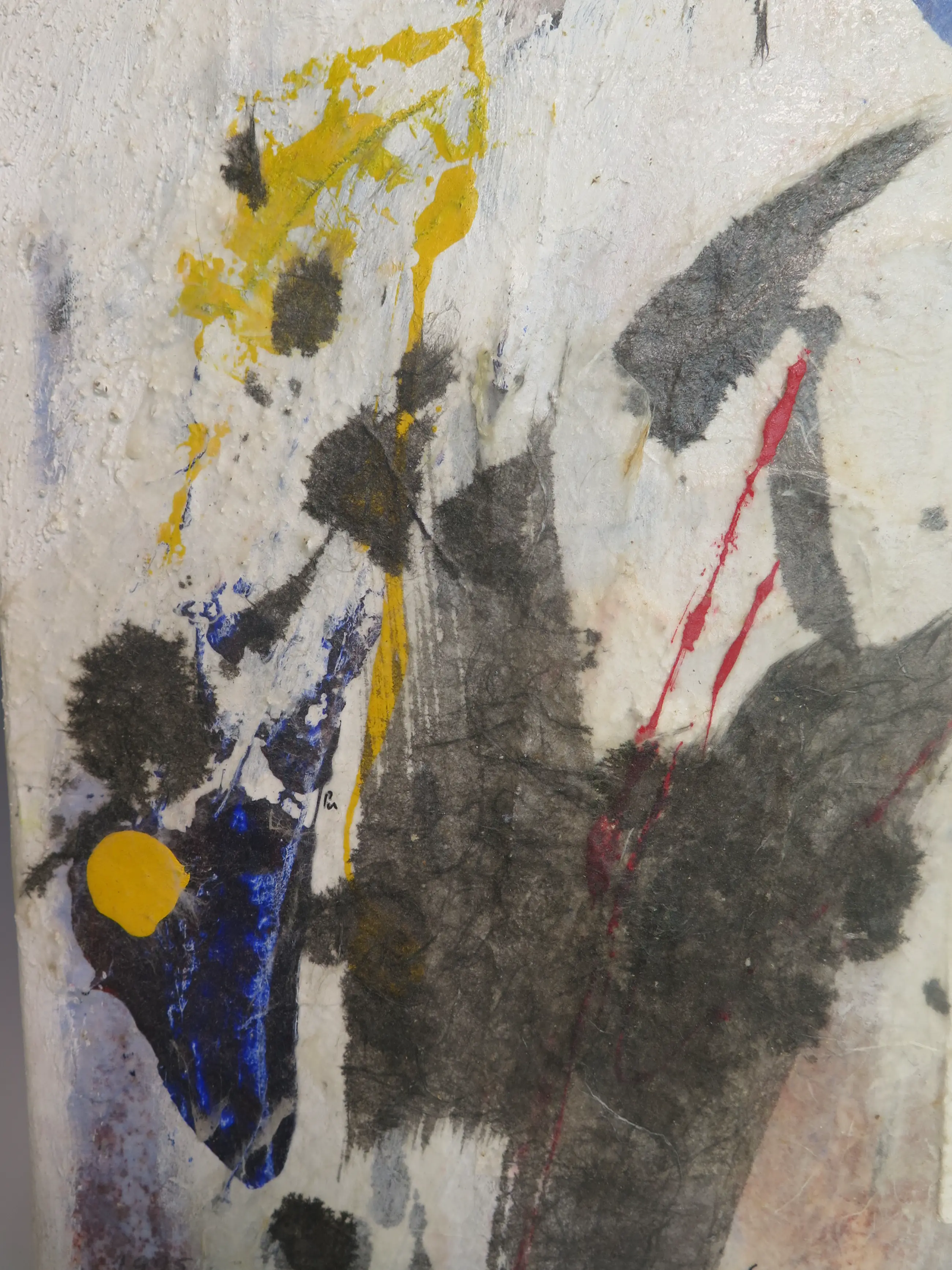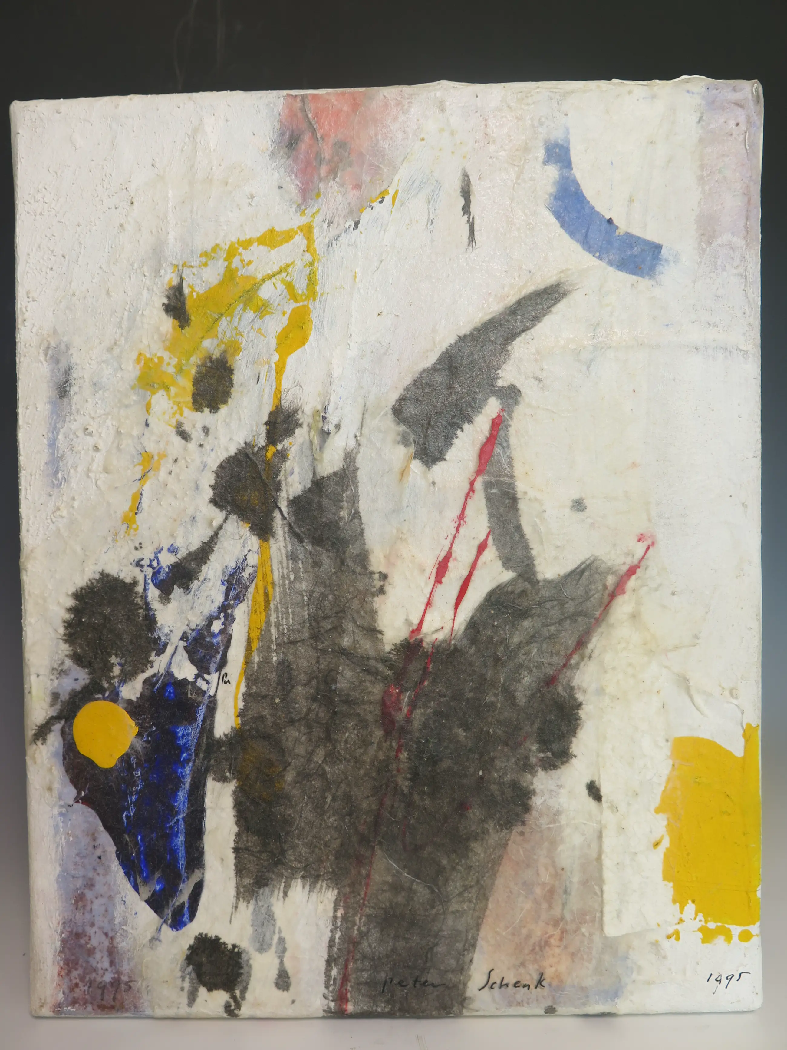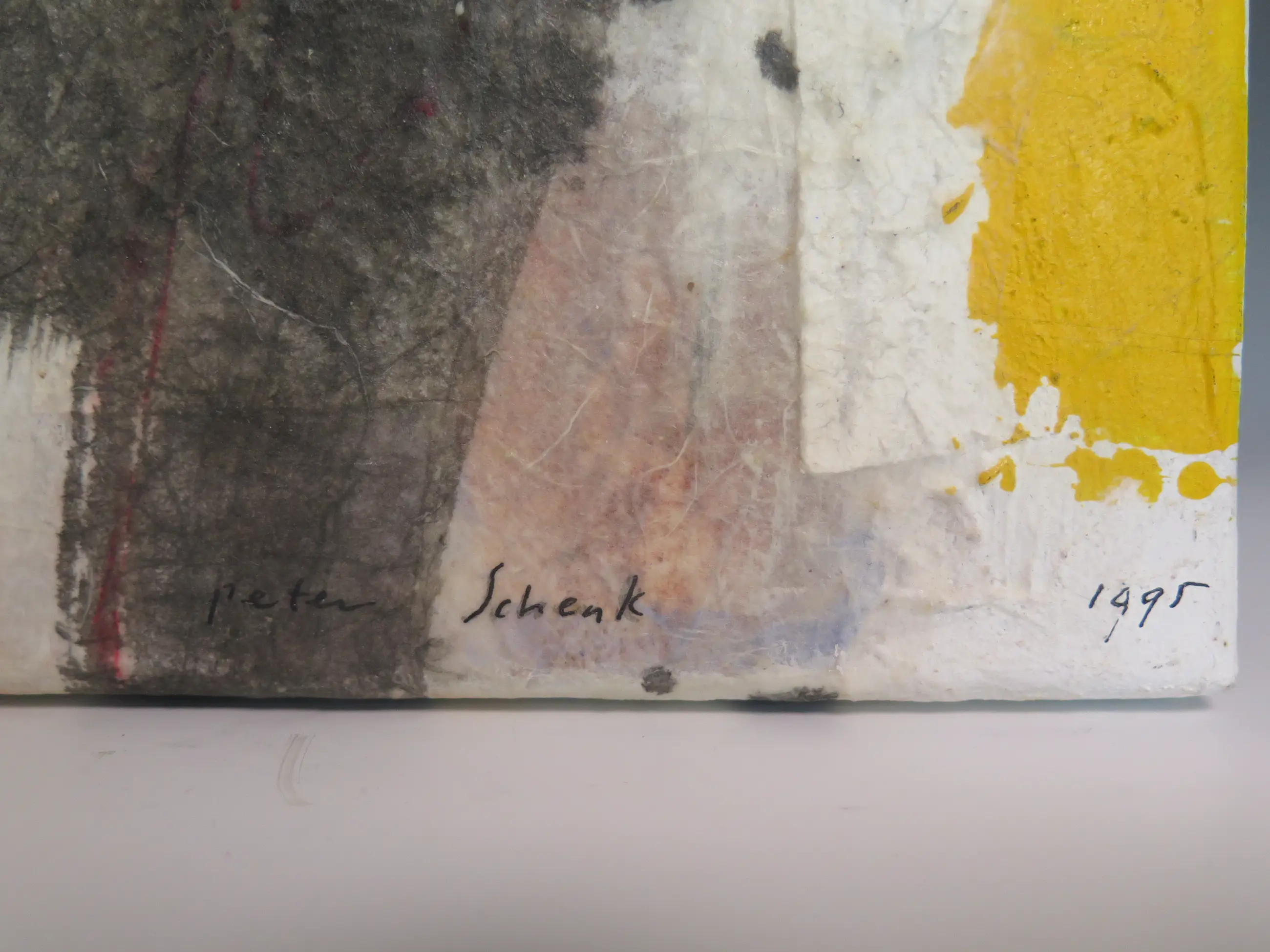 Schilderij door Peter Schenk, gemengde techniek en collage op doek.