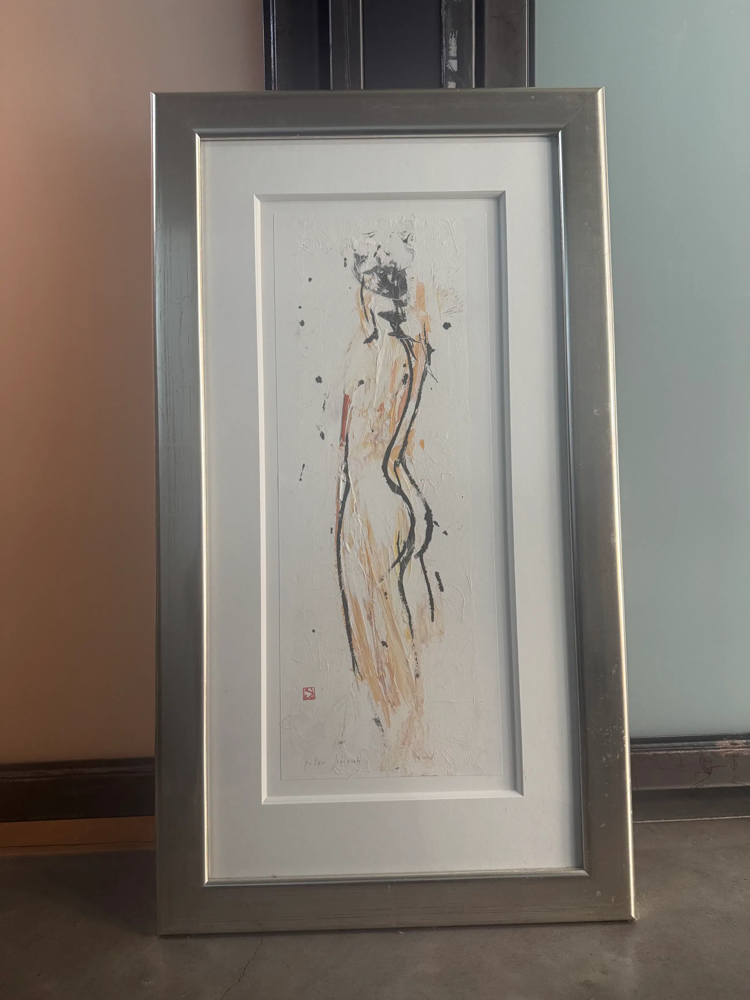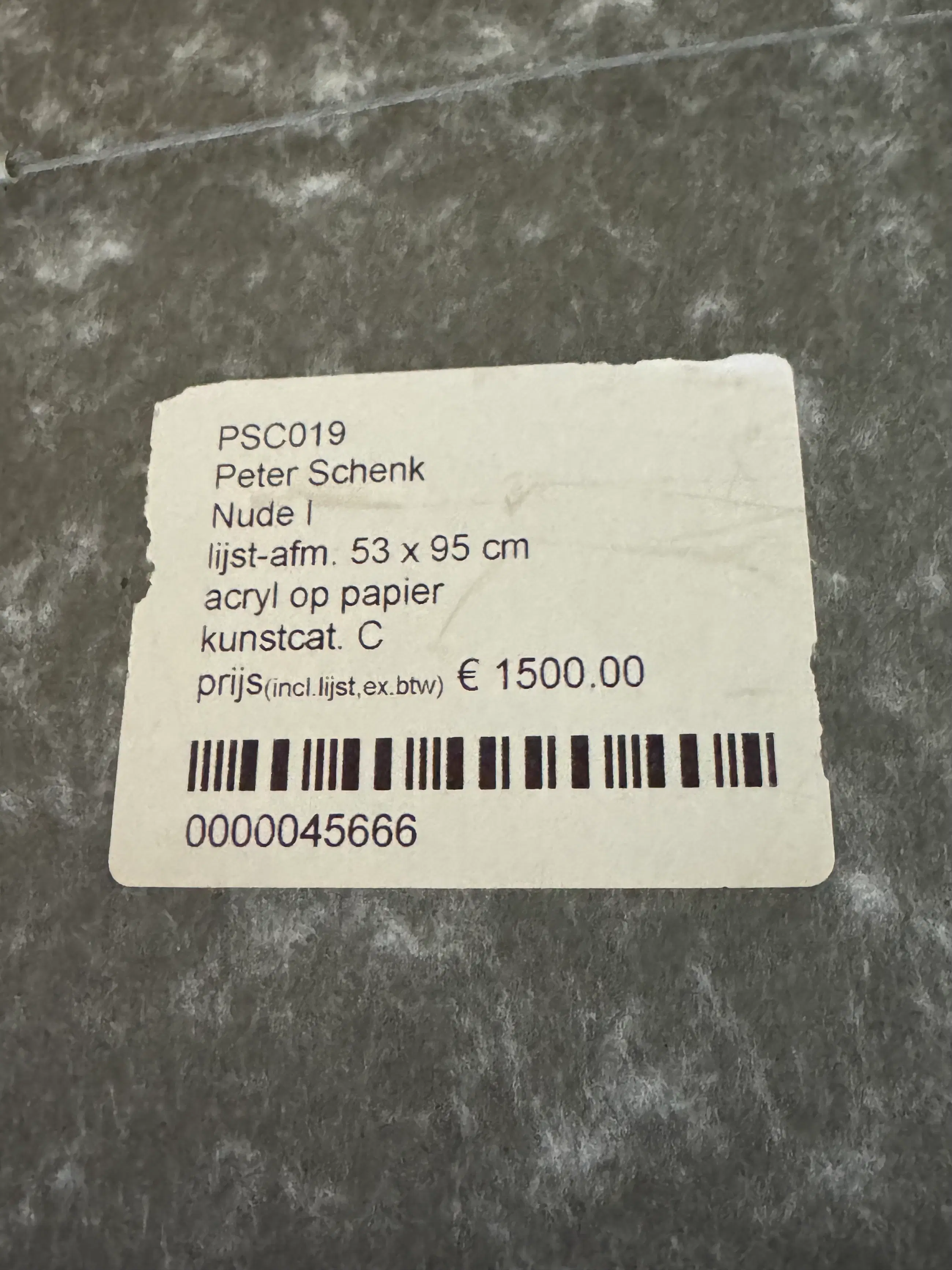 Modelschildering van Peter Schenk, getiteld Nude, uit 2006. Inkt en acrylverf op geschept papier in zware lijst.