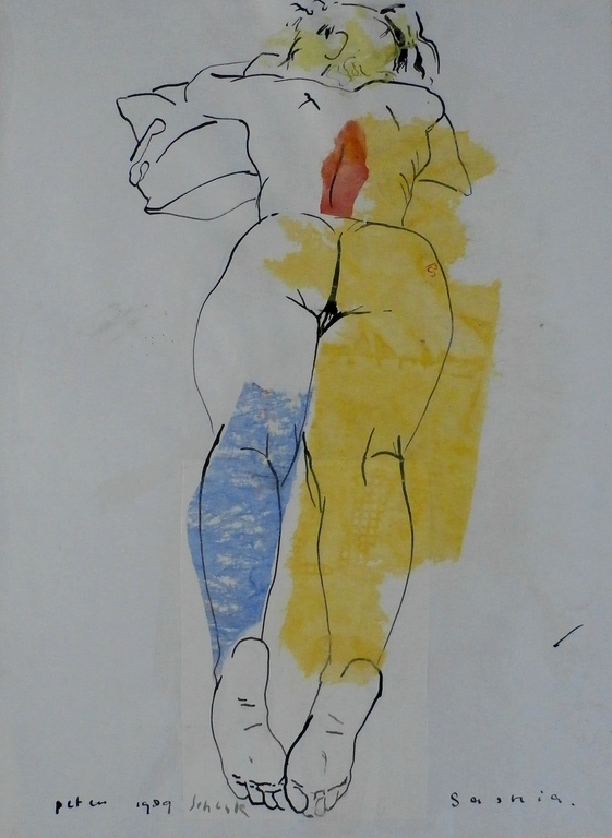 Groot werk van Peter Schenk, op papier, uit 1989. Titel: Saskia. Techniek: Collage/viltstift/verf. Afmetingen: h76 x b 56 cm.