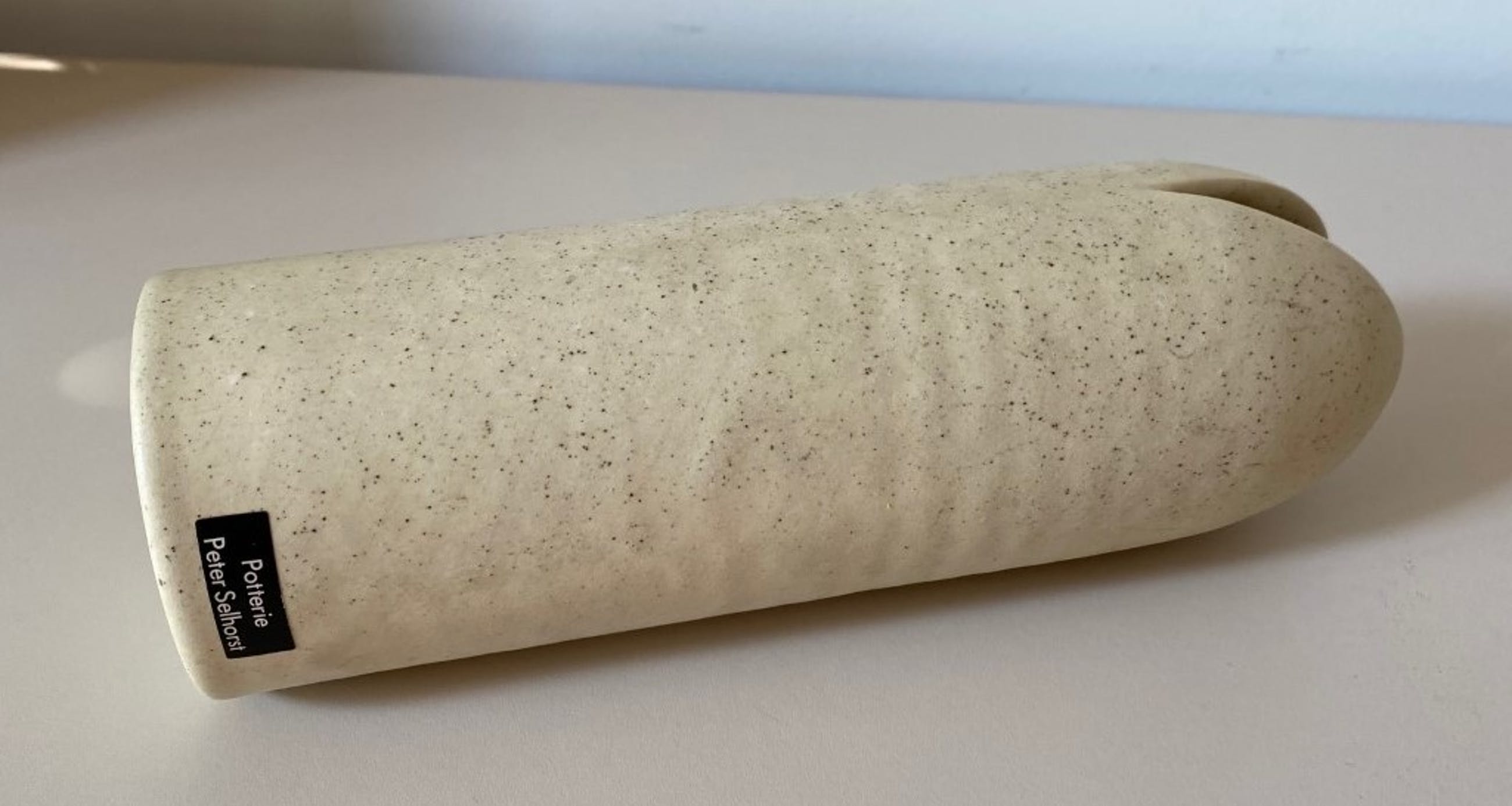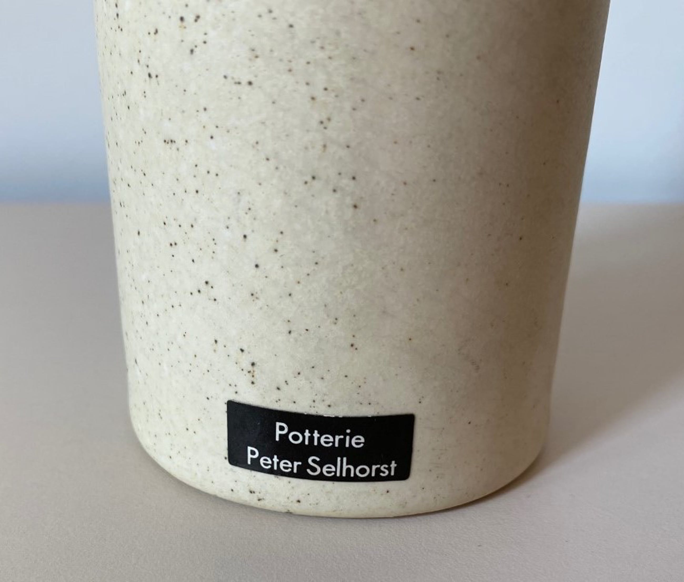 Prachtig strak gestileerd creme witte en zwarte stipjes (vandaar de vanille) mat geglazuurde keramisch vaasje van keramist Peter Selhorst uitgevoerd in zijn Potterie Selhorst uit Linschoten eind 20e eeuw. In prima onbeschadigde conditie en gemerkt met een zwarte papieren sticker op de voorzijde.