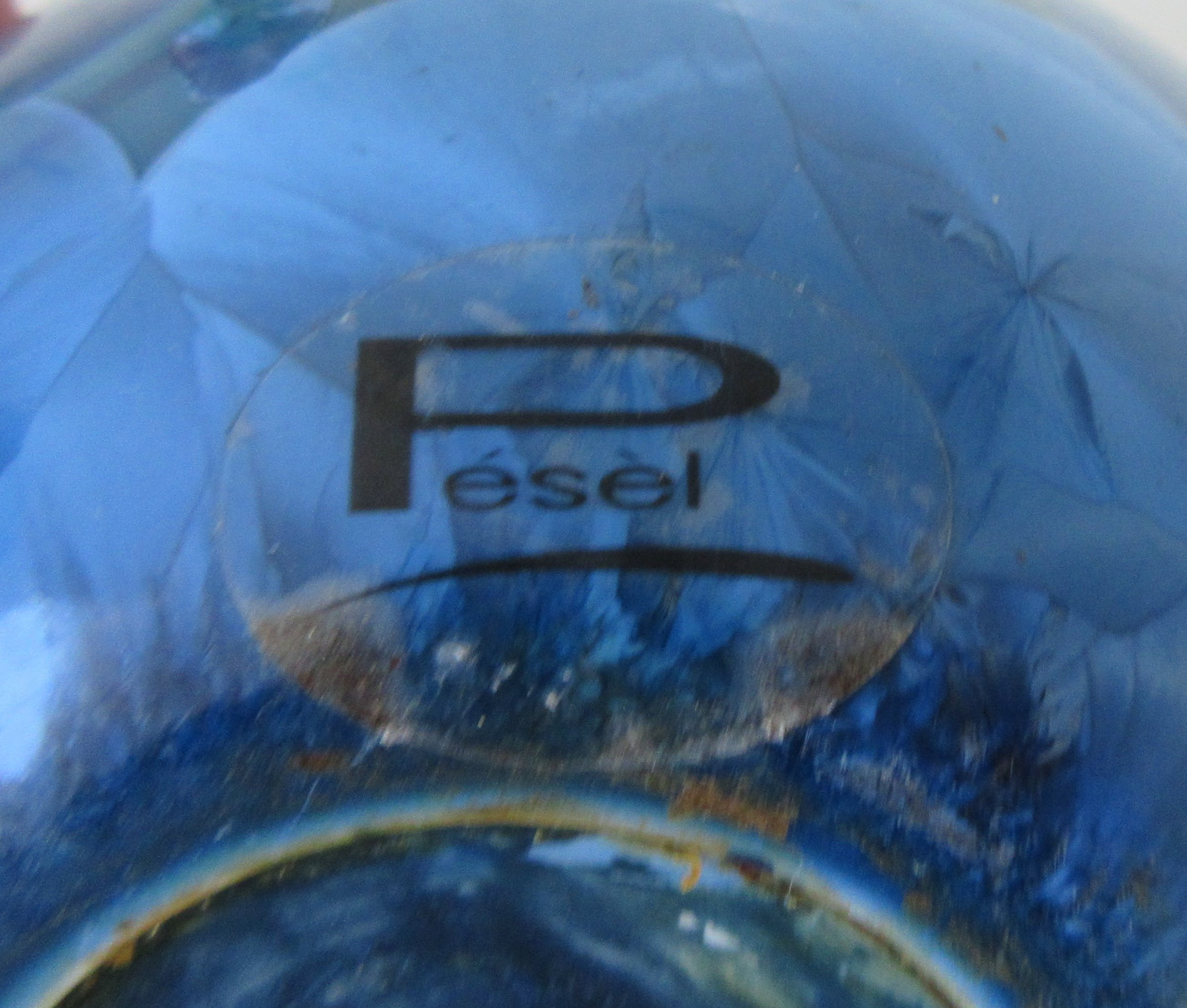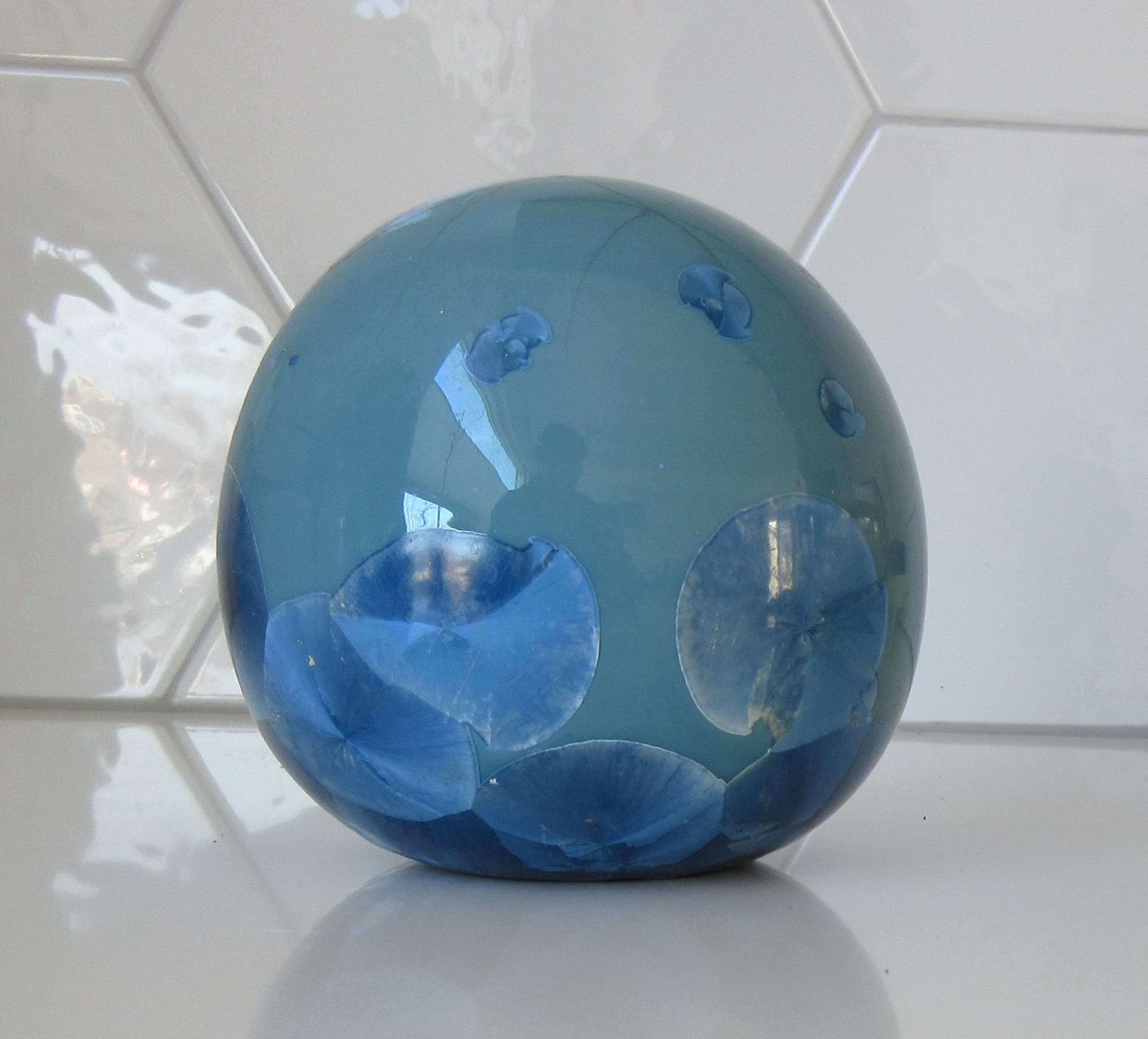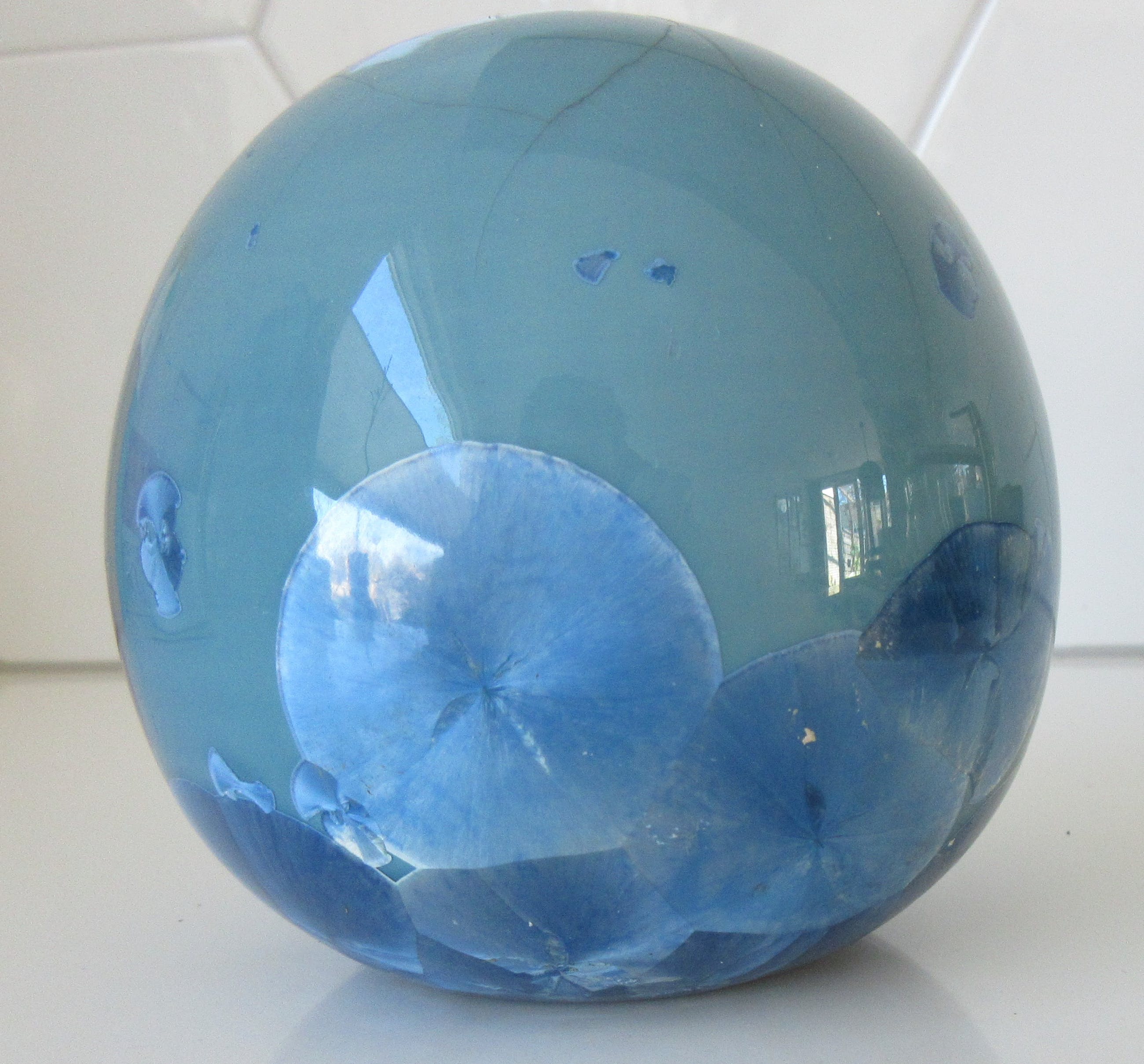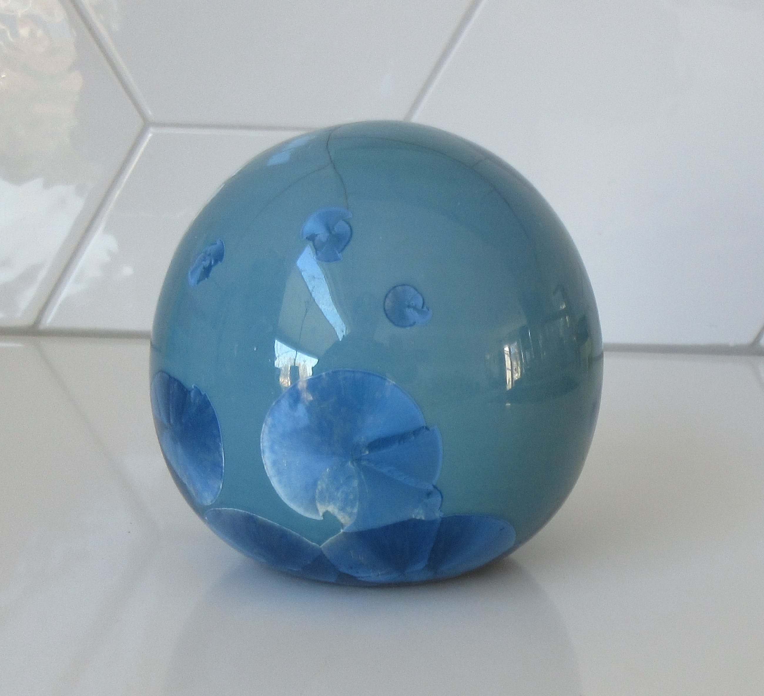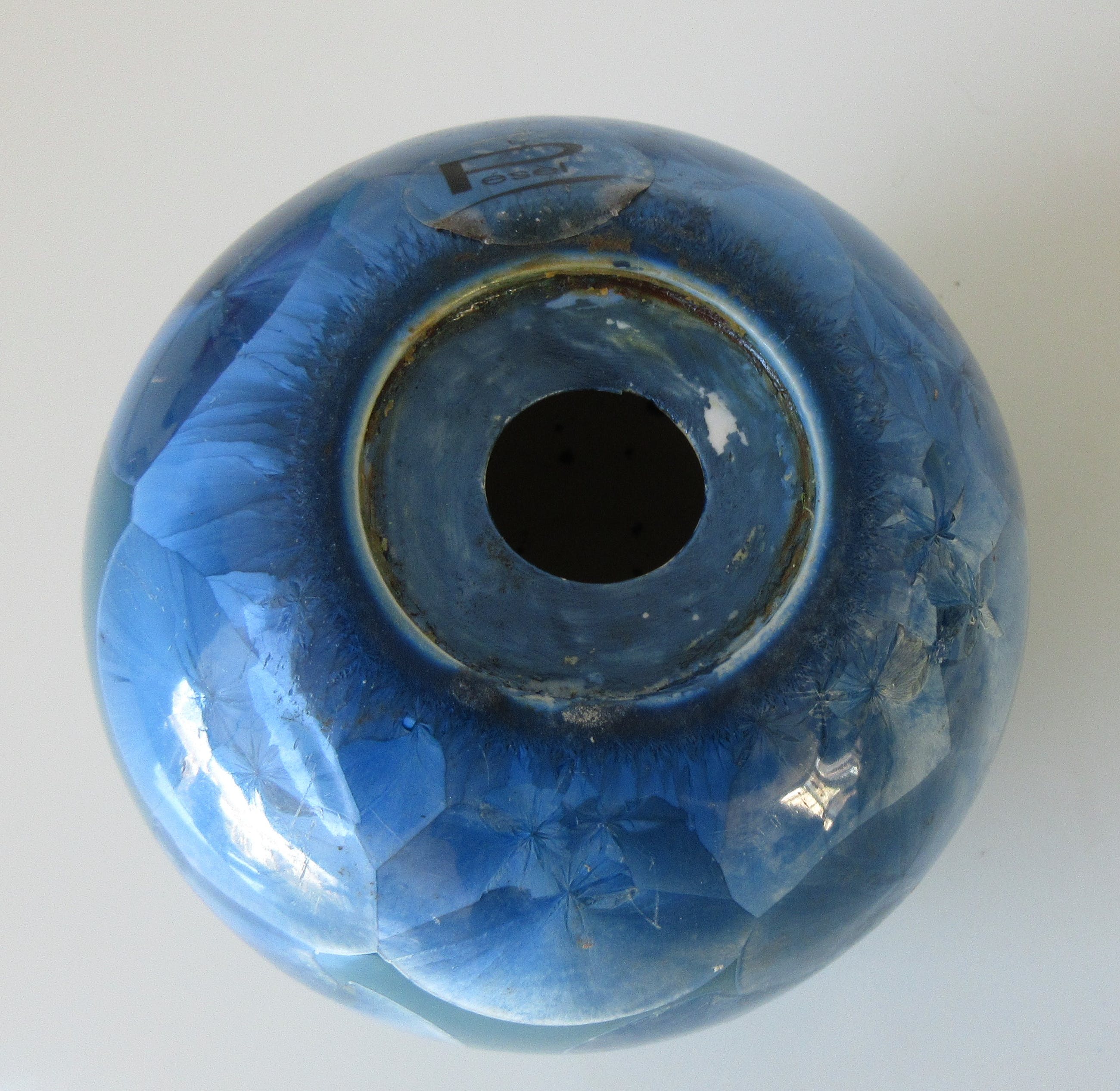 Kunst keramische blauwe kristalline glazuren bol uitgevoerd door Peter Selhorst in eigen atelier in Linschoten. Mooi decoratief stuk keramiek. In onbeschadigde conditie en voorzien van merksticker "Pesel".
