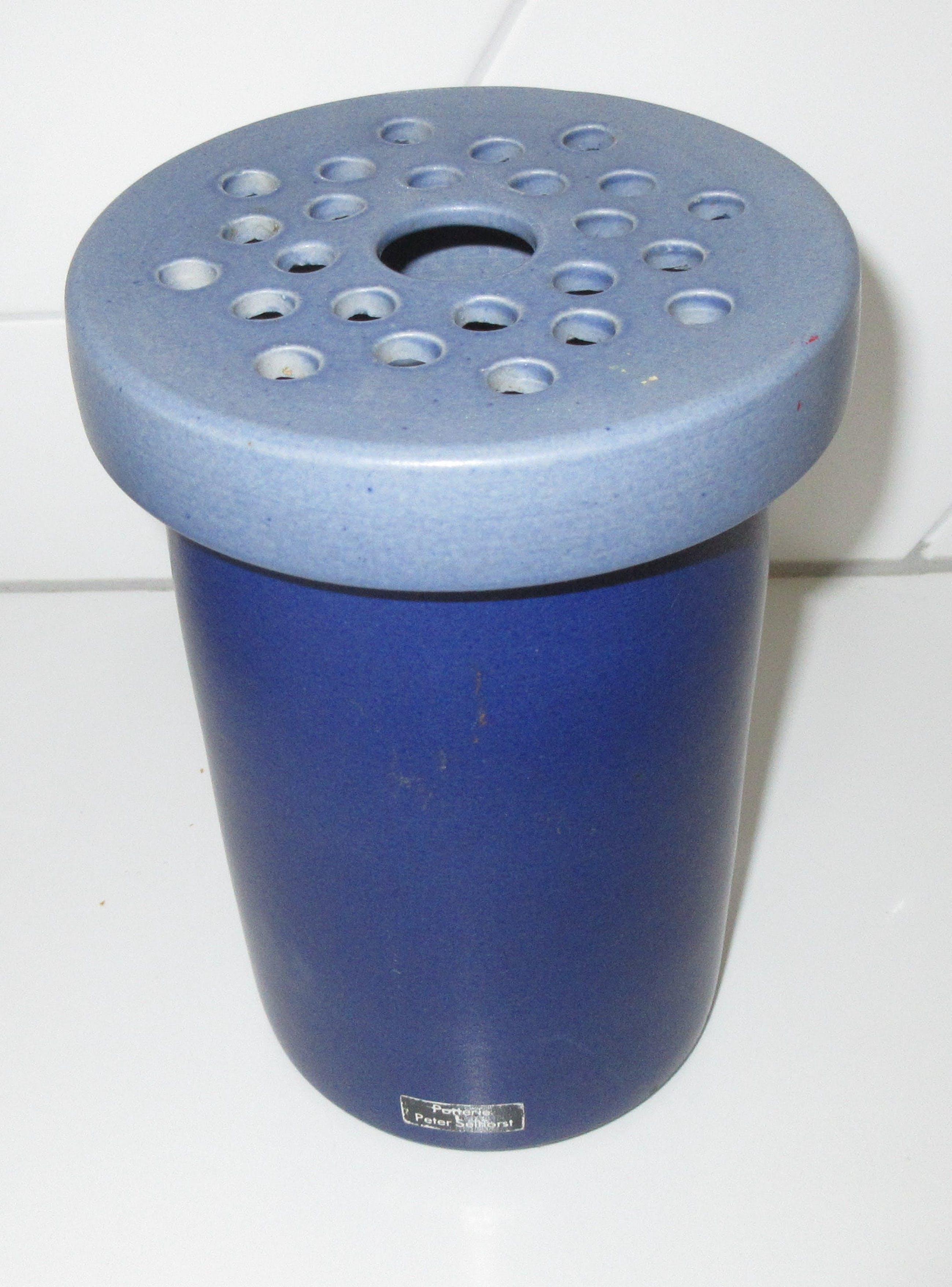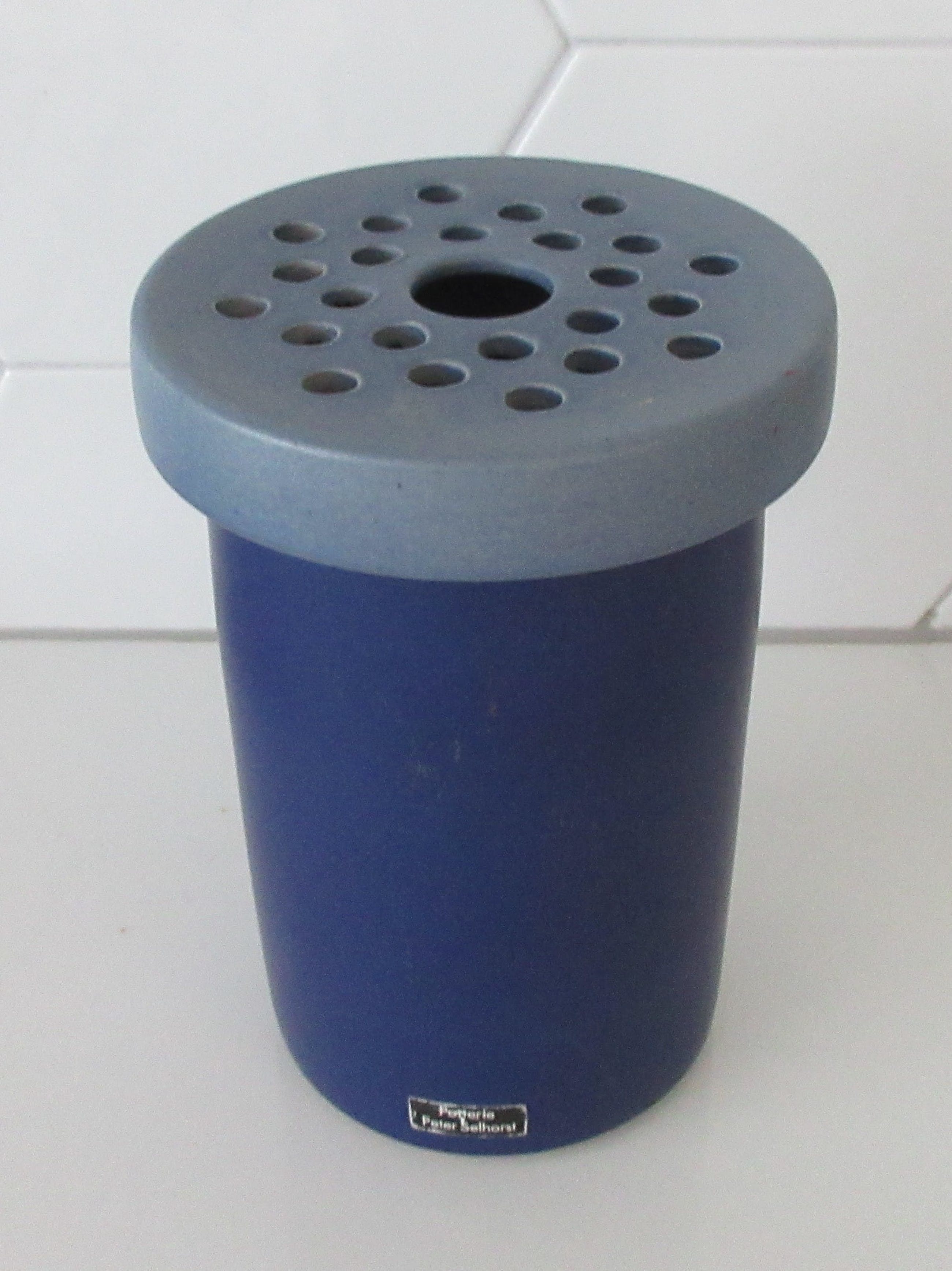 Mooie studio keramische design vaas (rozensteker) hard en grijsblauw geglazuurd van keramist Peter Selhorst. In prima onbeschadigde conditie en gemerkt met een sticker.Afmetingen; ca. 23 cm hoog en maximaal 9 cm in diameter