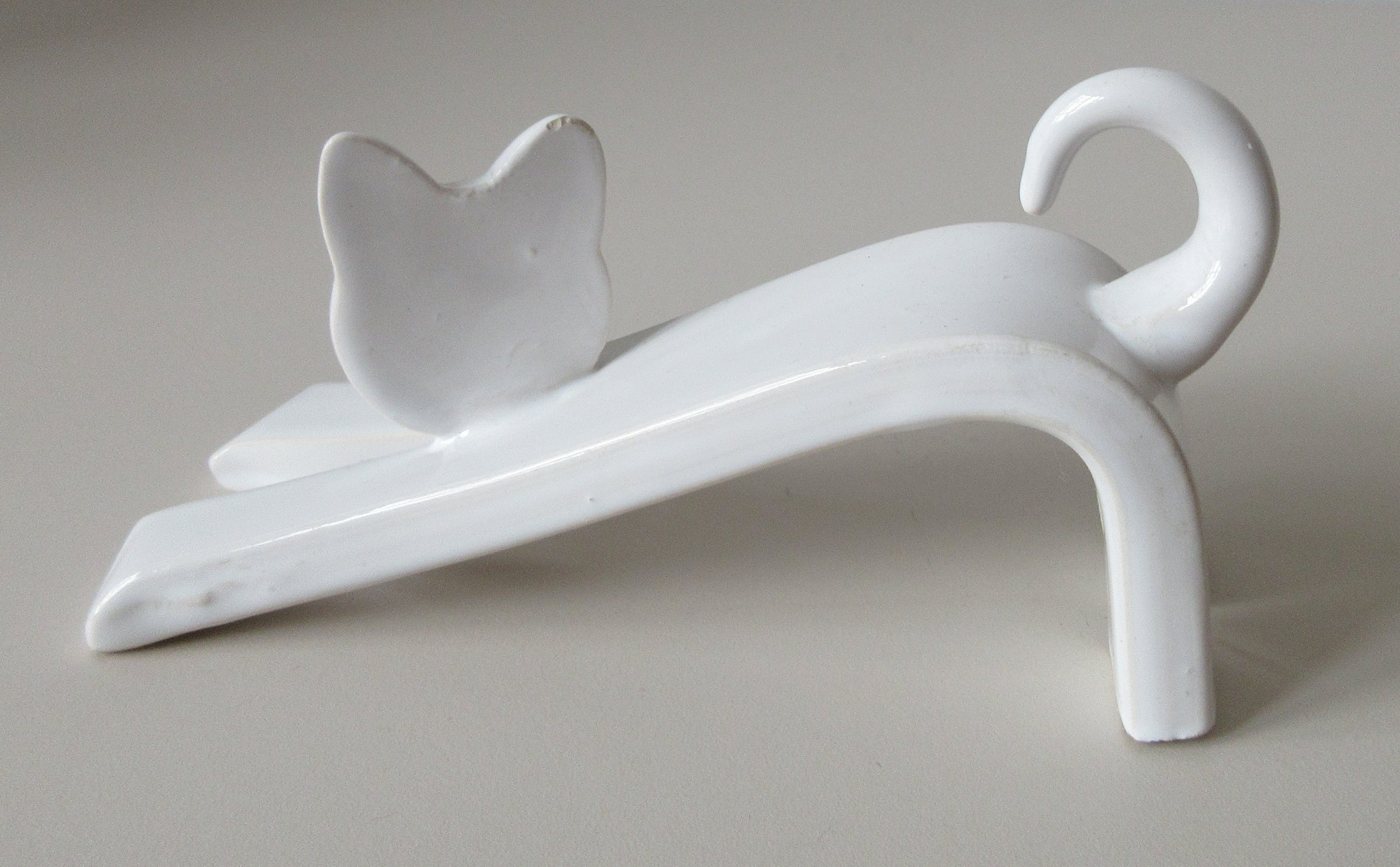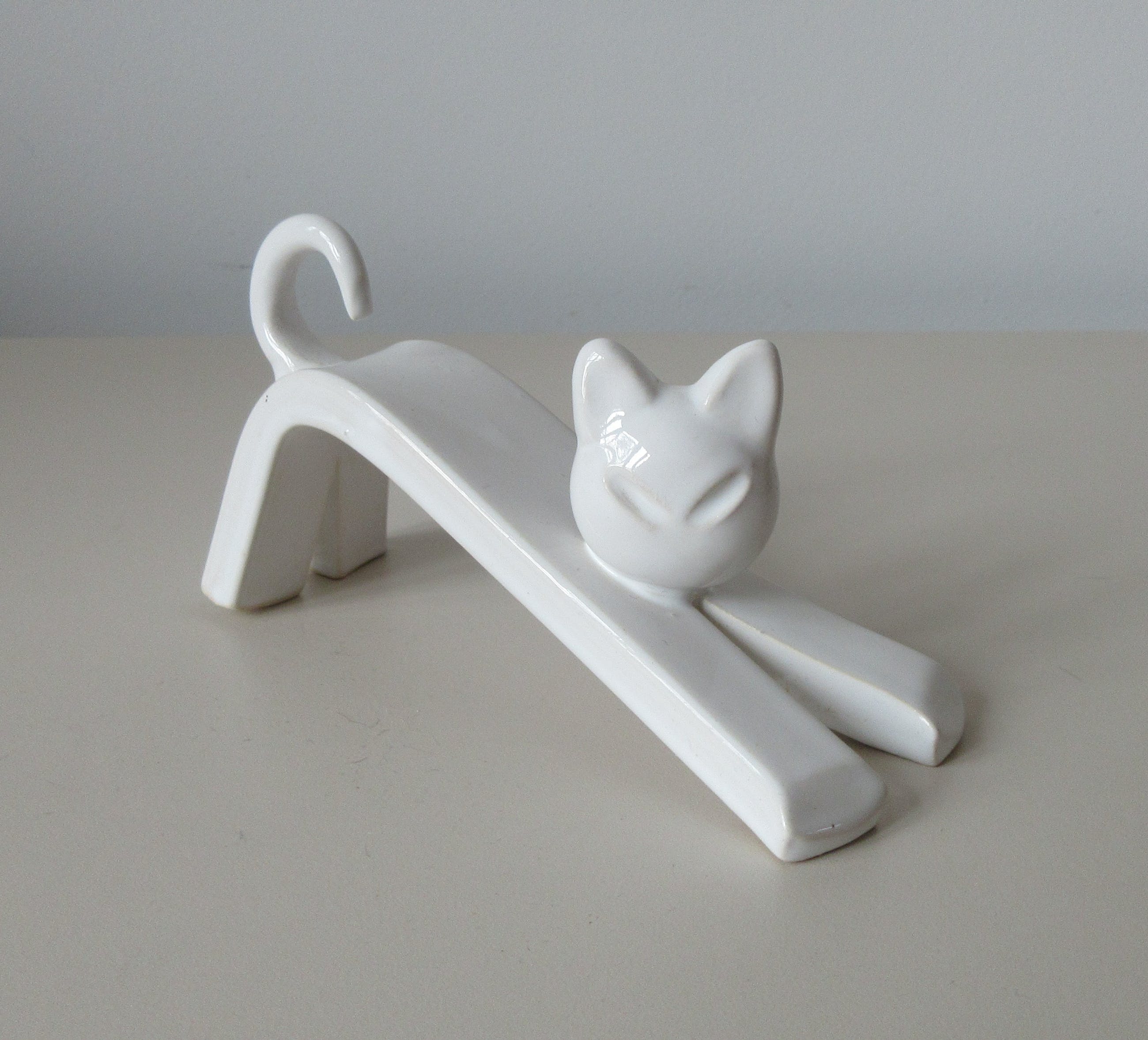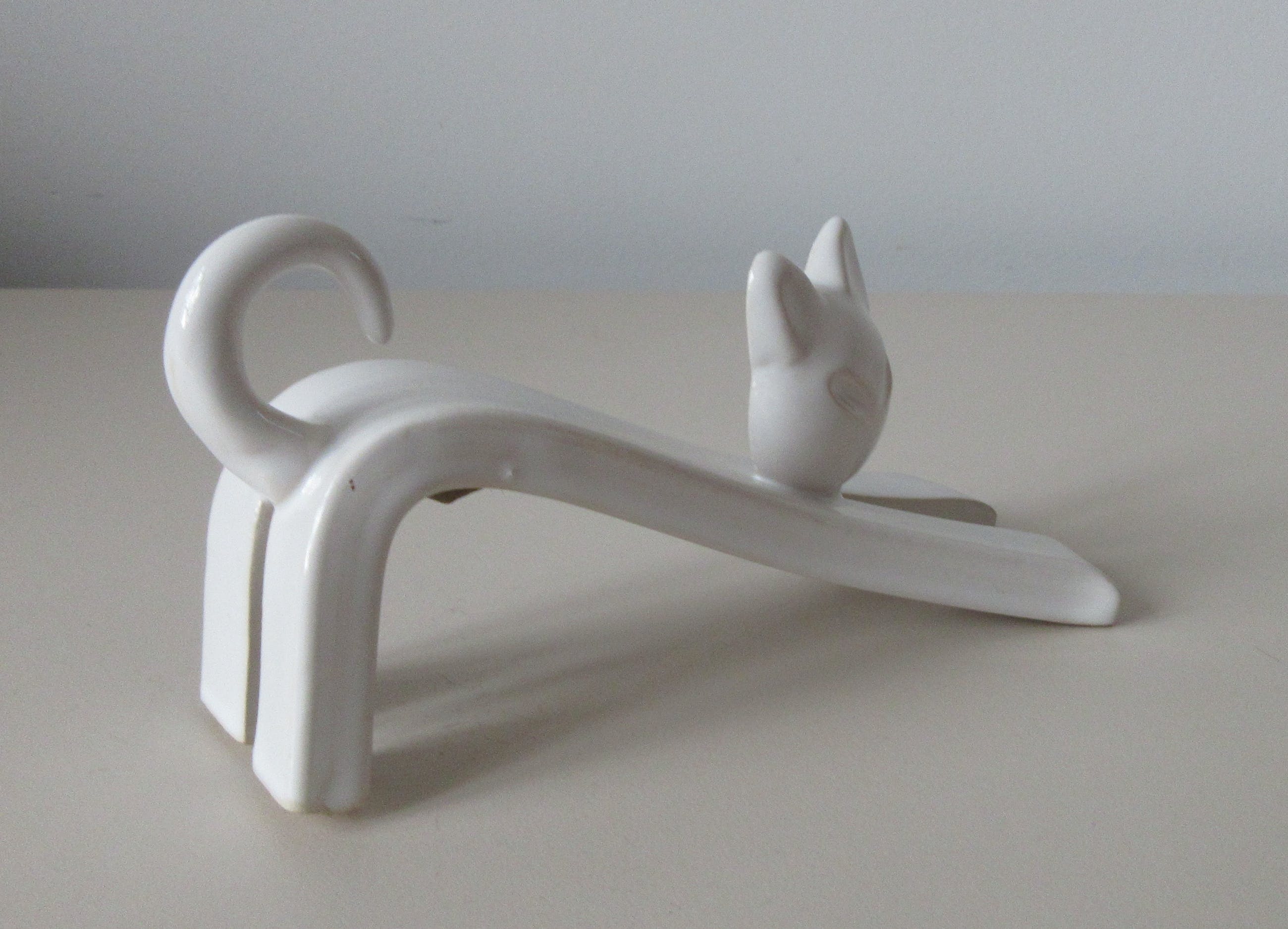 Witte aardewerk poes van Peter Selhorst (1945 - heden) Nederland uit de jaren 70. Afmeting: 15 x 4 x 7 cm. Gewicht: 120 gram.