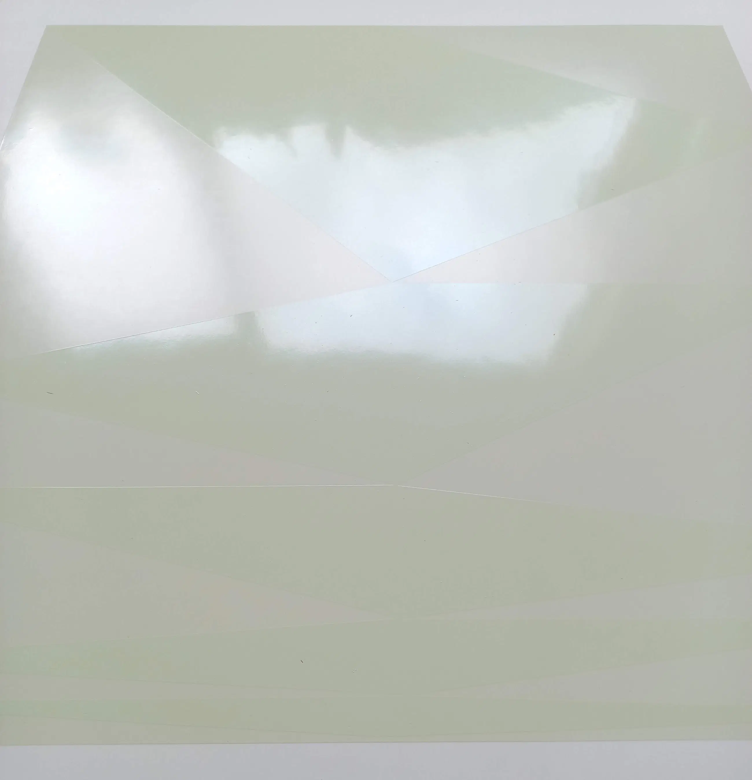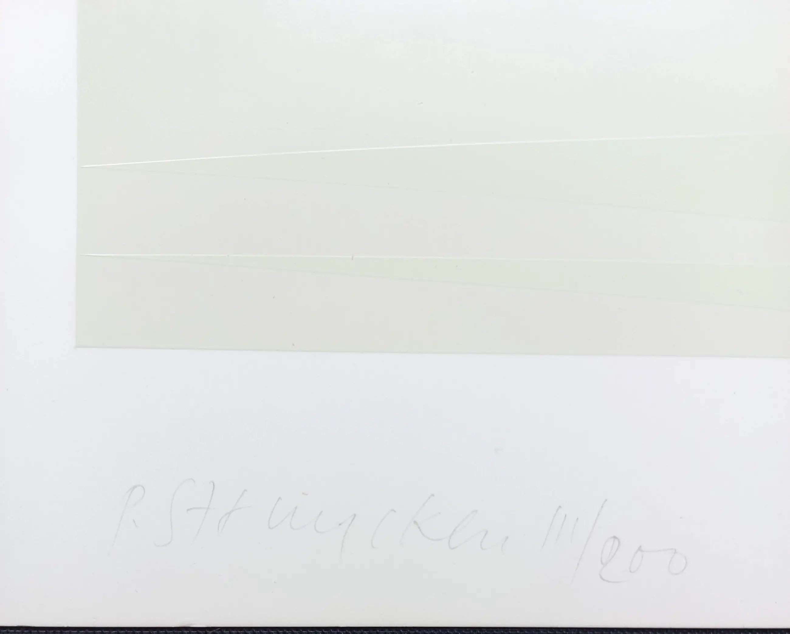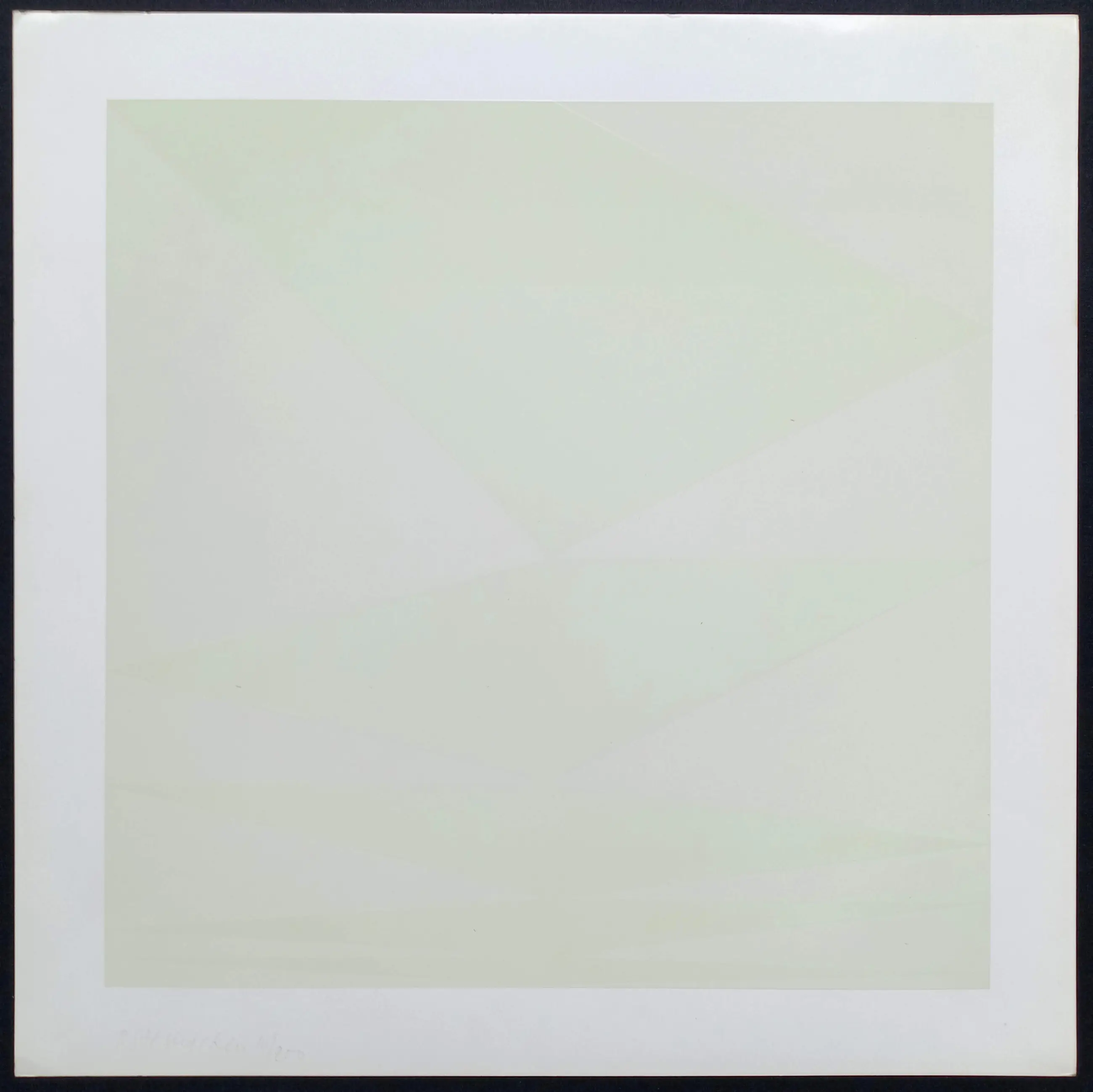 Zeer subtiele, geometrische compositie van Peter Struycken. De kleurverschillen zijn zo subtiel dat je zo nauwelijks ziet als je er recht voor staat. De compositie is duidelijker zichtbaar met strijklicht, ook door het gebruik van matte druk en glanzende druk over de matte druk heen. De laatste foto is genomen het blad tegen het licht houdend.