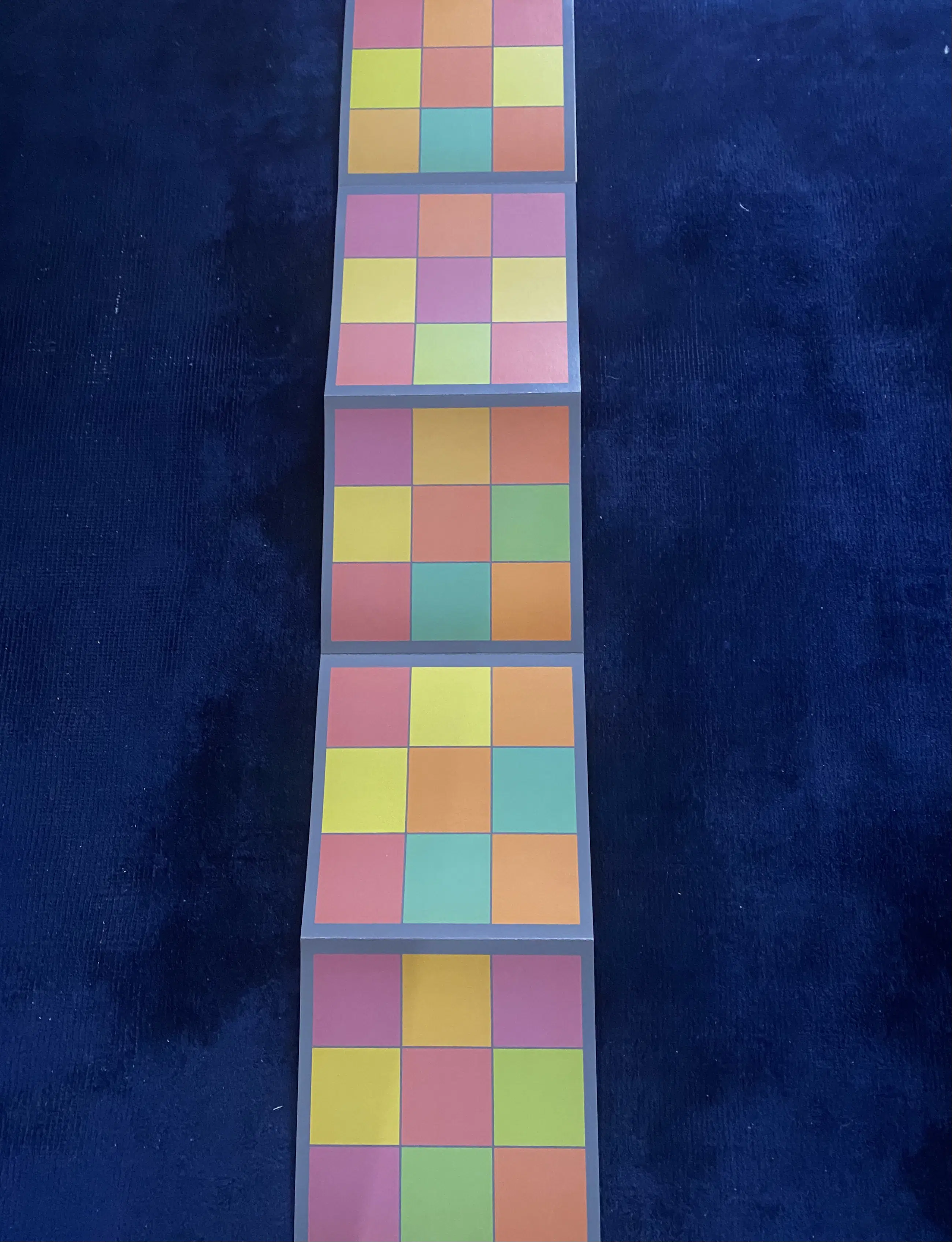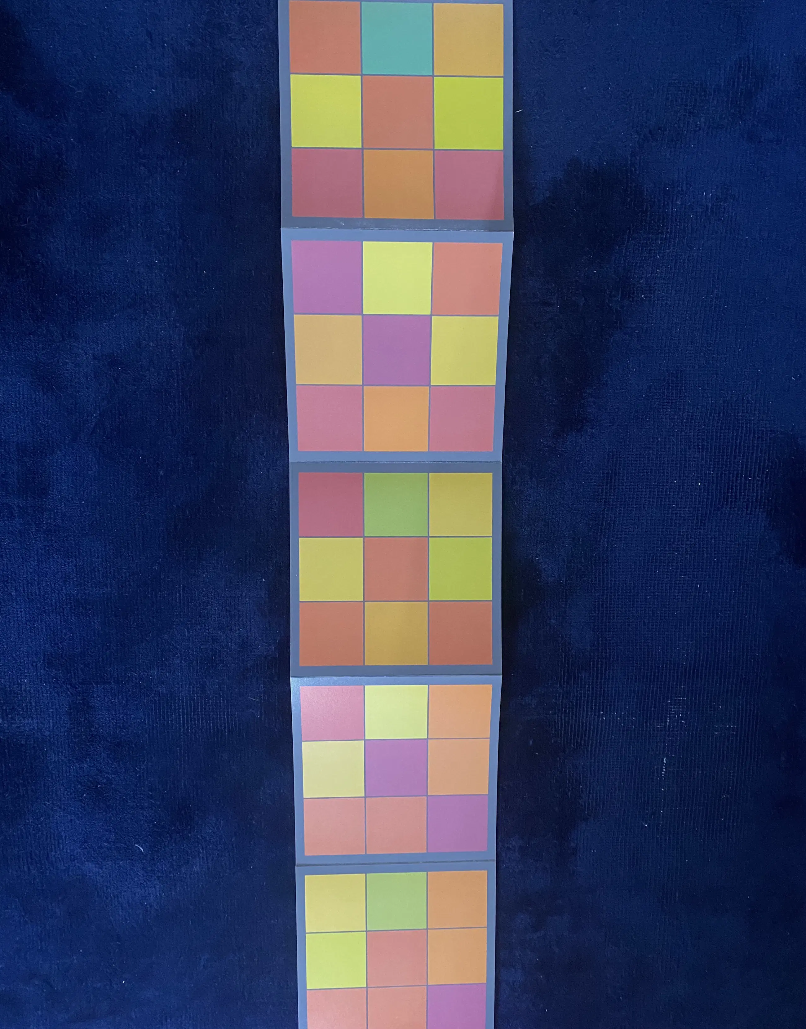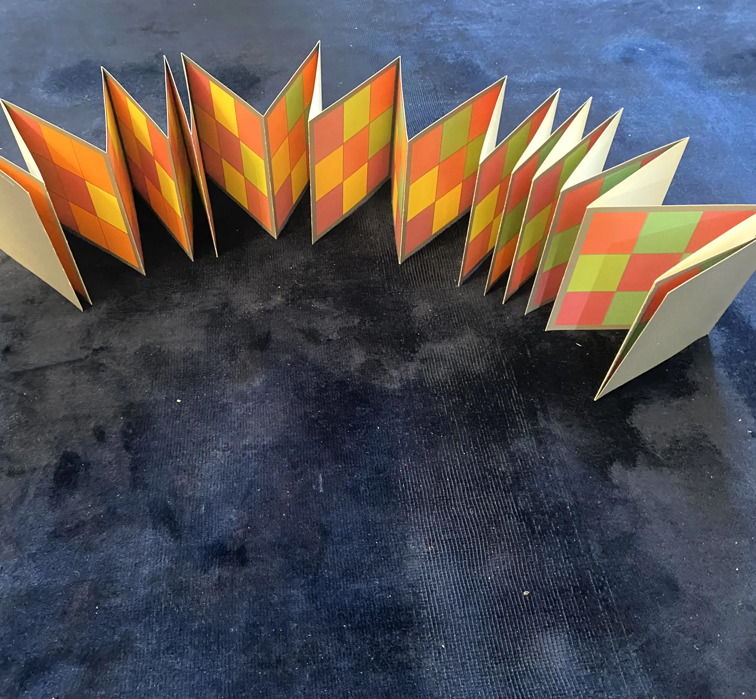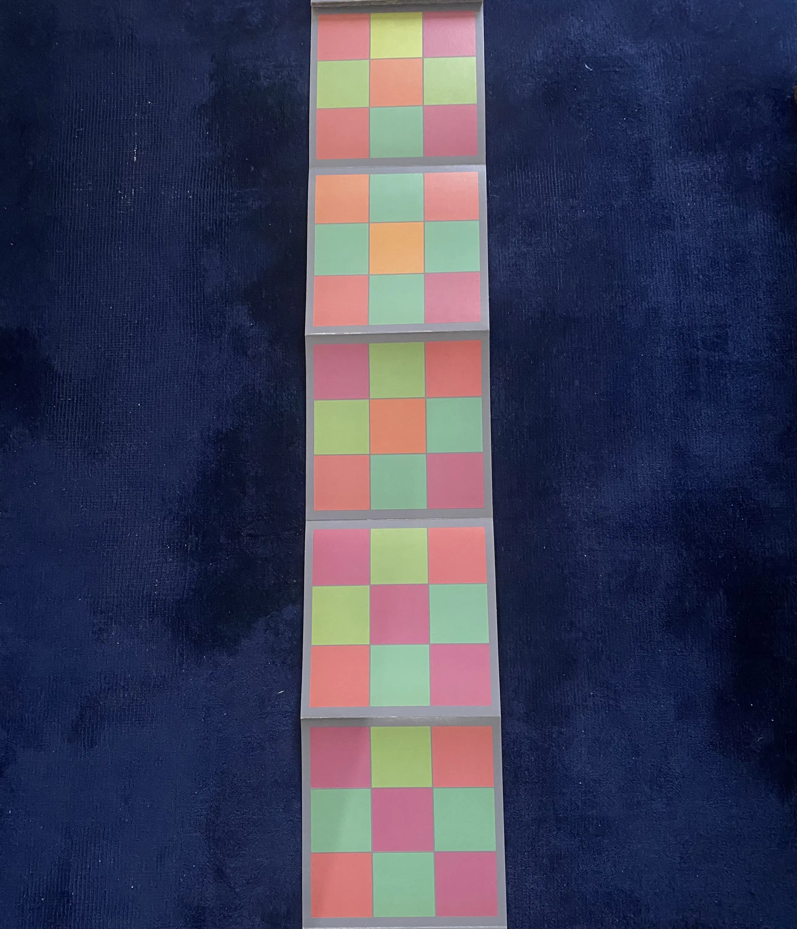 Uitgevouwen kleurbladen (27 stuks) = 21 x 567 cm.