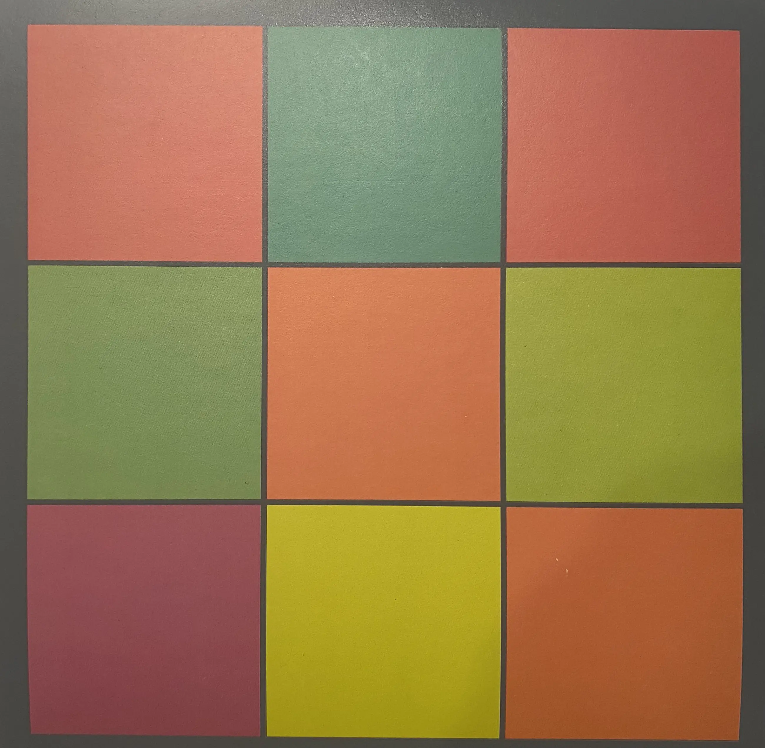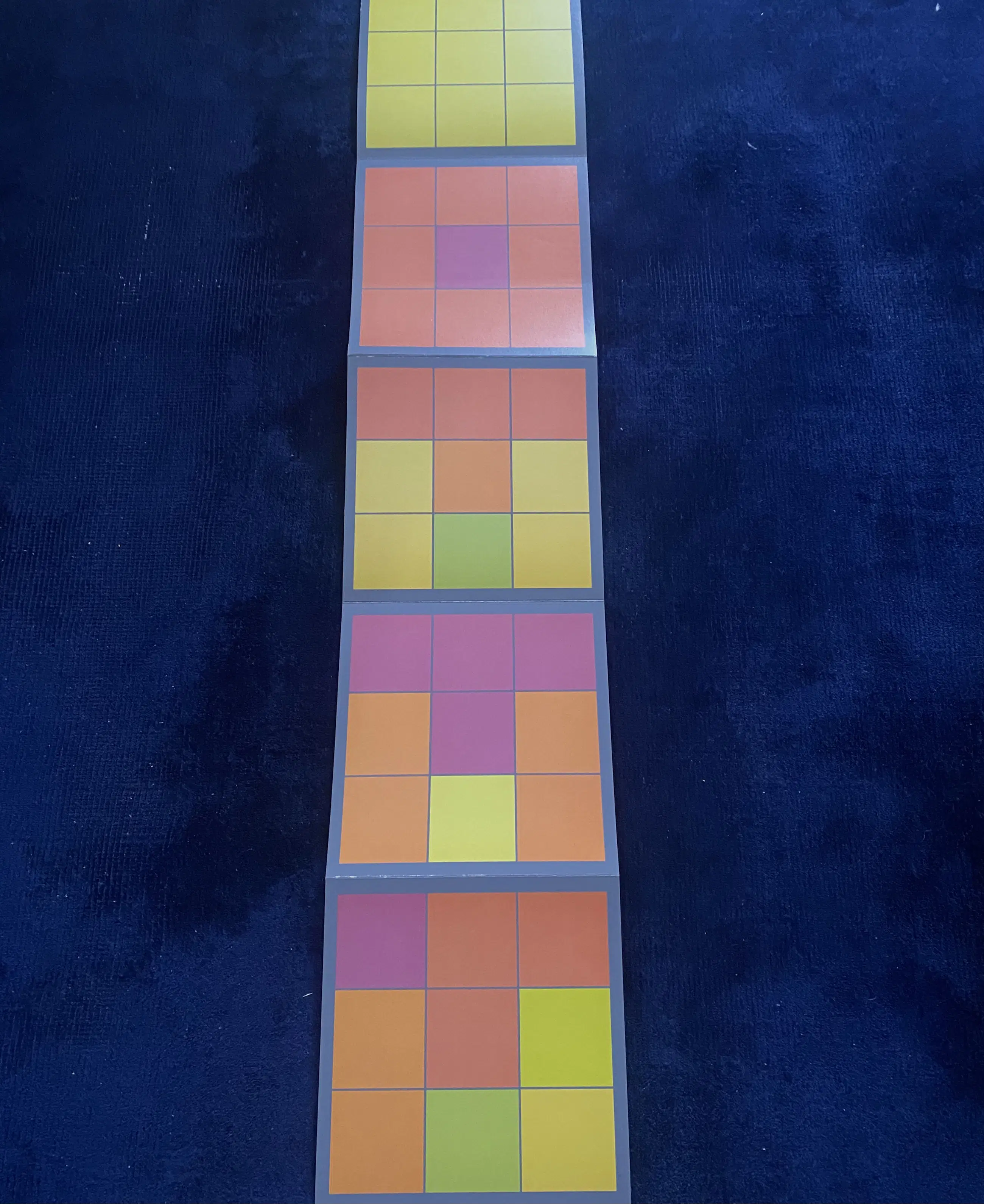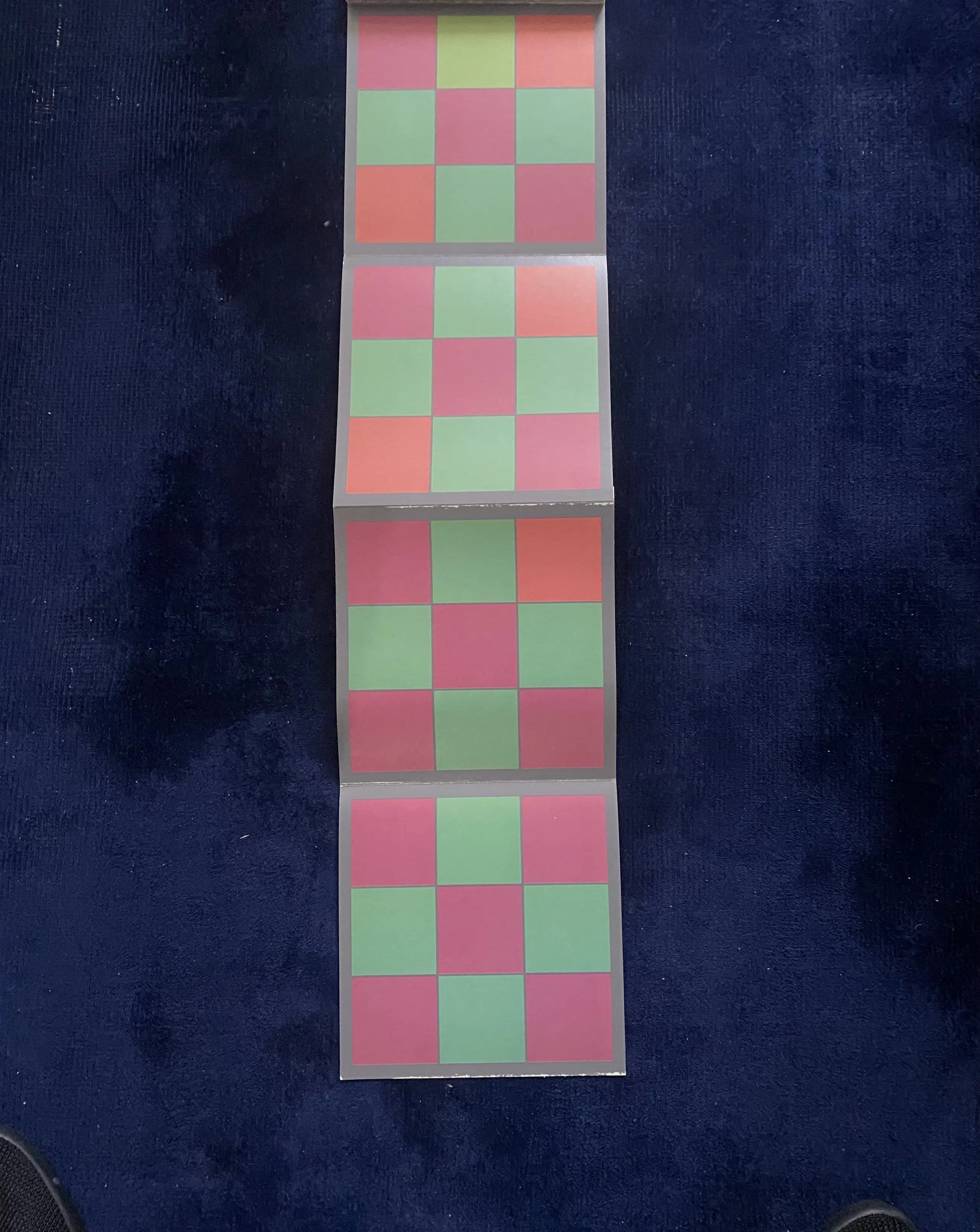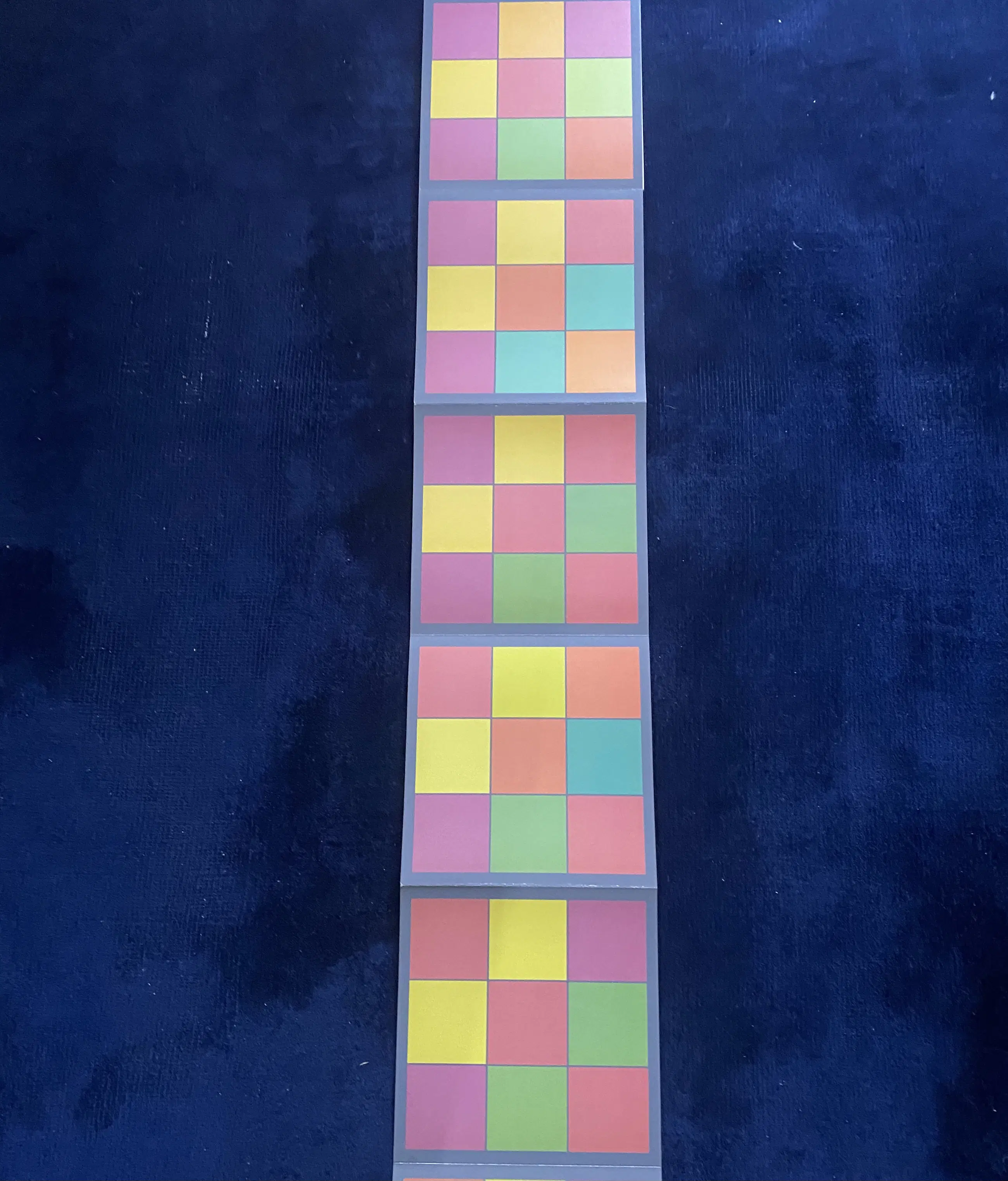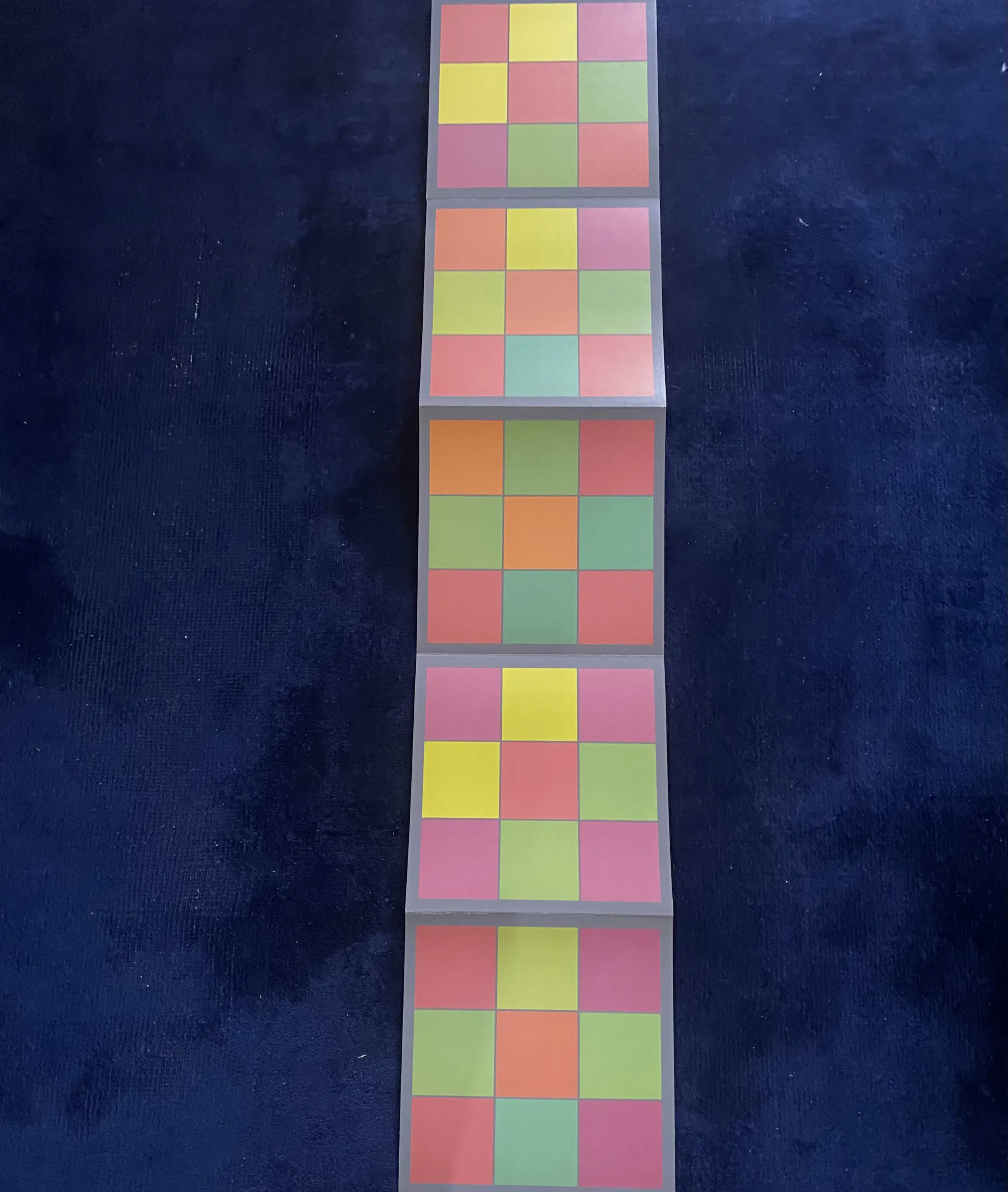 Uitgevouwen kleurbladen (27 stuks) = 21 x 567 cm.