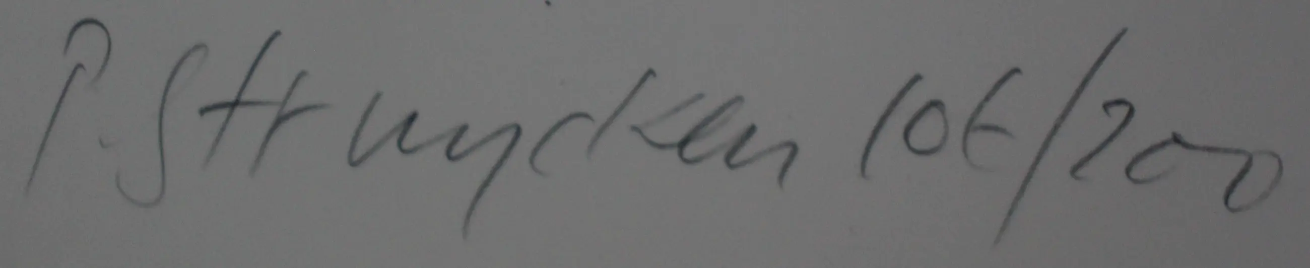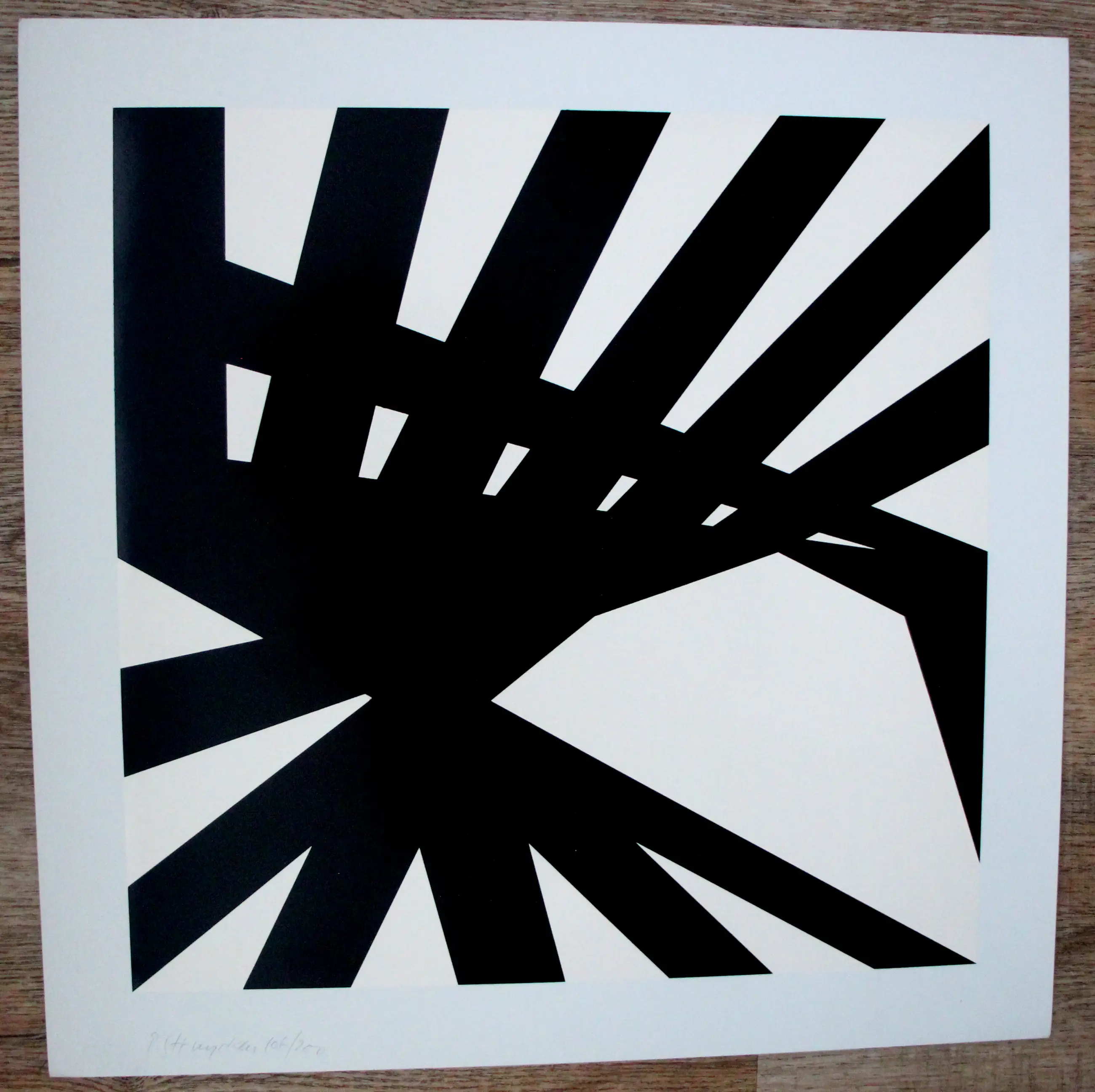 Zeefdruk van Peter Struycken. Geometrische compositie. Oplage: 106/200. Gemaakt door "Levission", uitgegeven door galerij Orez te Den Haag in 1966. Het werk is links onderin, met potlood, gesigneerd door de kunstenaar. De authenticiteit van het aangeboden werk wordt volledig gegarandeerd. Een certificaat van echtheid kan, op aanvraag, worden gemaild.