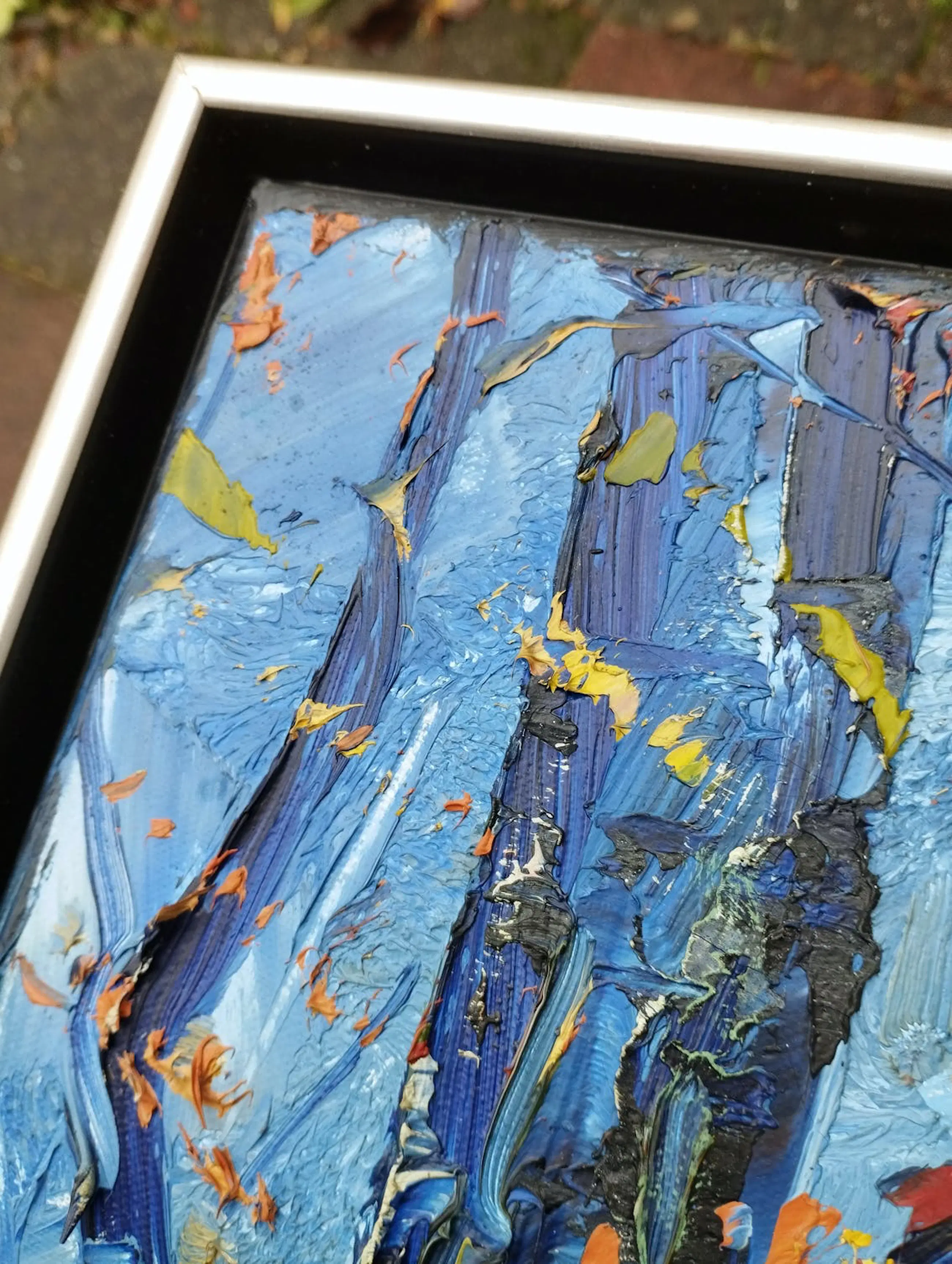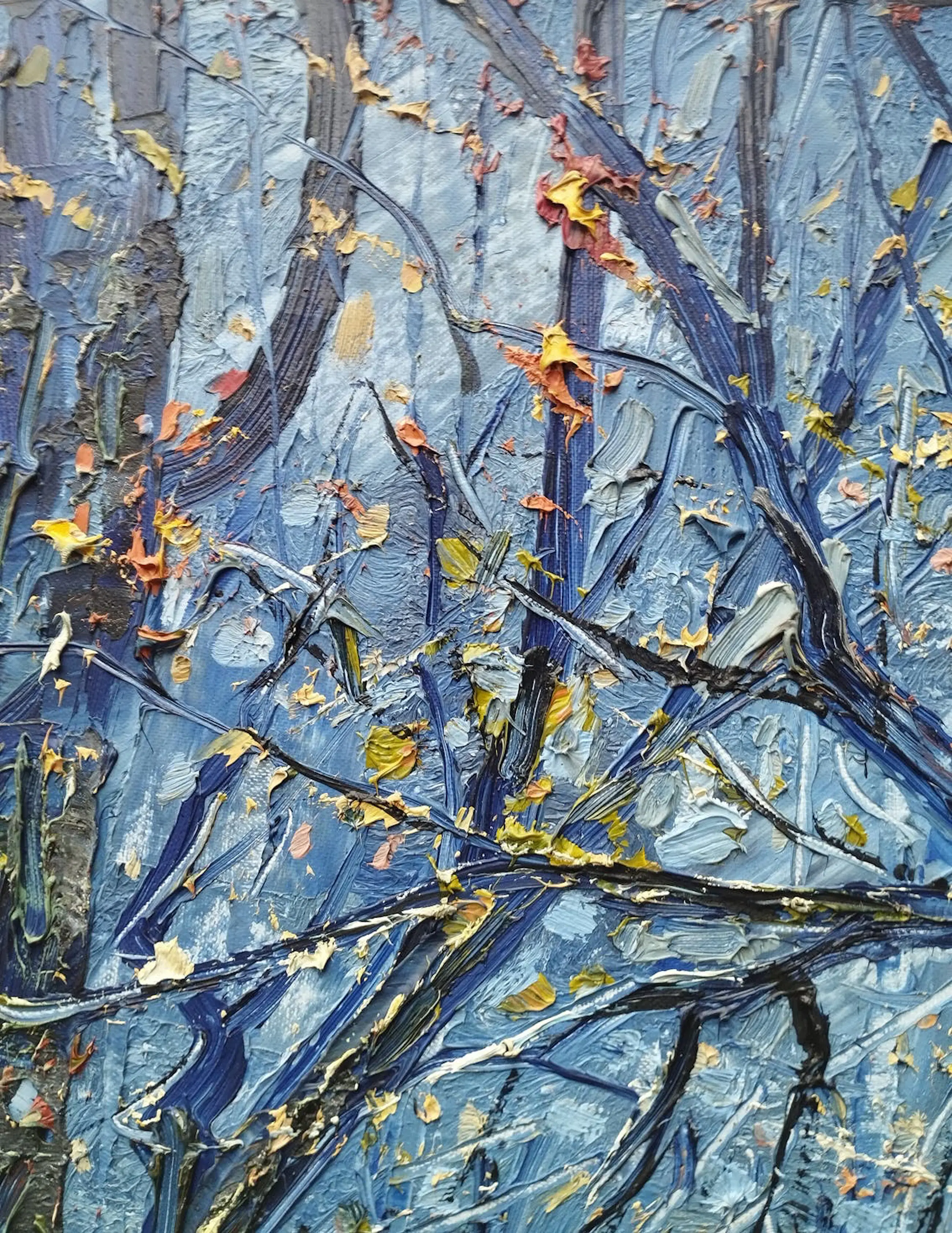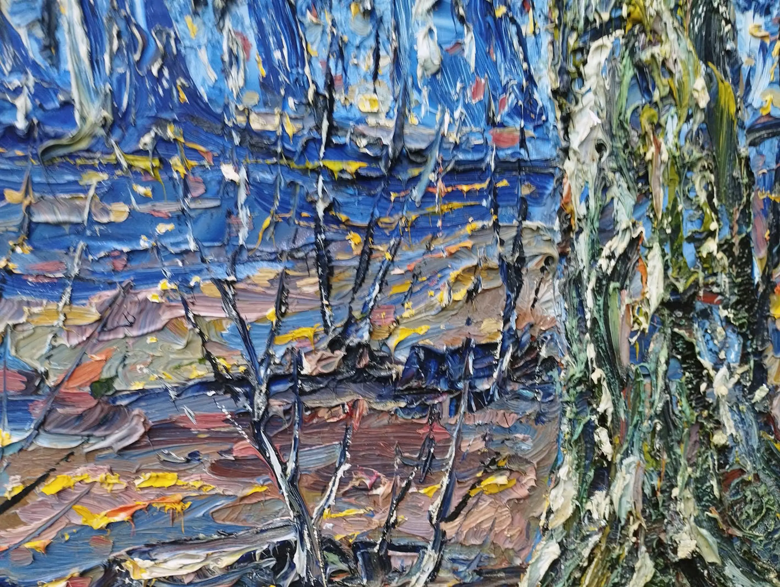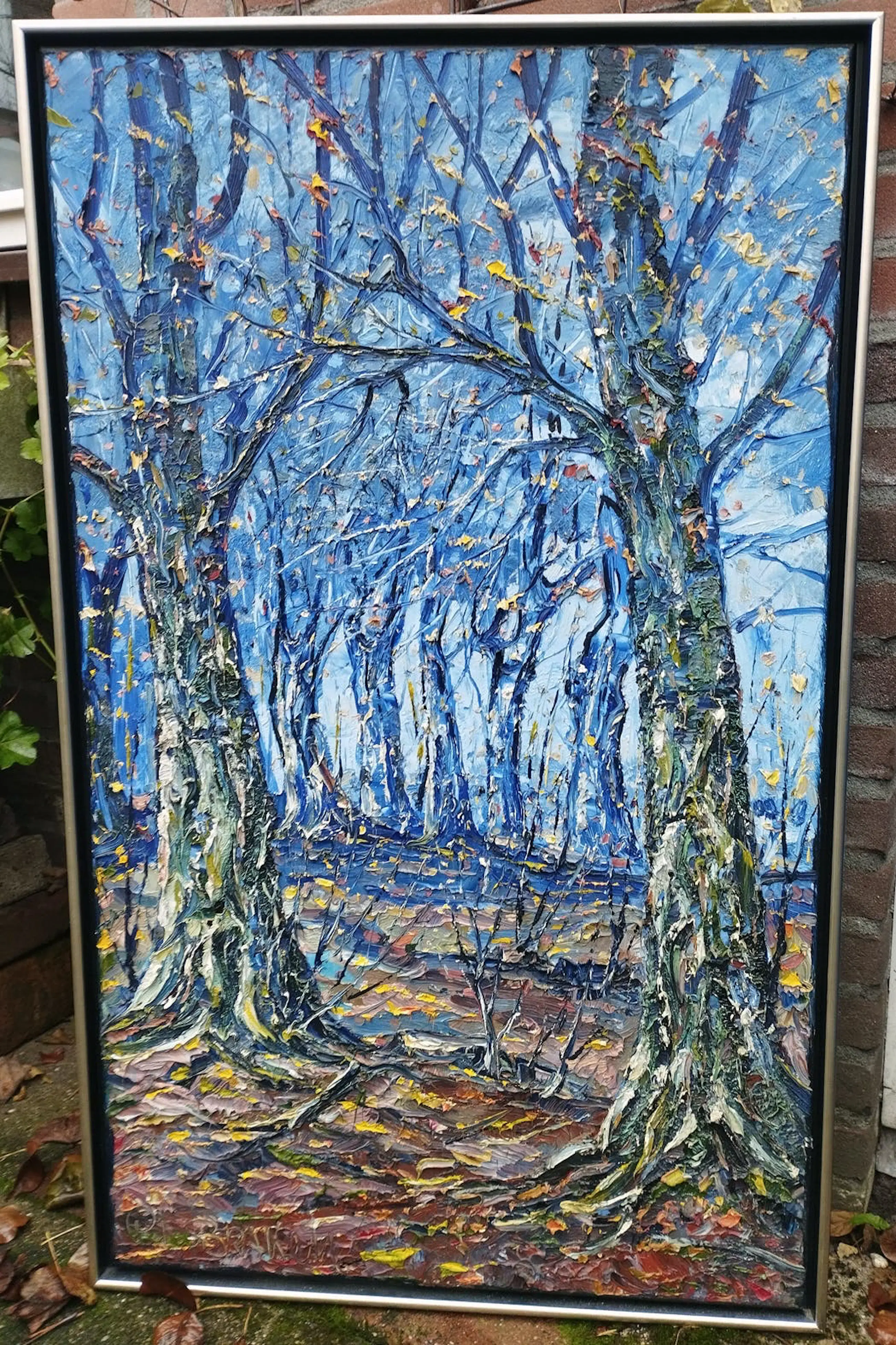 Figuratief, pasteus expressionistisch olieverfschilderij van de Brabantse kunstenaar Peter van den Braken met een voorstelling van een bomenrij tegen een staalblauwe winterlucht. De uitvoering ademt de sfeer van zijn geliefde kunstenaar en streekgenoot Vincent van Gogh. Het werk is linksonder gesigneerd en gekrast in de nog verse olieverf, in stijlvolle baklijst en als geheel in zeer goede staat.