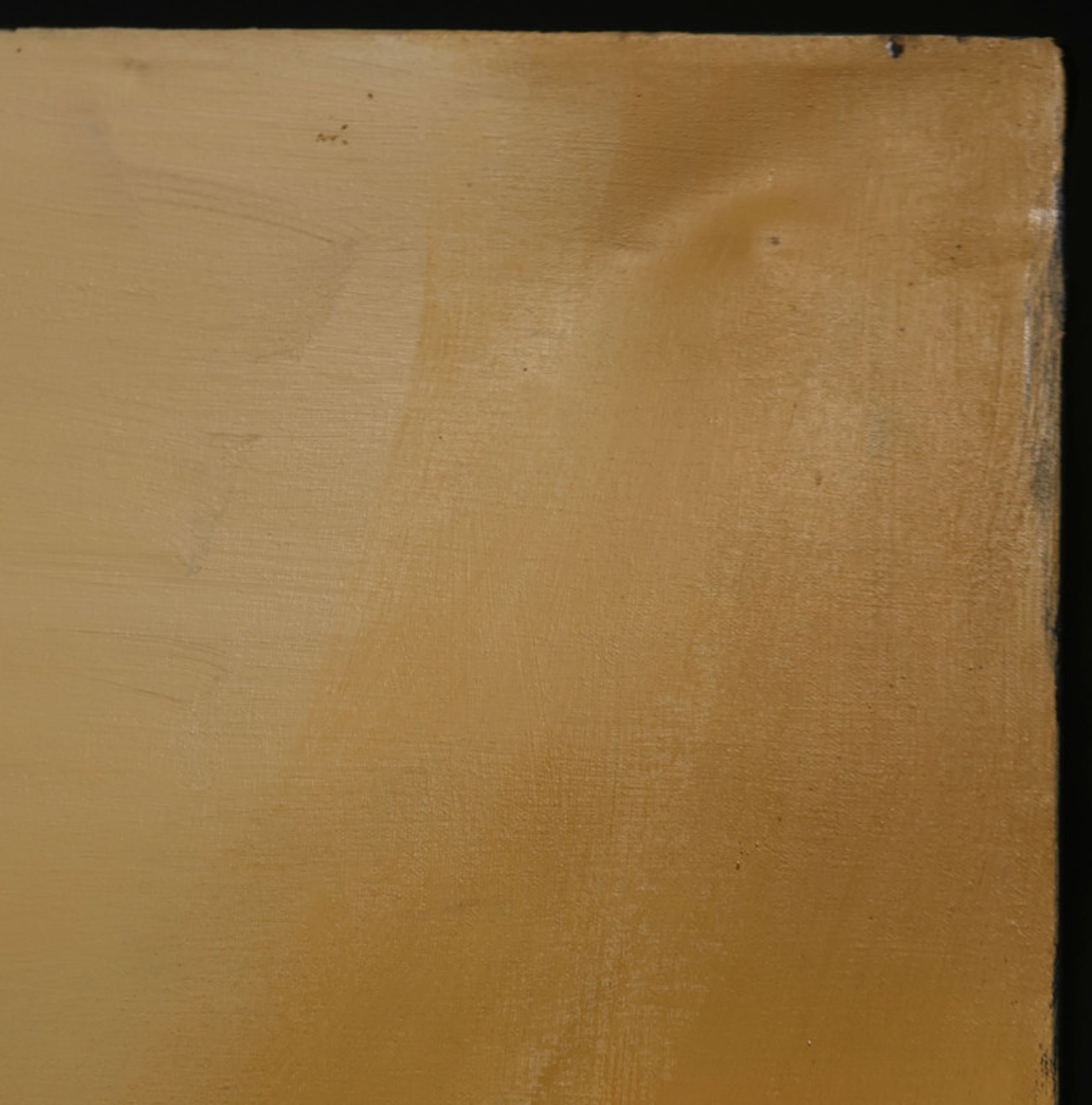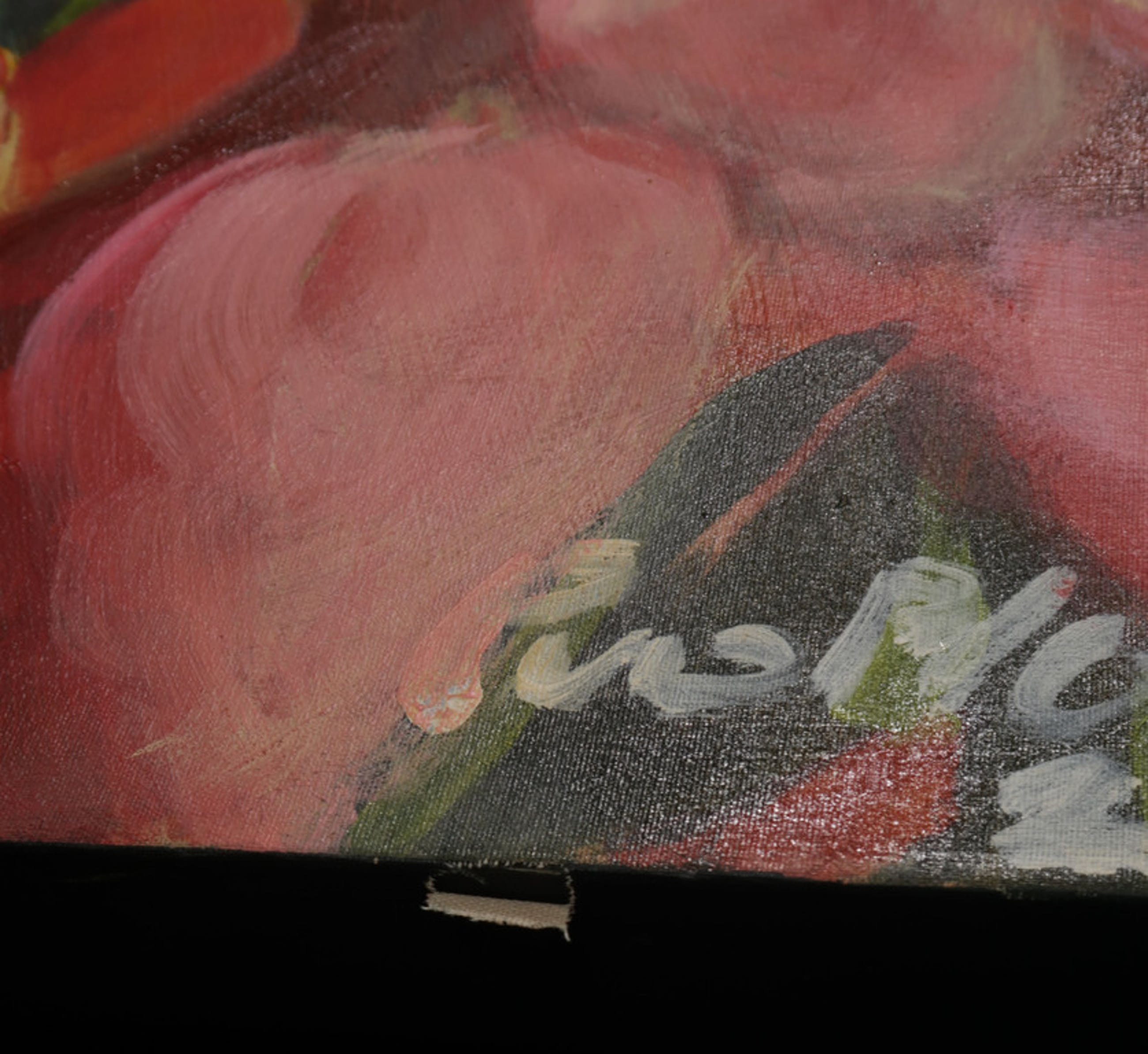 Conditie kunstwerk: In goede staat, maar met beschadigingen langs de randen van het doek, een scheurtje in de onderrand van het doek (zie foto), In de hoek rechtsboven een lichte buts/deuk in het doek.