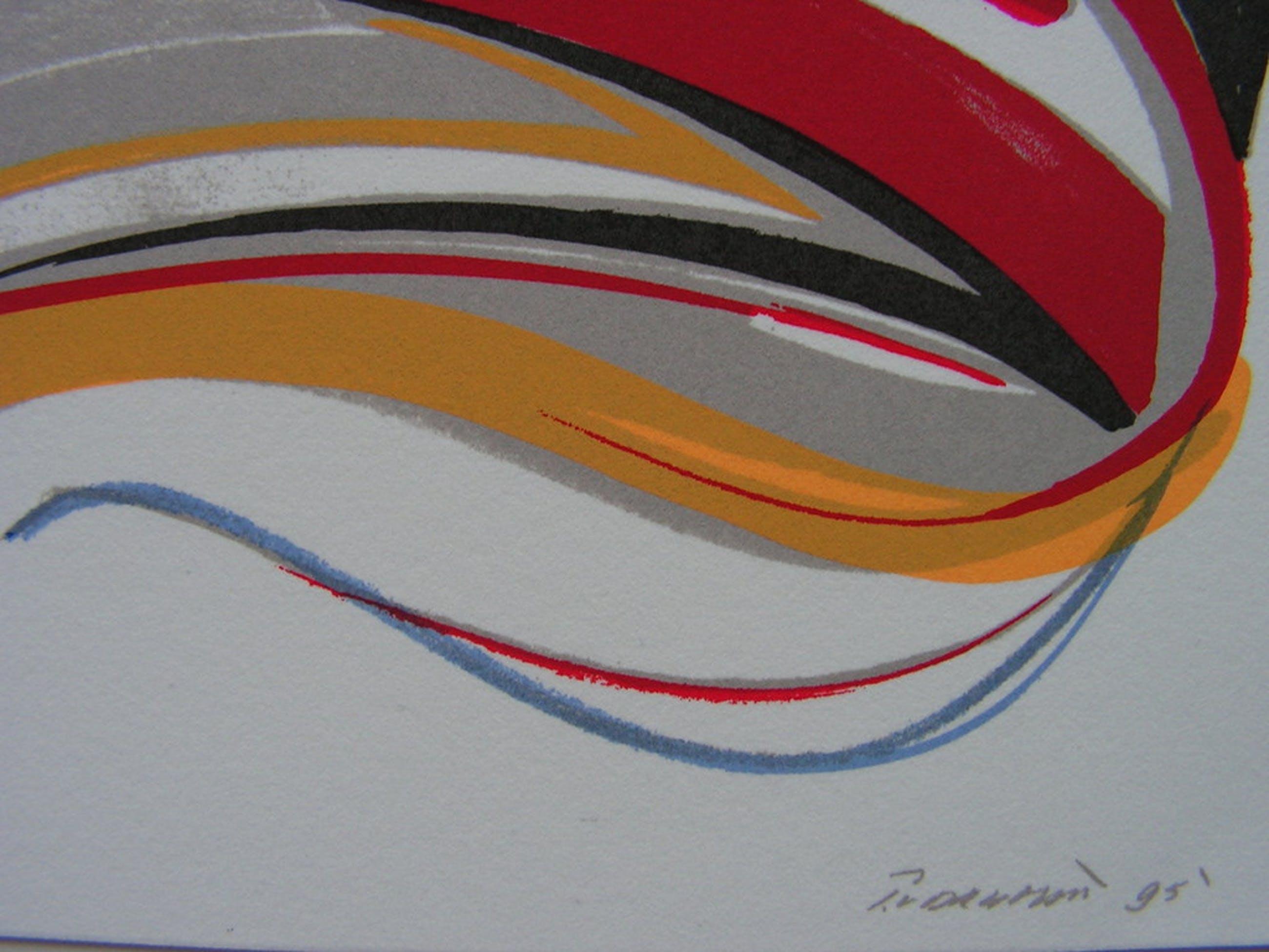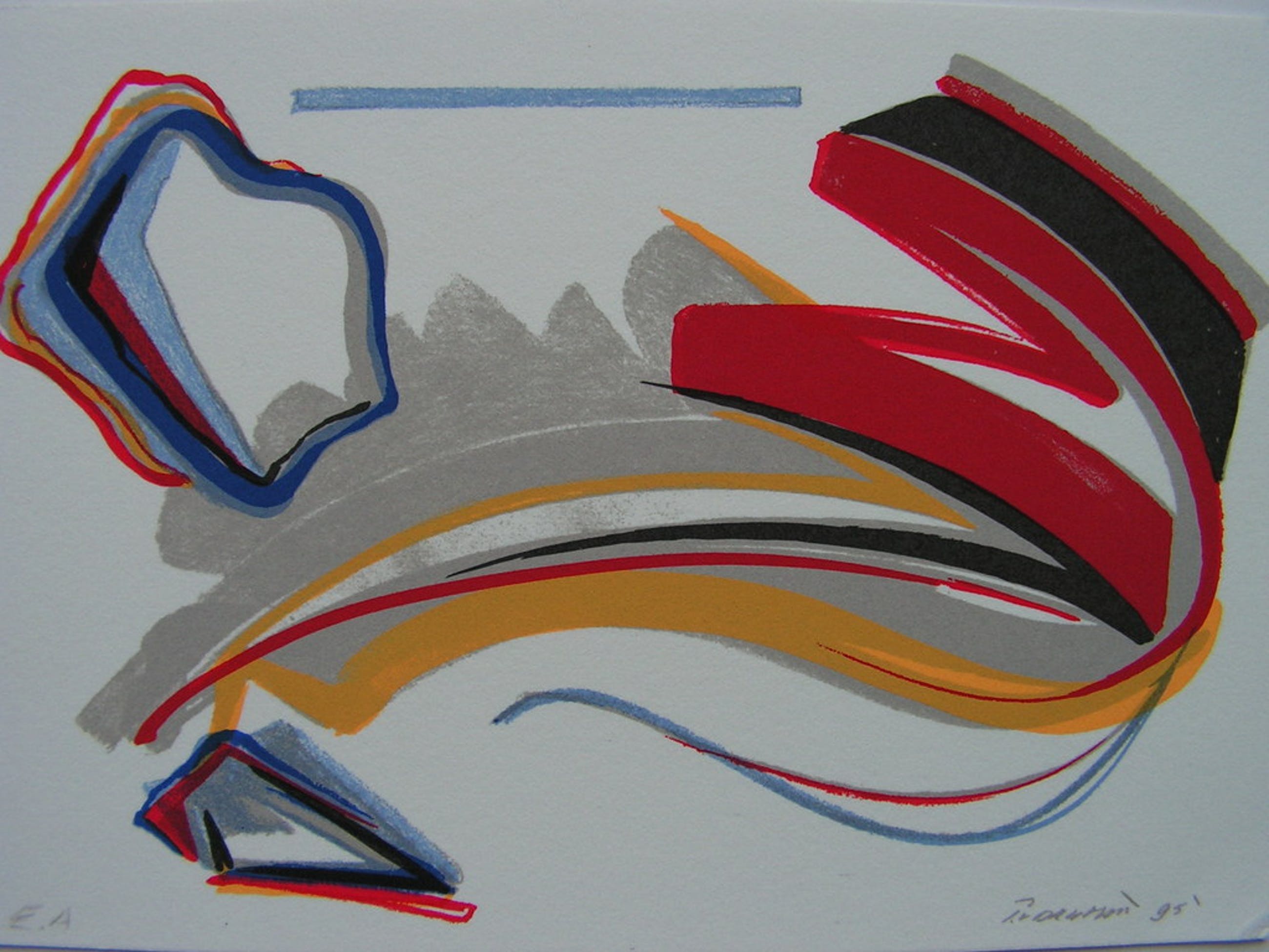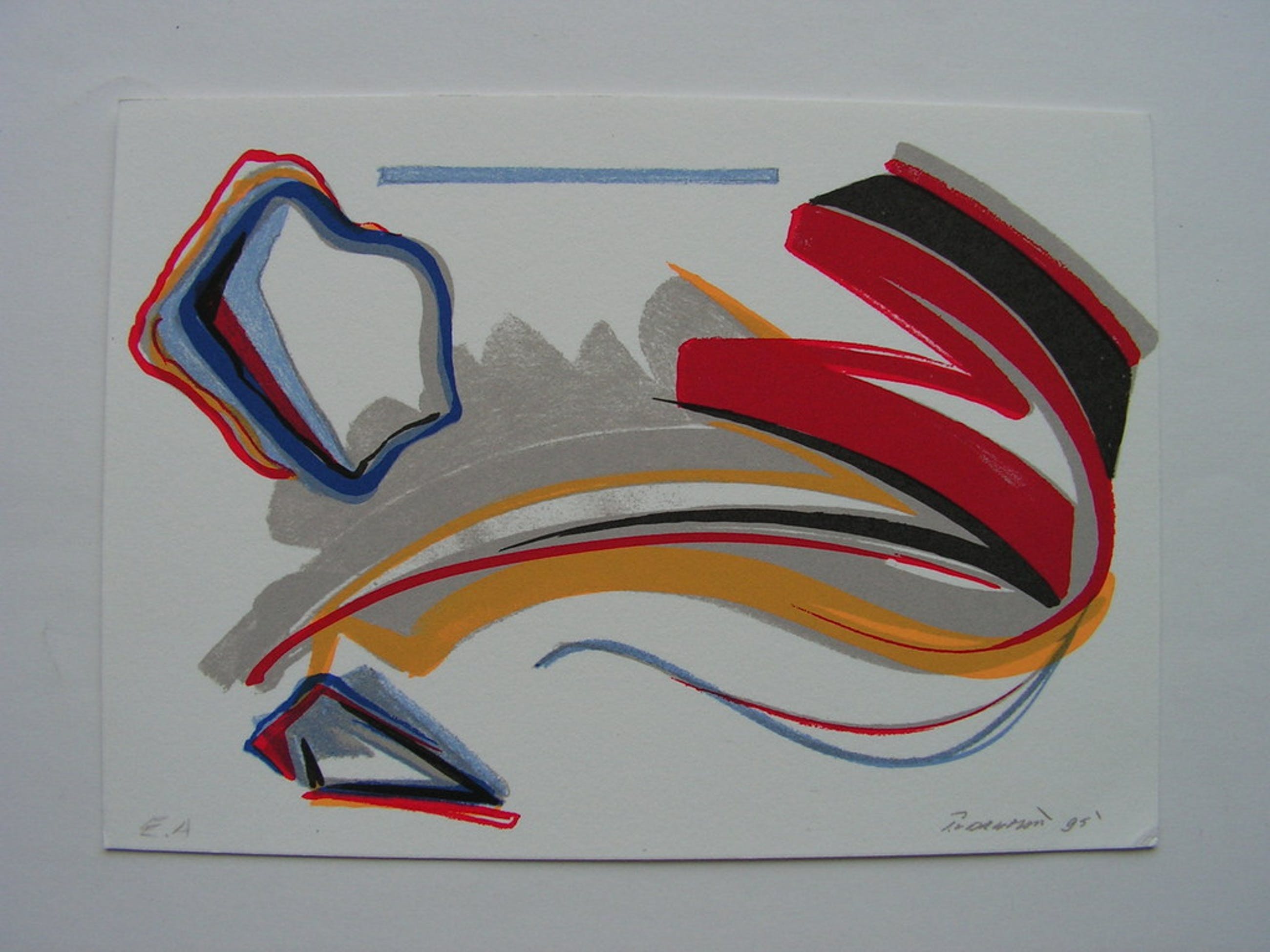 Zeefdruk in de bekende felle kleuren van Peter van Drumpt.