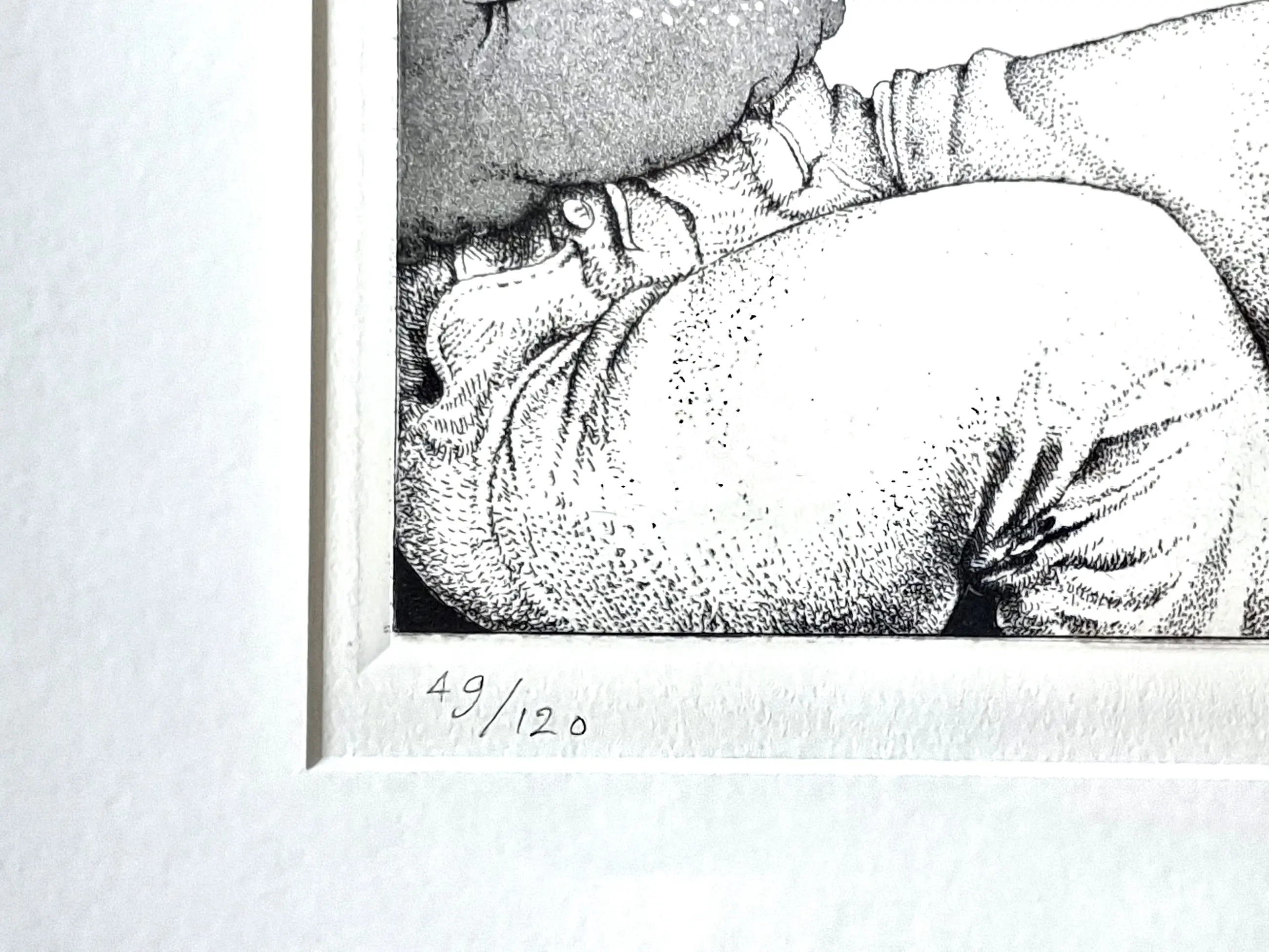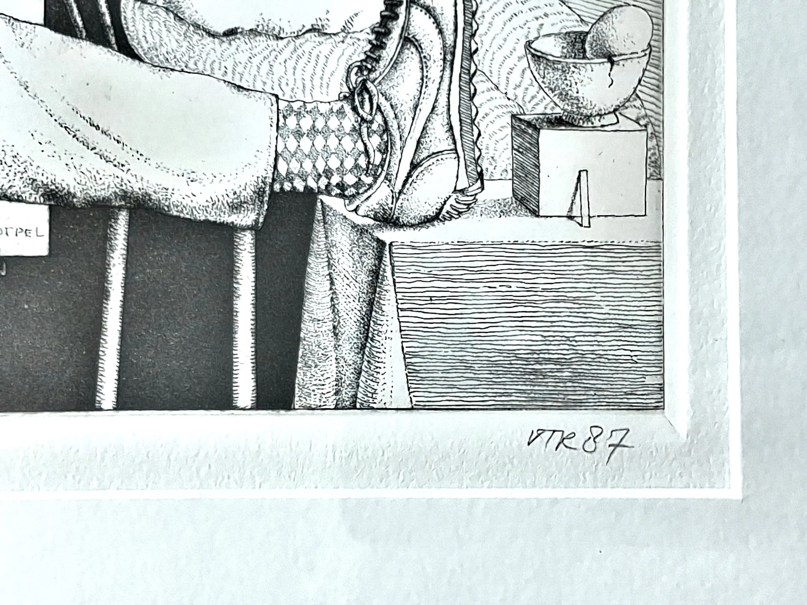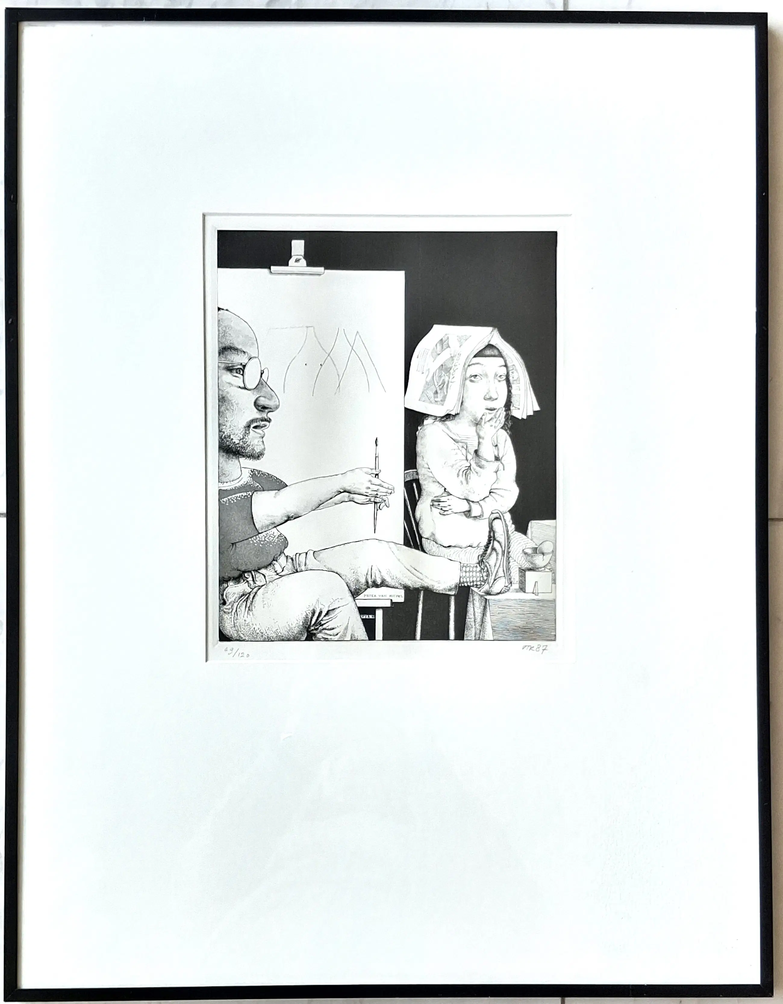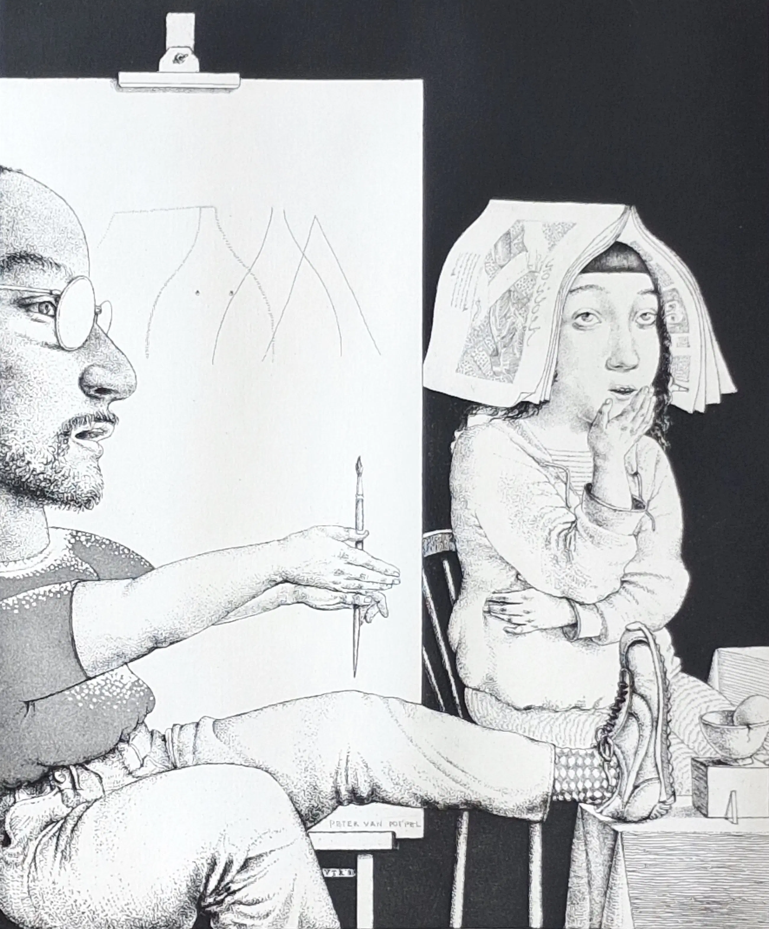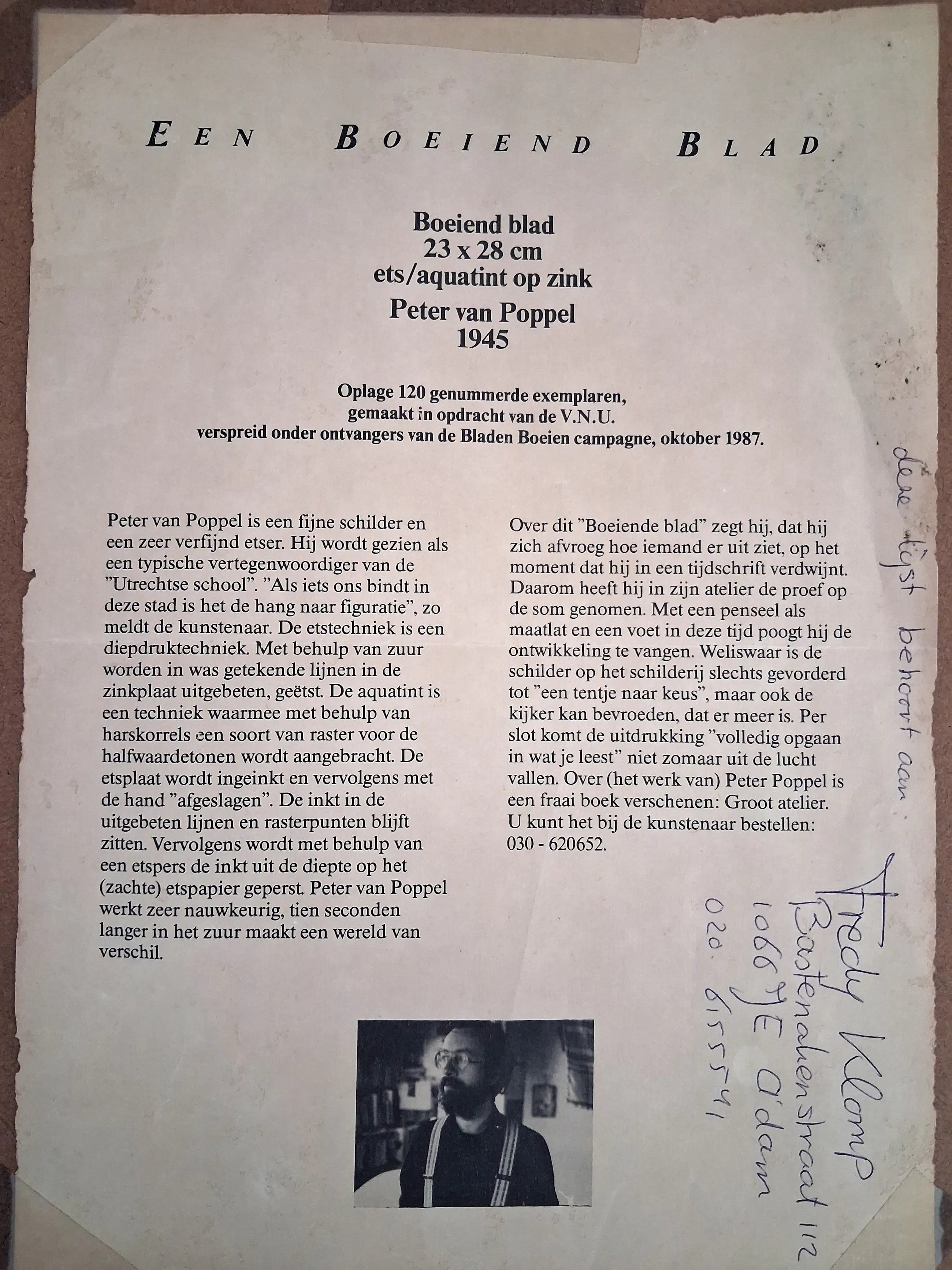 Kenmerkende ets van Peter van Poppel, met potlood genummerd, gesigneerd en gedateerd. Ook signatuur in beeld, aan de onderkant van de tekening op de ezel. Daar ook VTR, waarmee hij vaak signeerde. Etiket op achterkant.