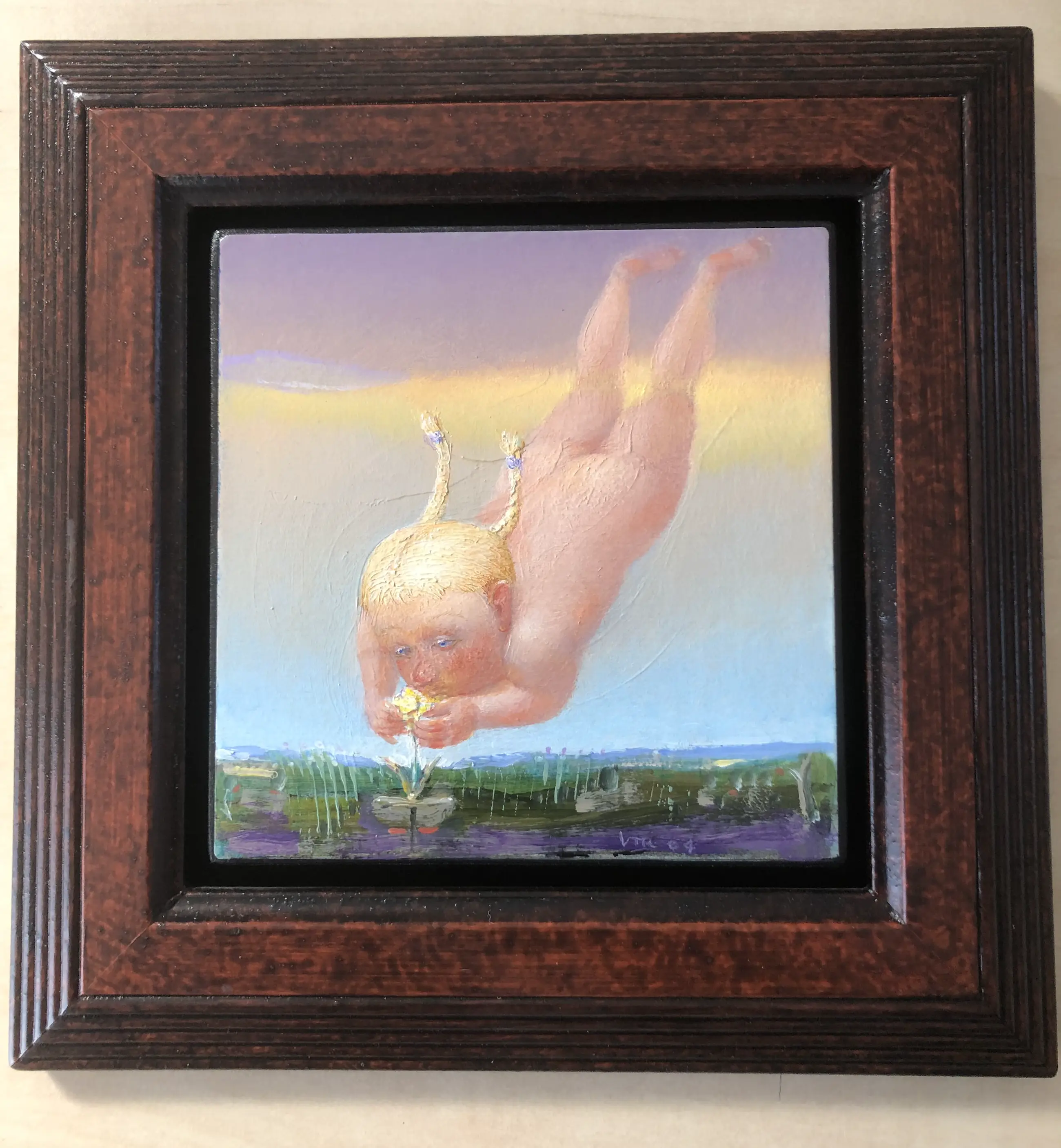 Klein lief schilderijtje van een naakte vrouw die in de lente naar de eerste bloem duikt .