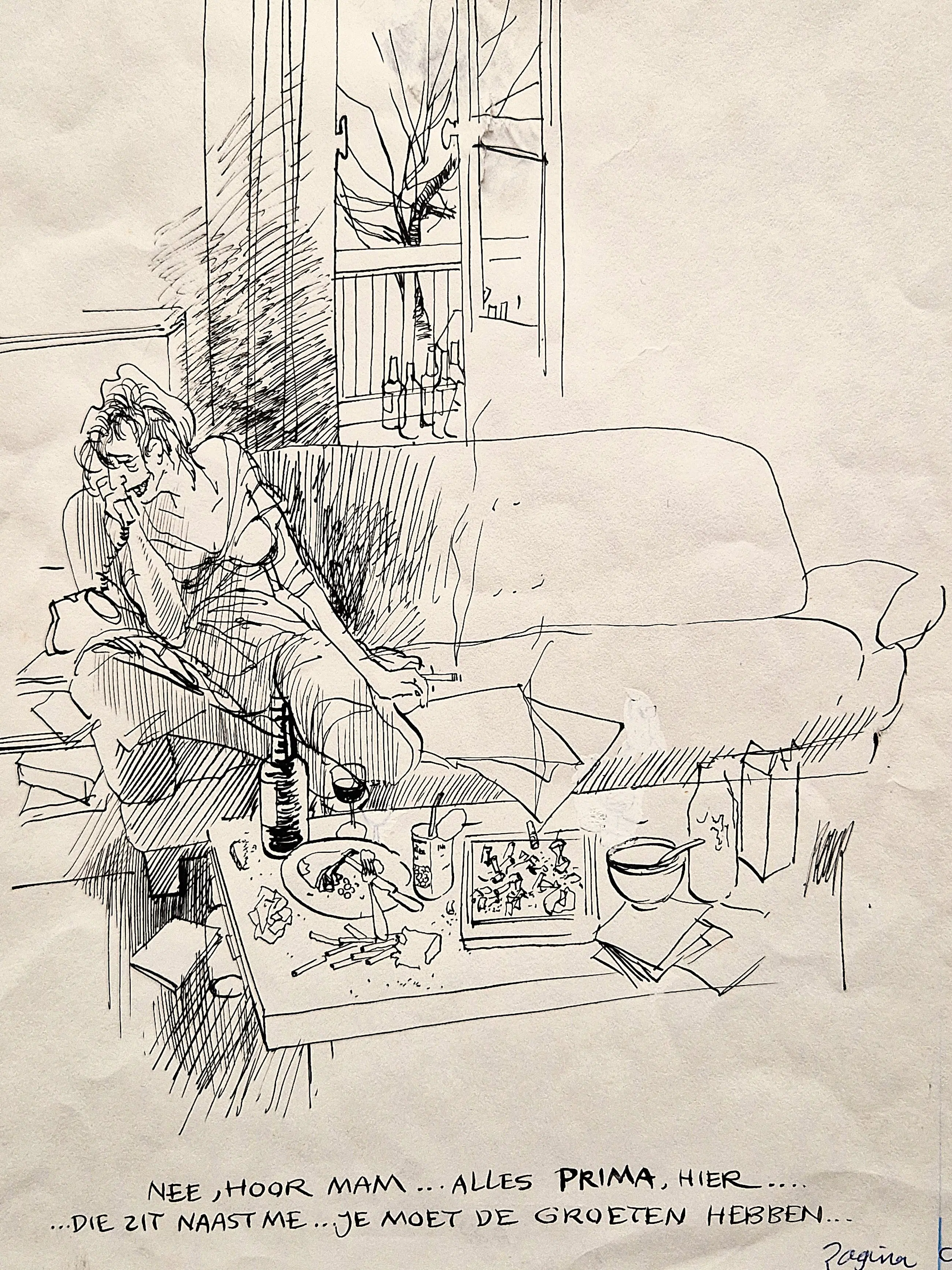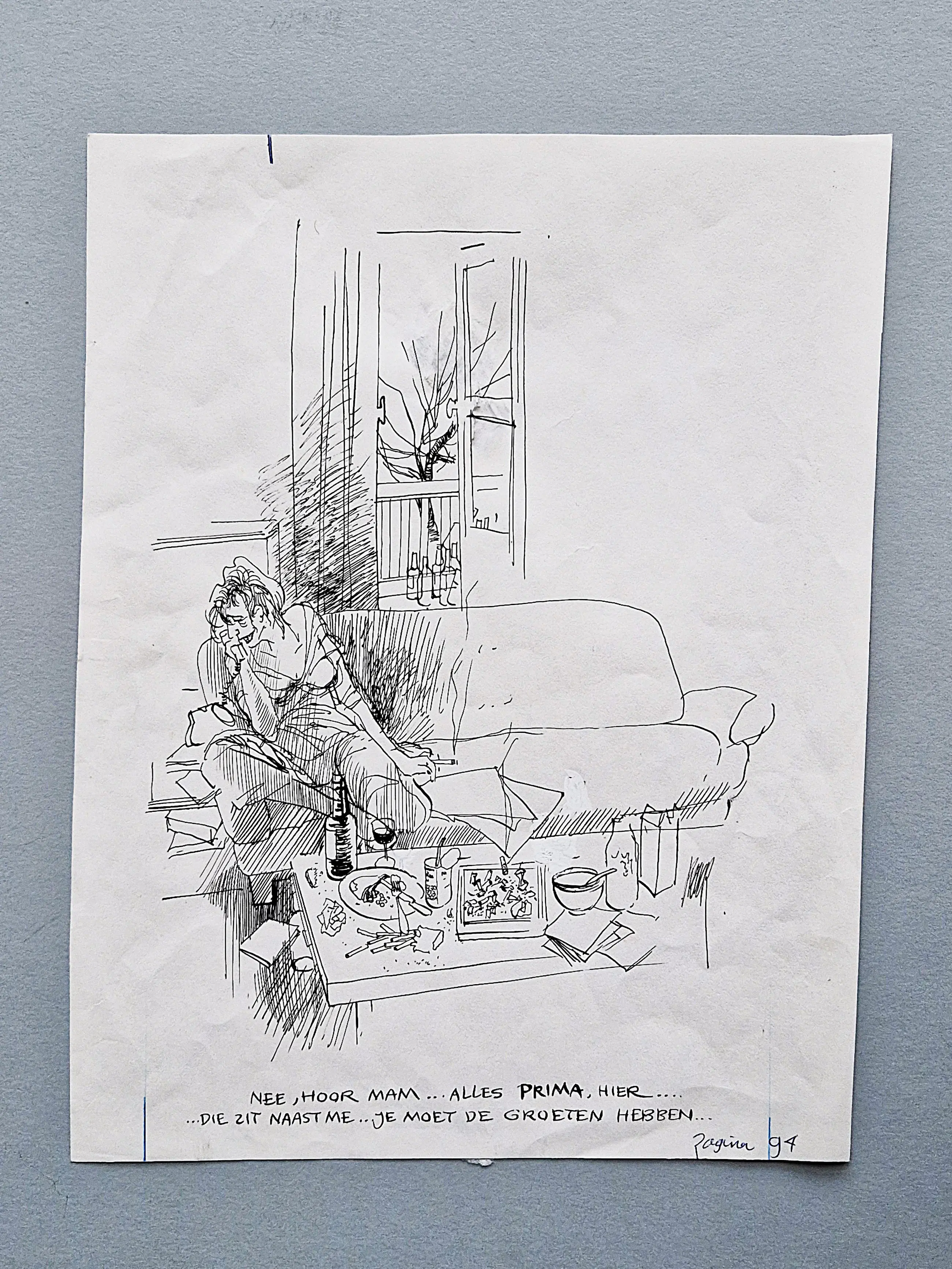- Karakteristieke peter van Straaten inkt-tekening in redelijk goede staat (met alleen in "de boom" wat onregelmatigheden) Her en der in de tekening heeft de kunstenaar een beetje typex gebruikt. Waarschijnlijk is de tekening een keer gebruikt om af te drukken. Gesigneerd rechts midden.