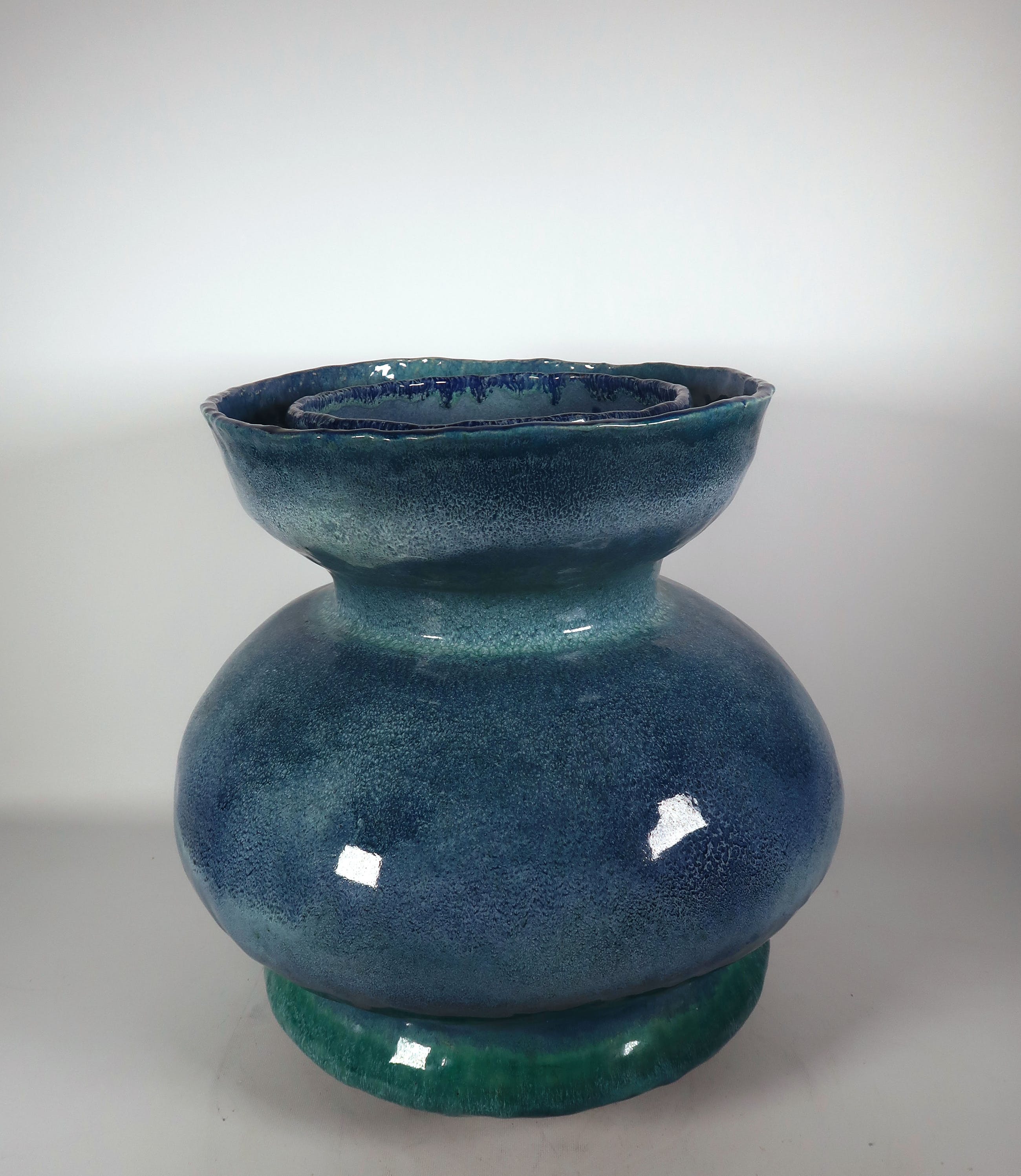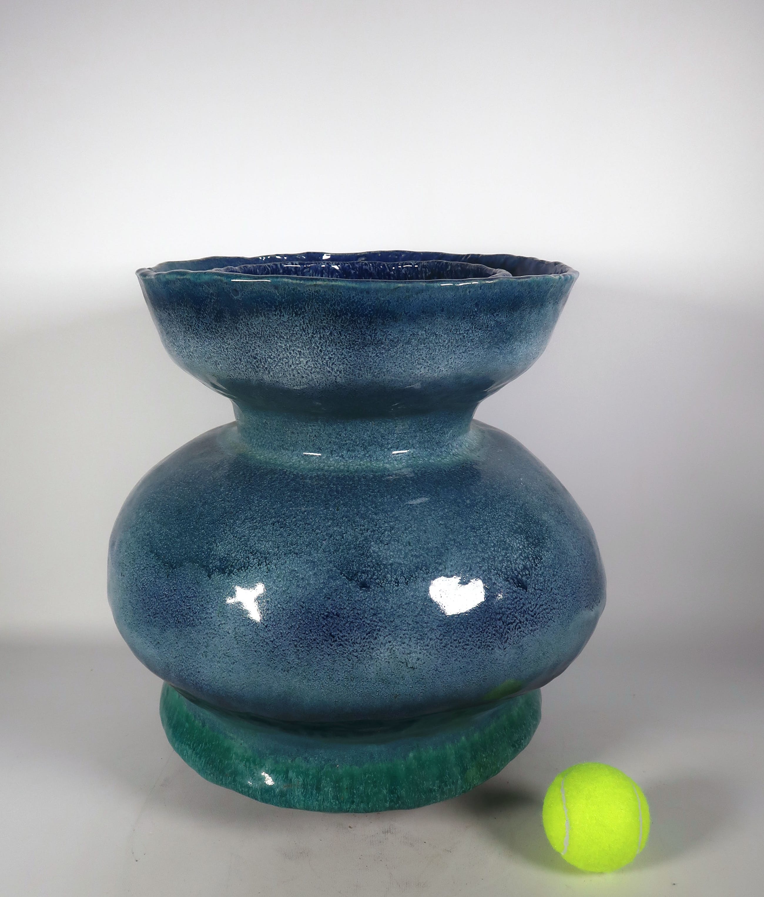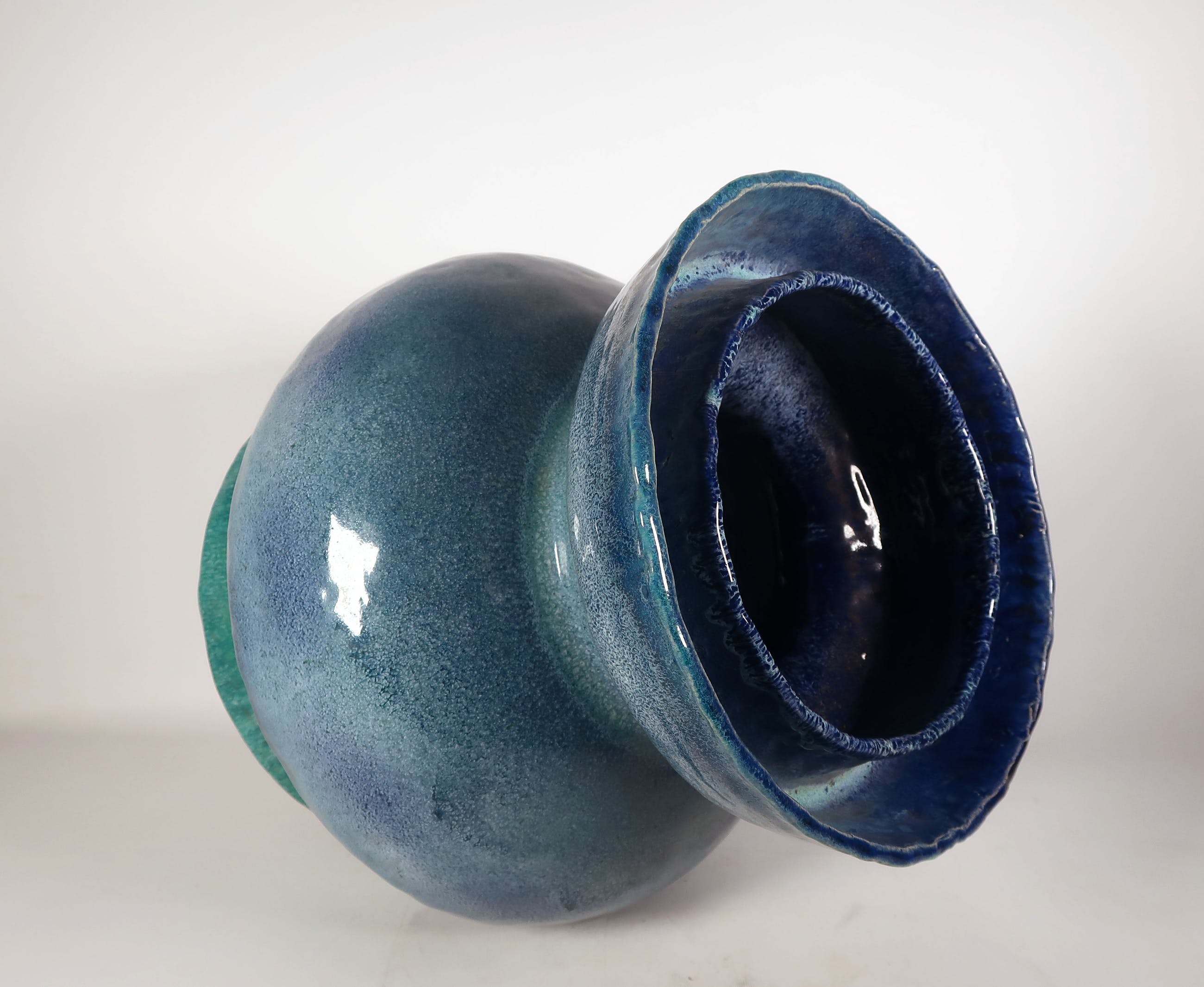 Handgemaakte grote blauwe bolle vaas met dubbele rand van keramist Peter von Hartsvelt Müller.