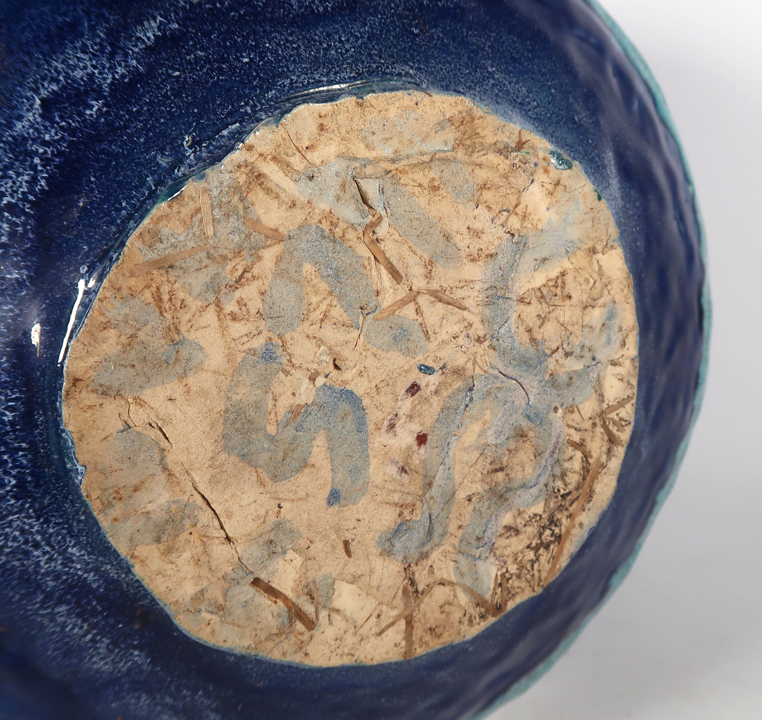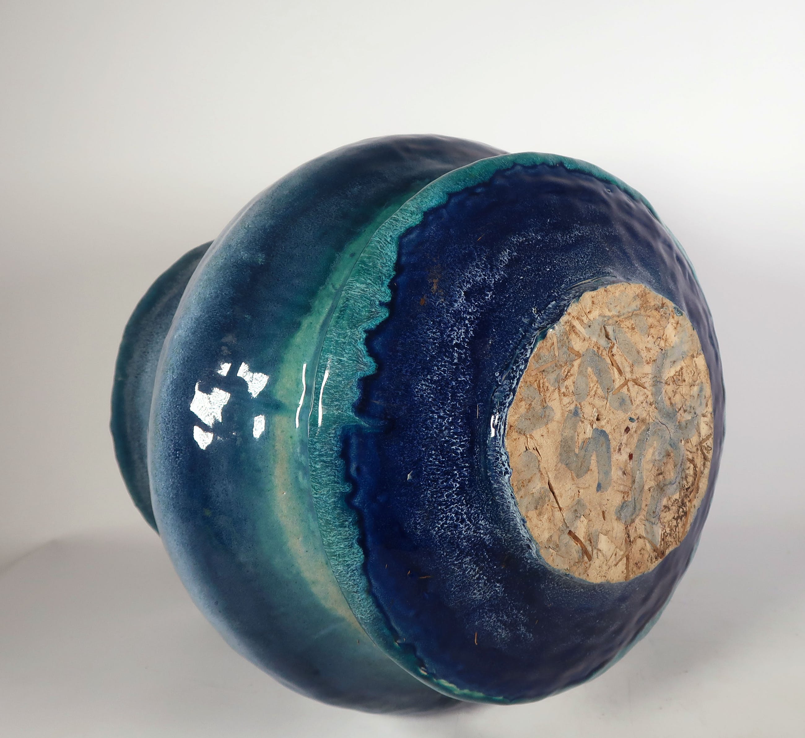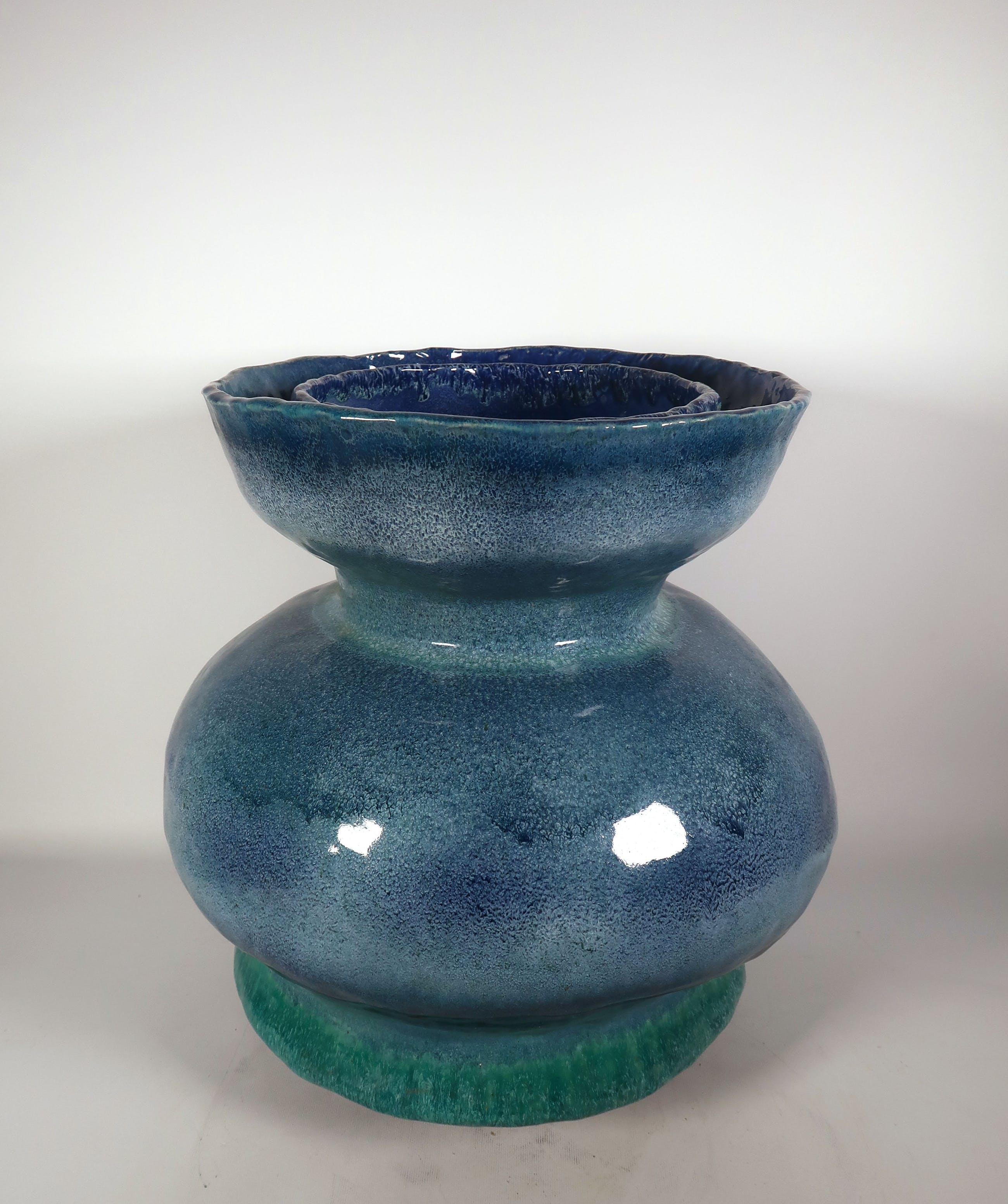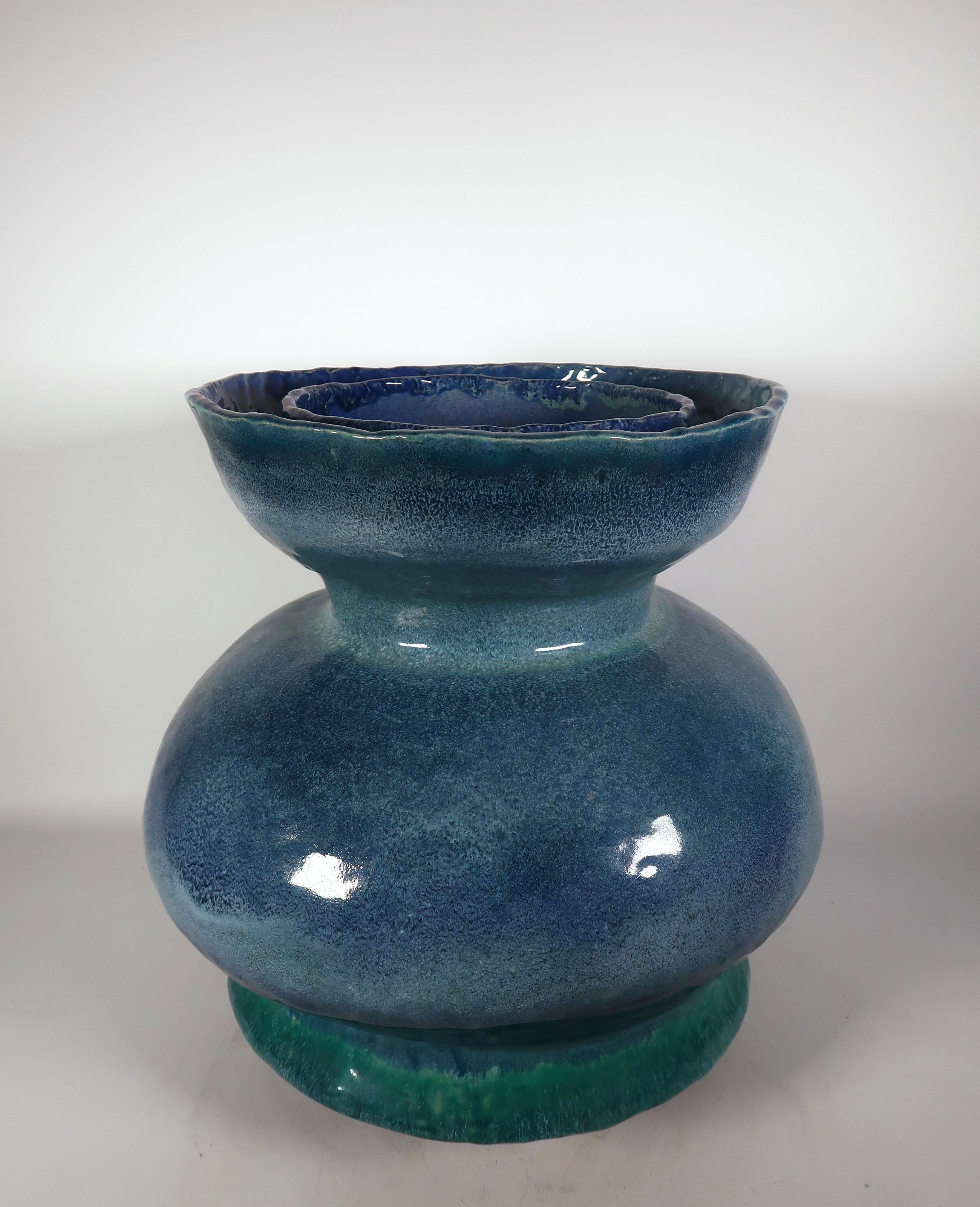Handgemaakte grote blauwe bolle vaas met dubbele rand van keramist Peter von Hartsvelt Müller.