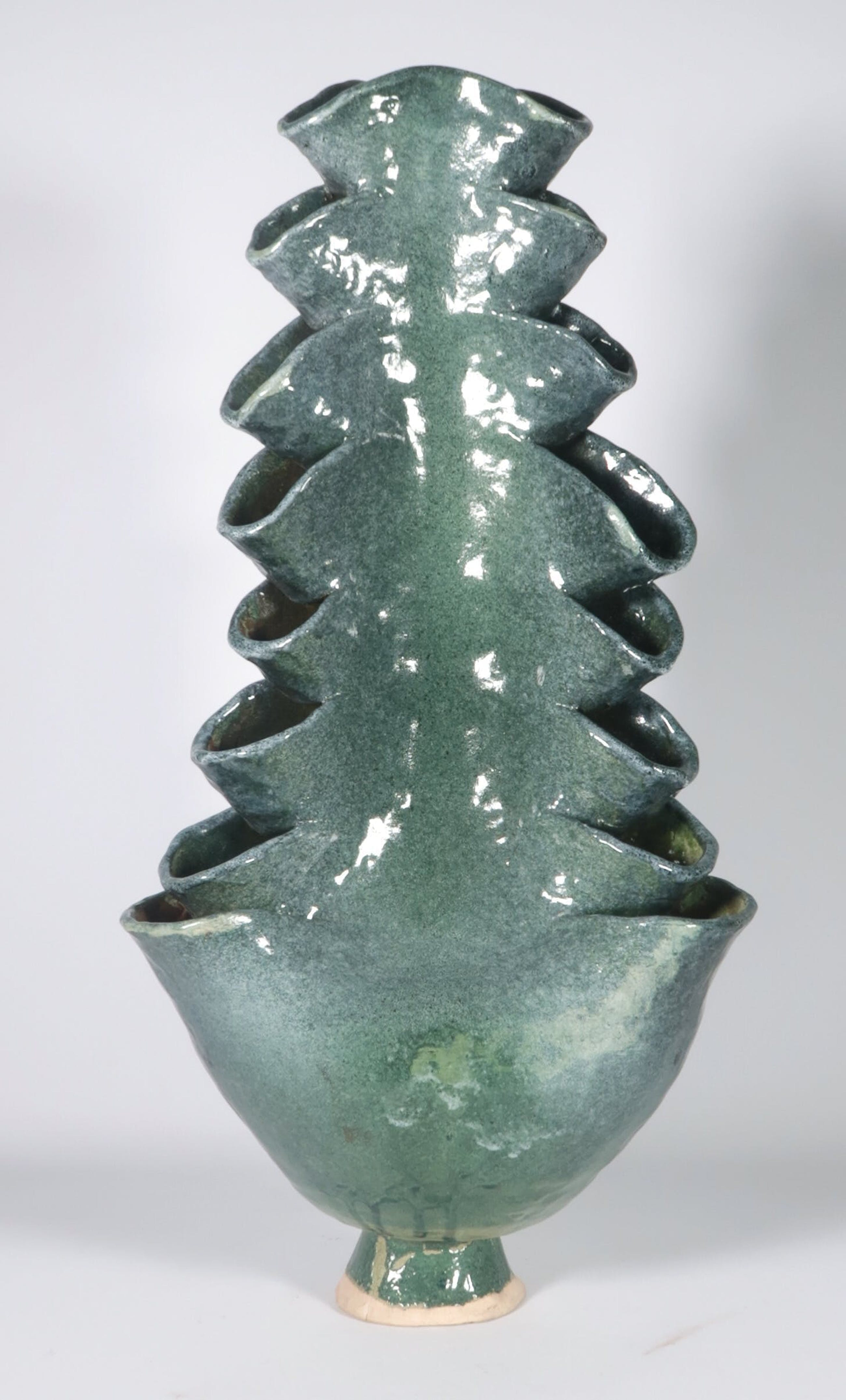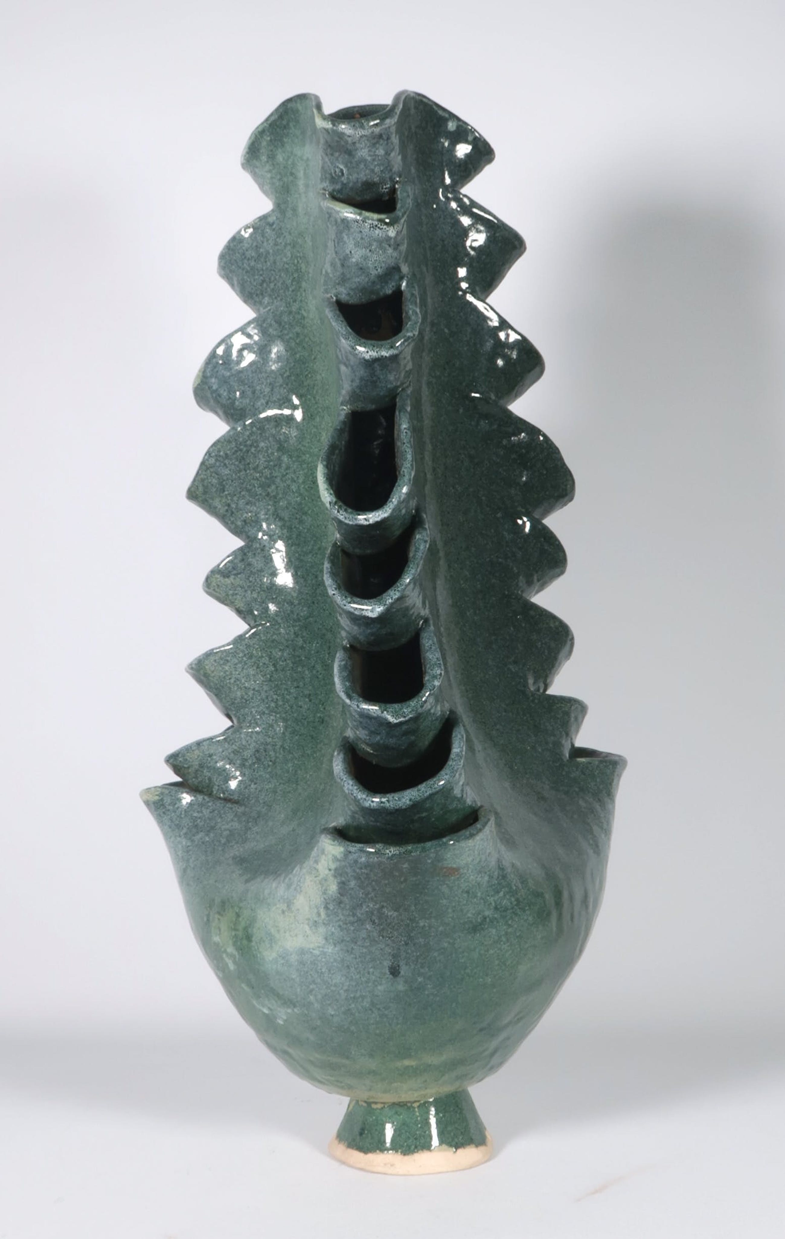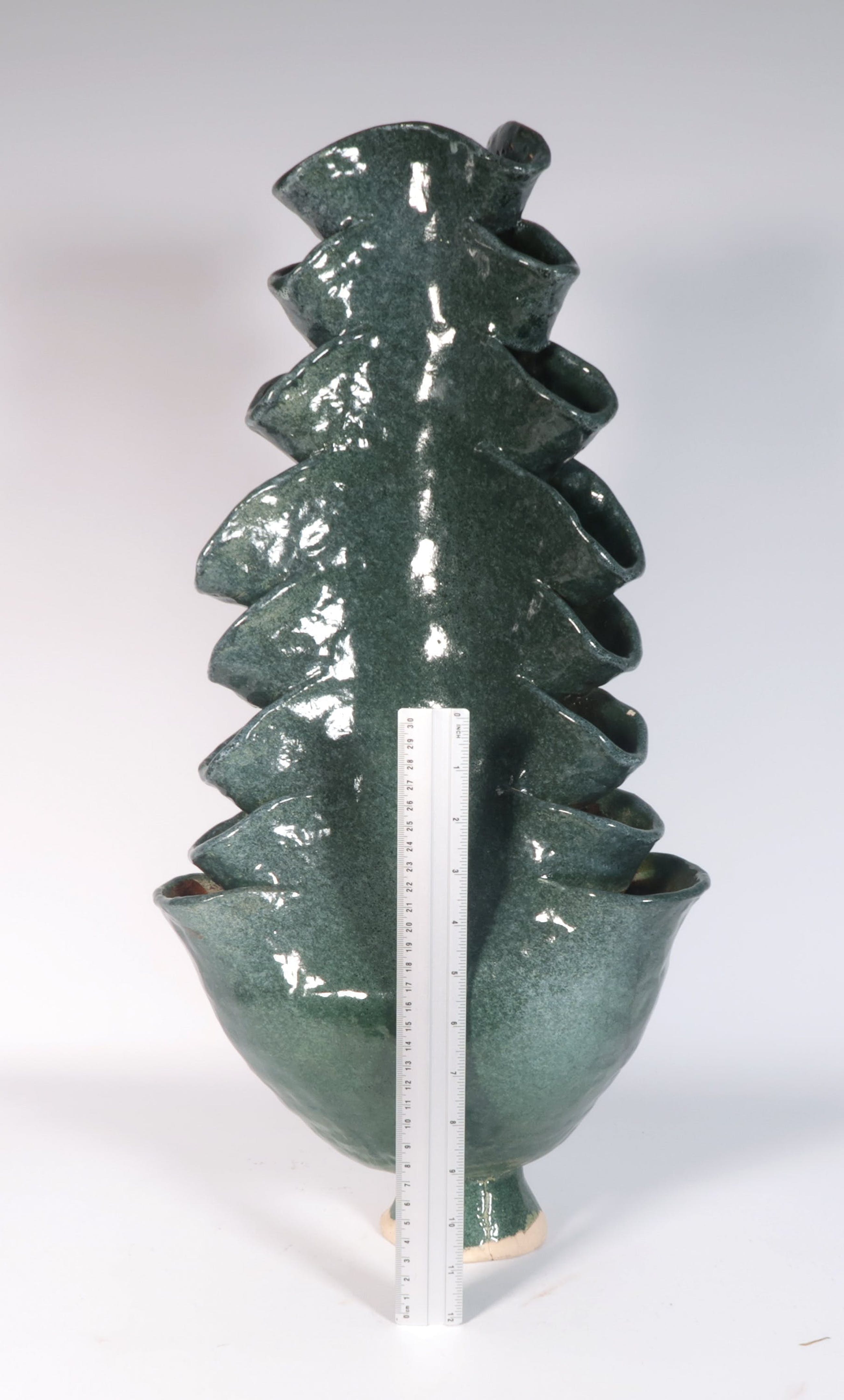 Handgemaakte groenblauwe geglazuurde tulpenvaas van keramist Peter von Hartsvelt Müller. De vaas is in goede staat, maar het voetje heeft een bakscheur.