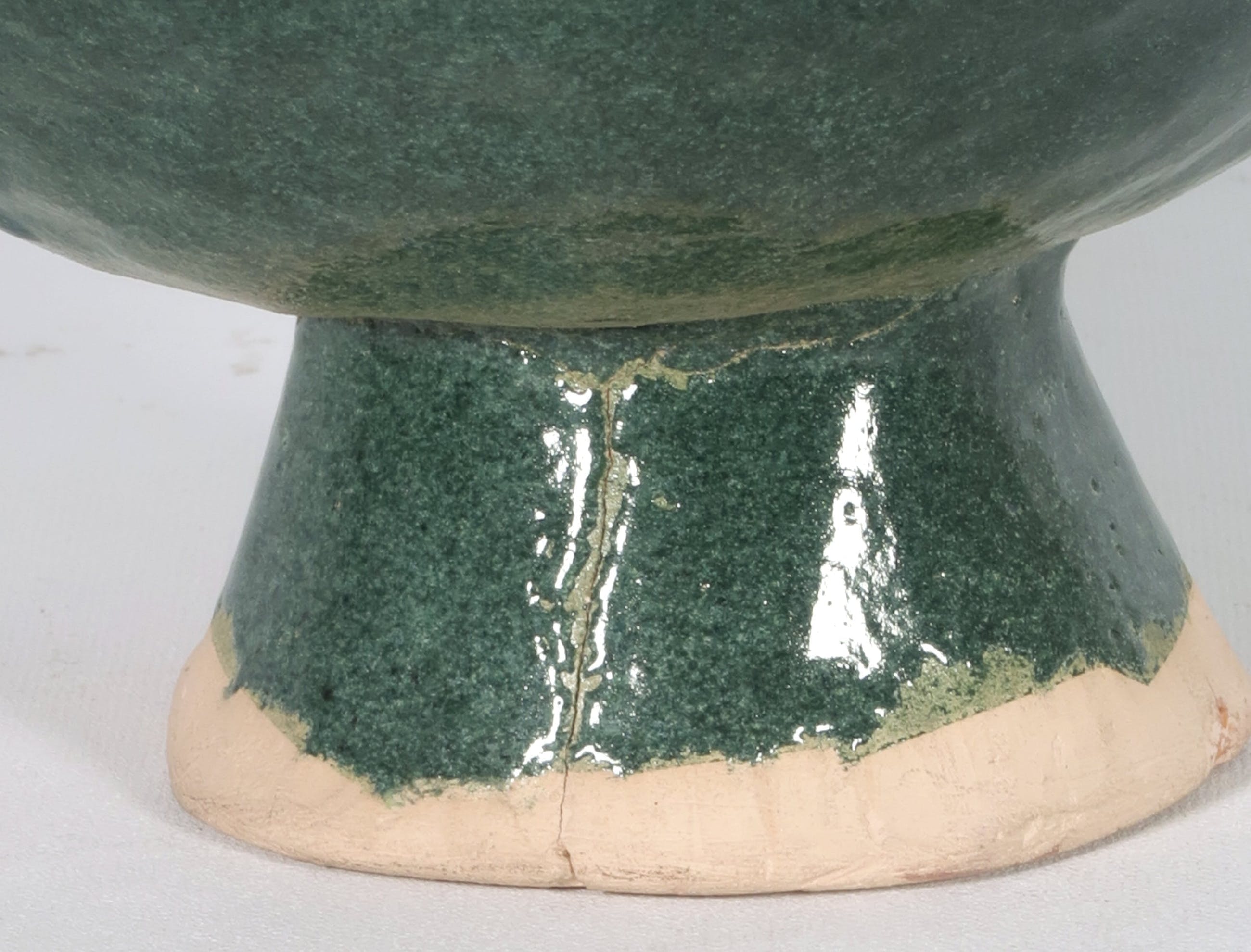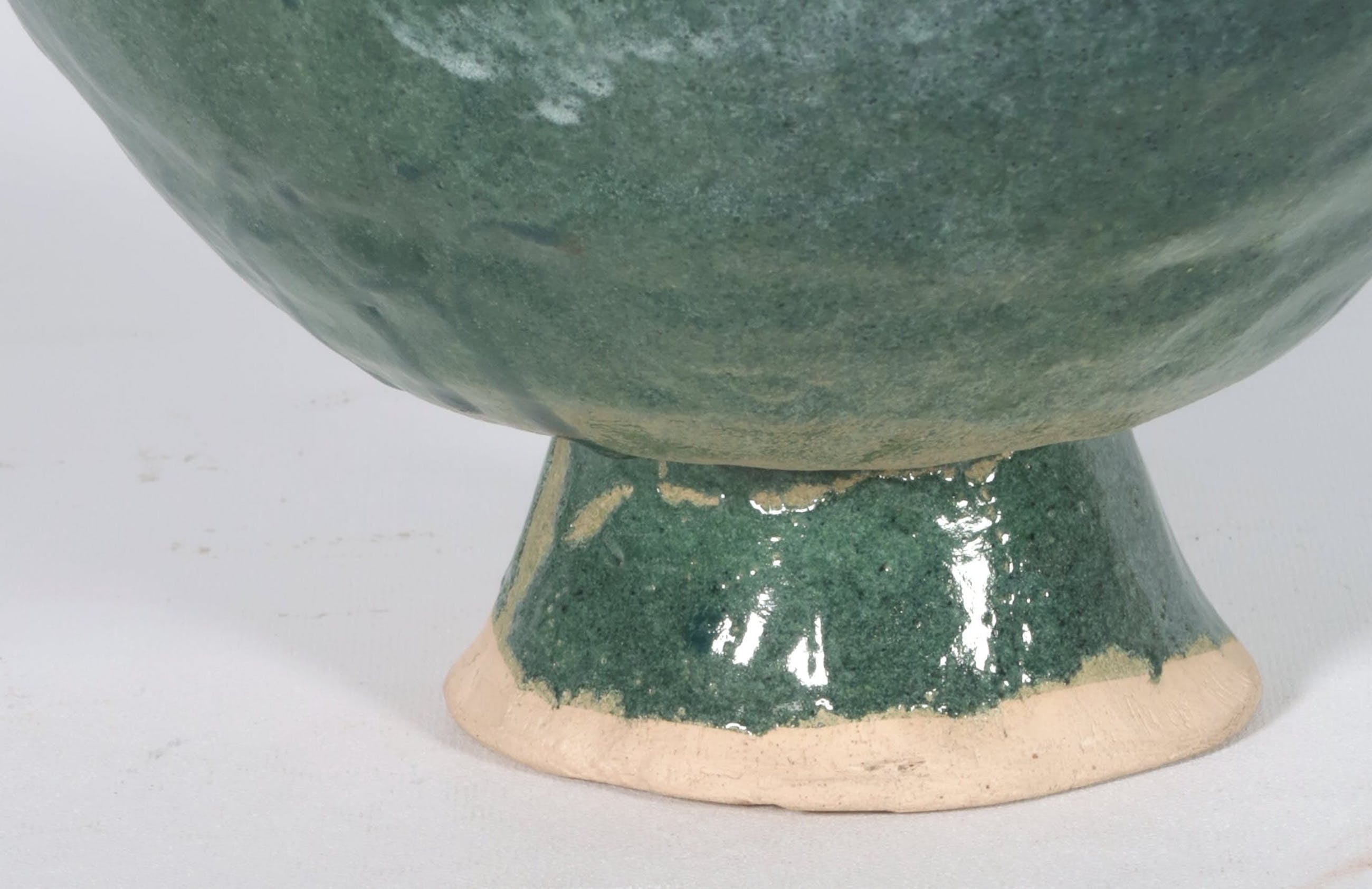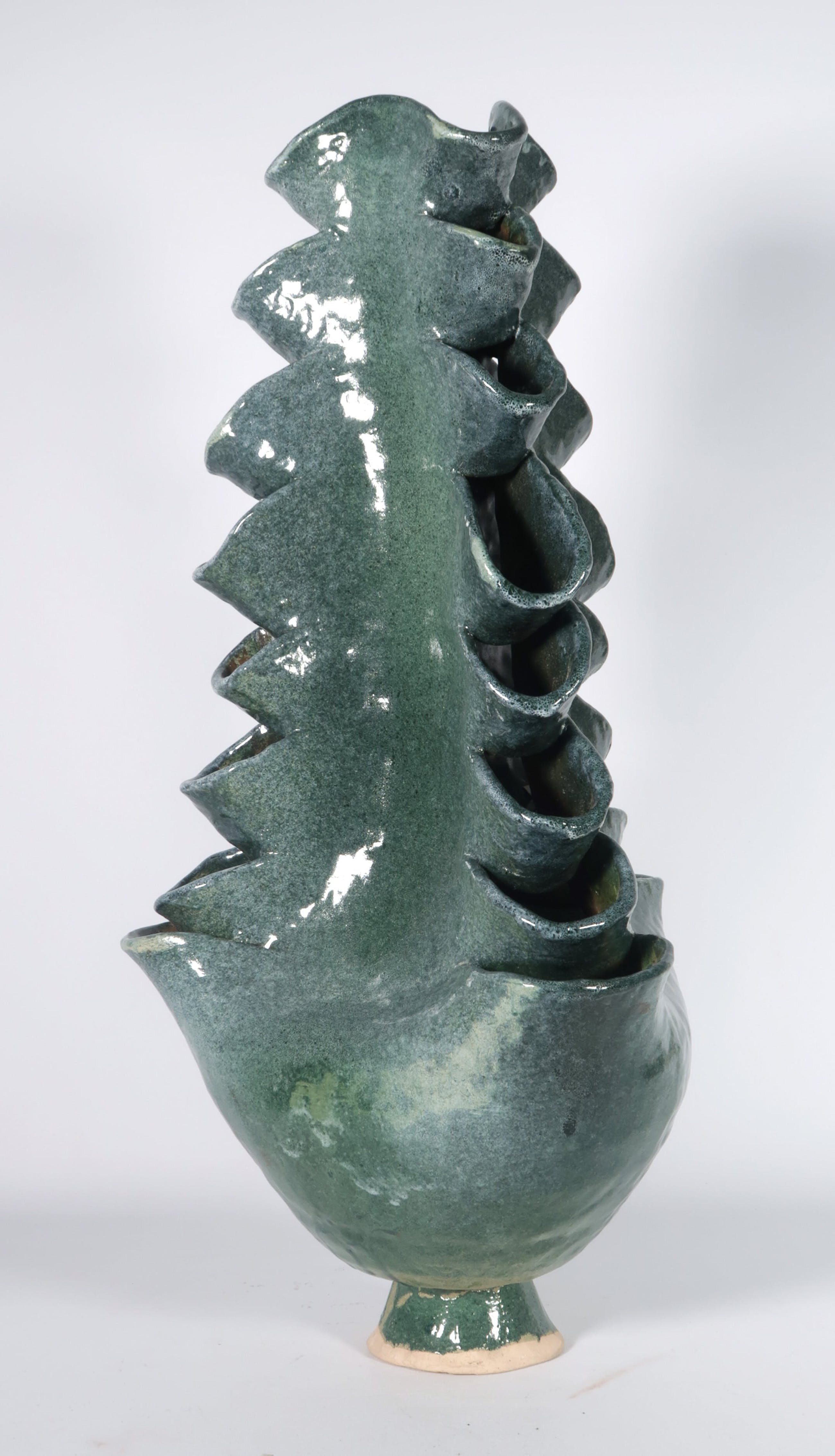 Handgemaakte groenblauwe geglazuurde tulpenvaas van keramist Peter von Hartsvelt Müller. De vaas is in goede staat, maar het voetje heeft een bakscheur.