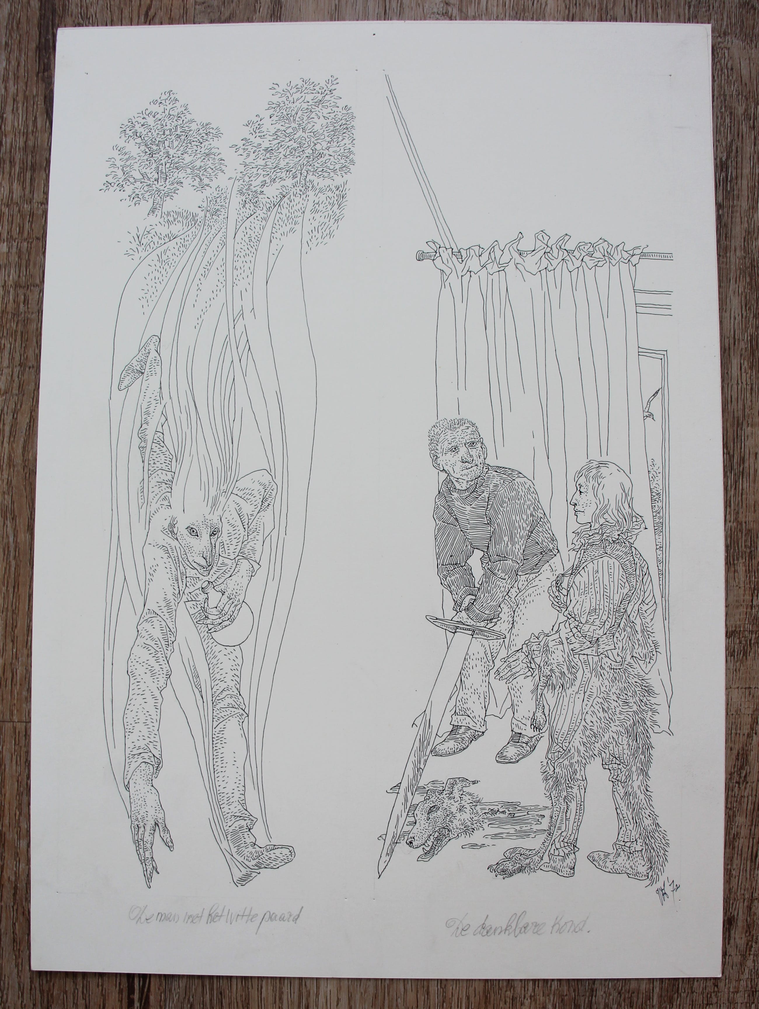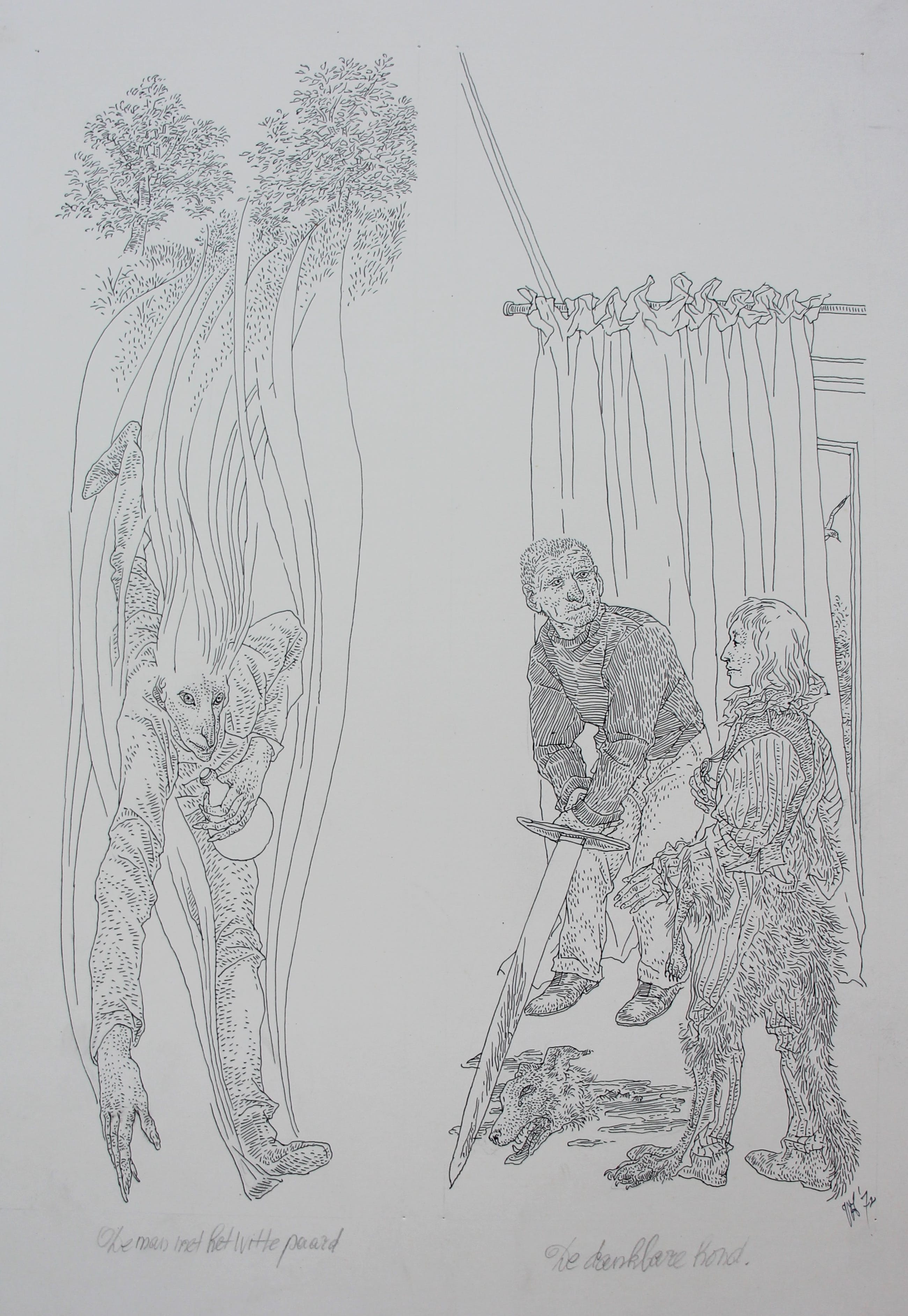 2 tekeningen (pen en inkt) op 1 blad voor een boek Waarschijnlijk Sprookjes van de lage landen). Jaar: 1972. Afmetingen blad: H34,3 x b24 cm. Titel tekening 1: De man met het witte paard. Titel tekening 2: De dankbare hond. Het boek wordt meegeleverd. De authenticiteit van het aangeboden werk wordt volledig gegarandeerd. Een certificaat van echtheid kan, op aanvraag, worden gemaild.