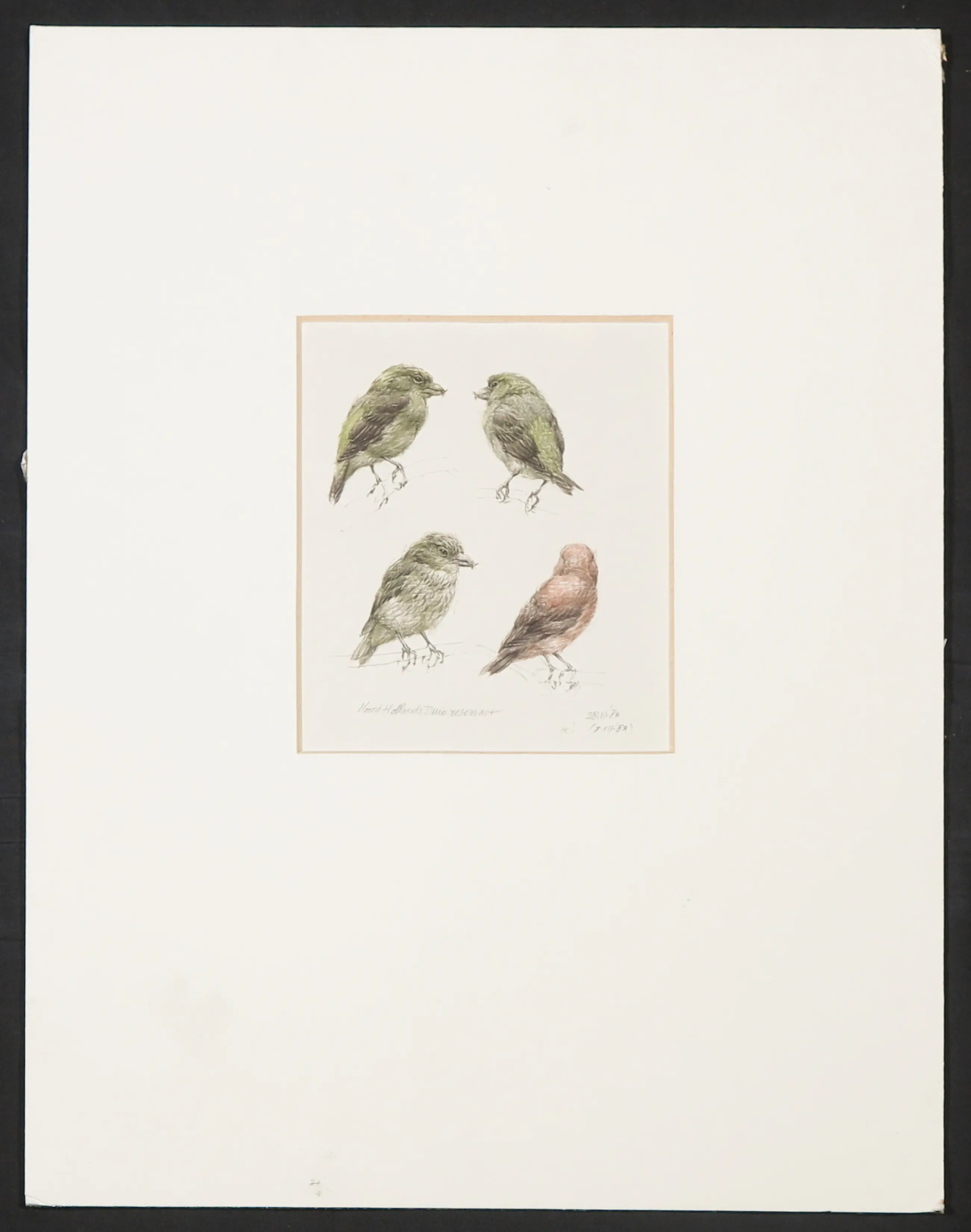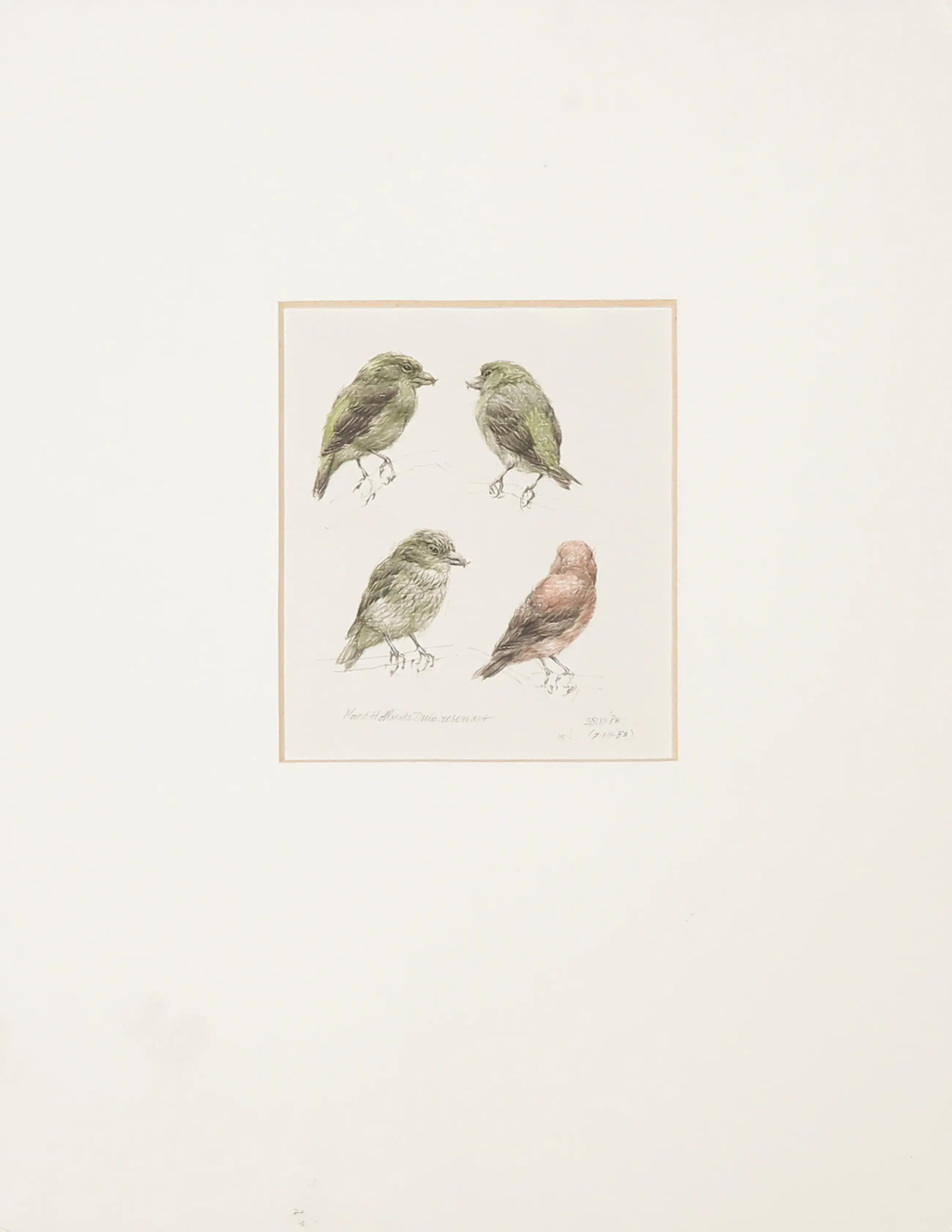 | Het werkje is in zeer goede staat, het papier is echter licht vergeeld. Enkel klein vlekje te zien naast het vogeltje linksonder: dit zou evengoed een spetter van het werken in aquarel kunnen zijn. Daarnaast bevat het Passe-partout wat vegen en is de rechter bovenhoek wat ingedeukt. | |||||||||||