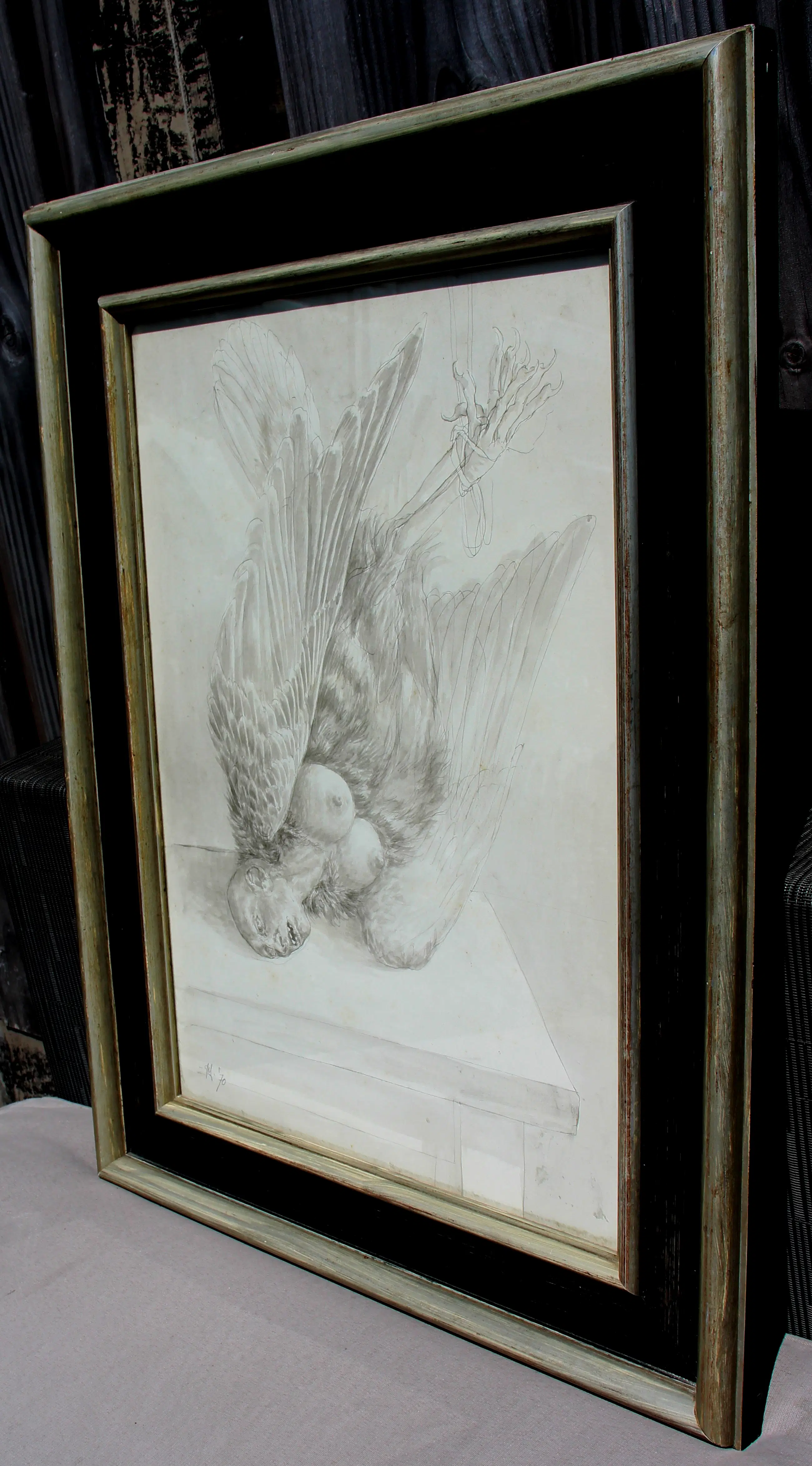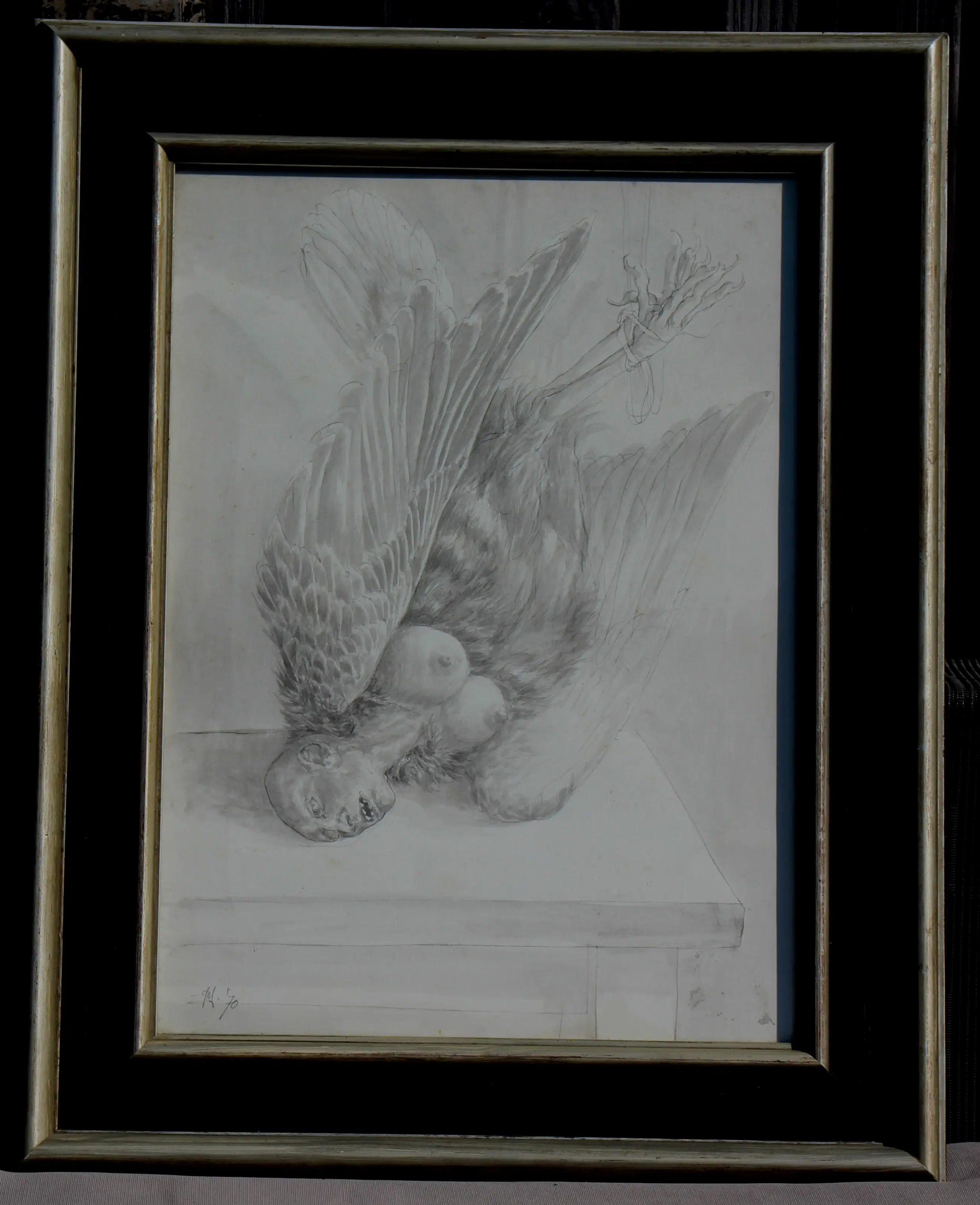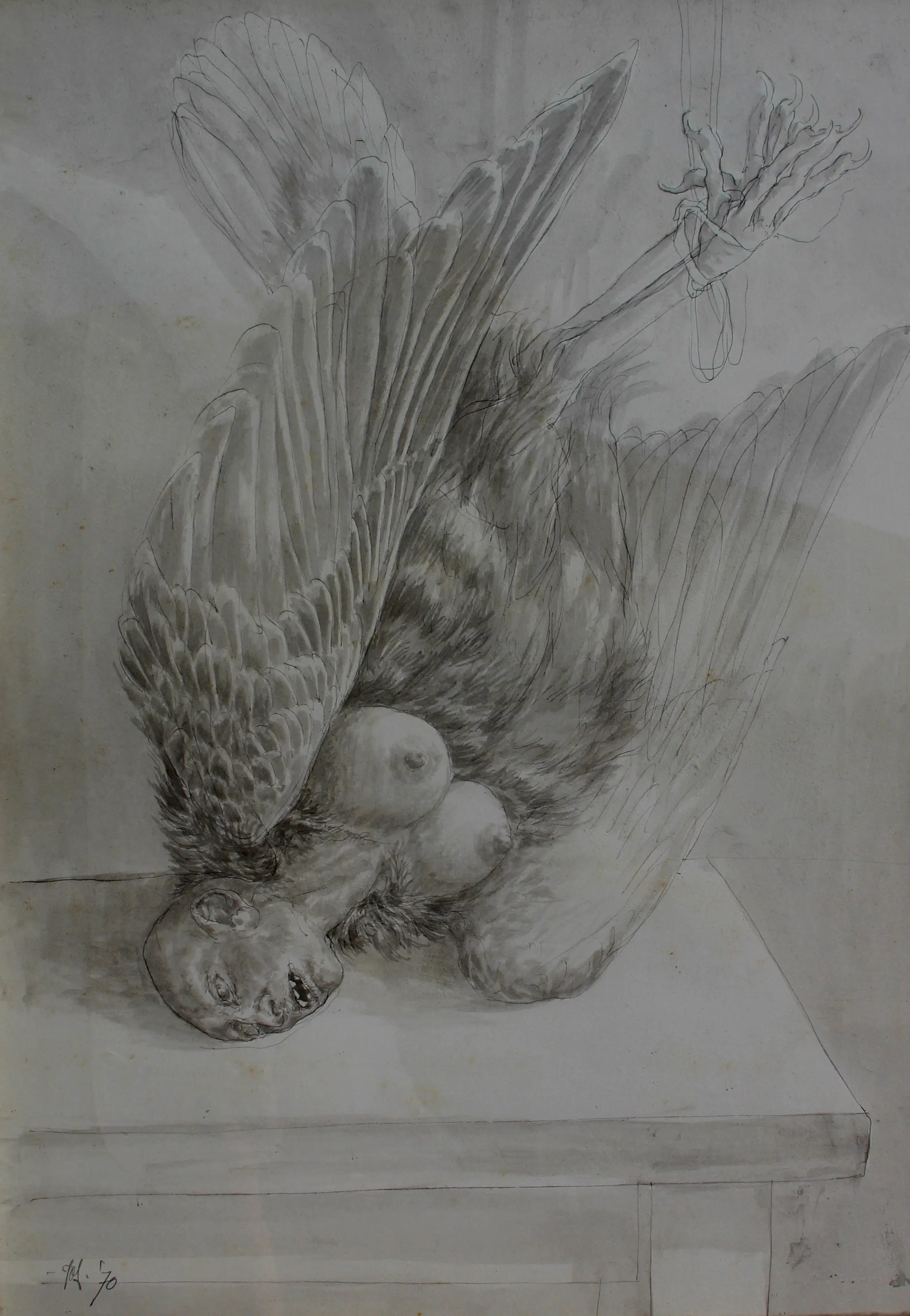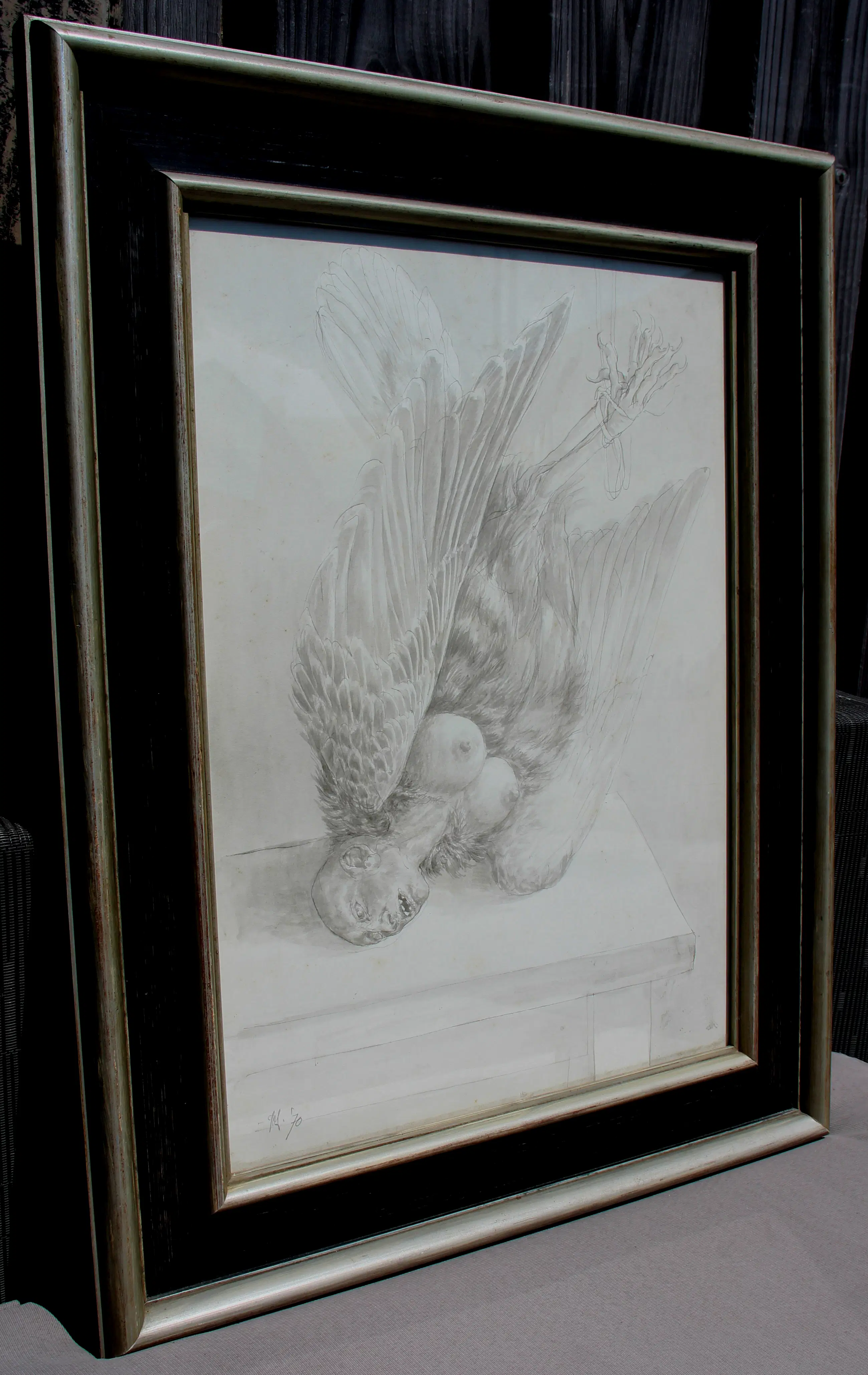 Peter Vos - grote ingelijste tekening: Stilleven van een "harpy" - 1970