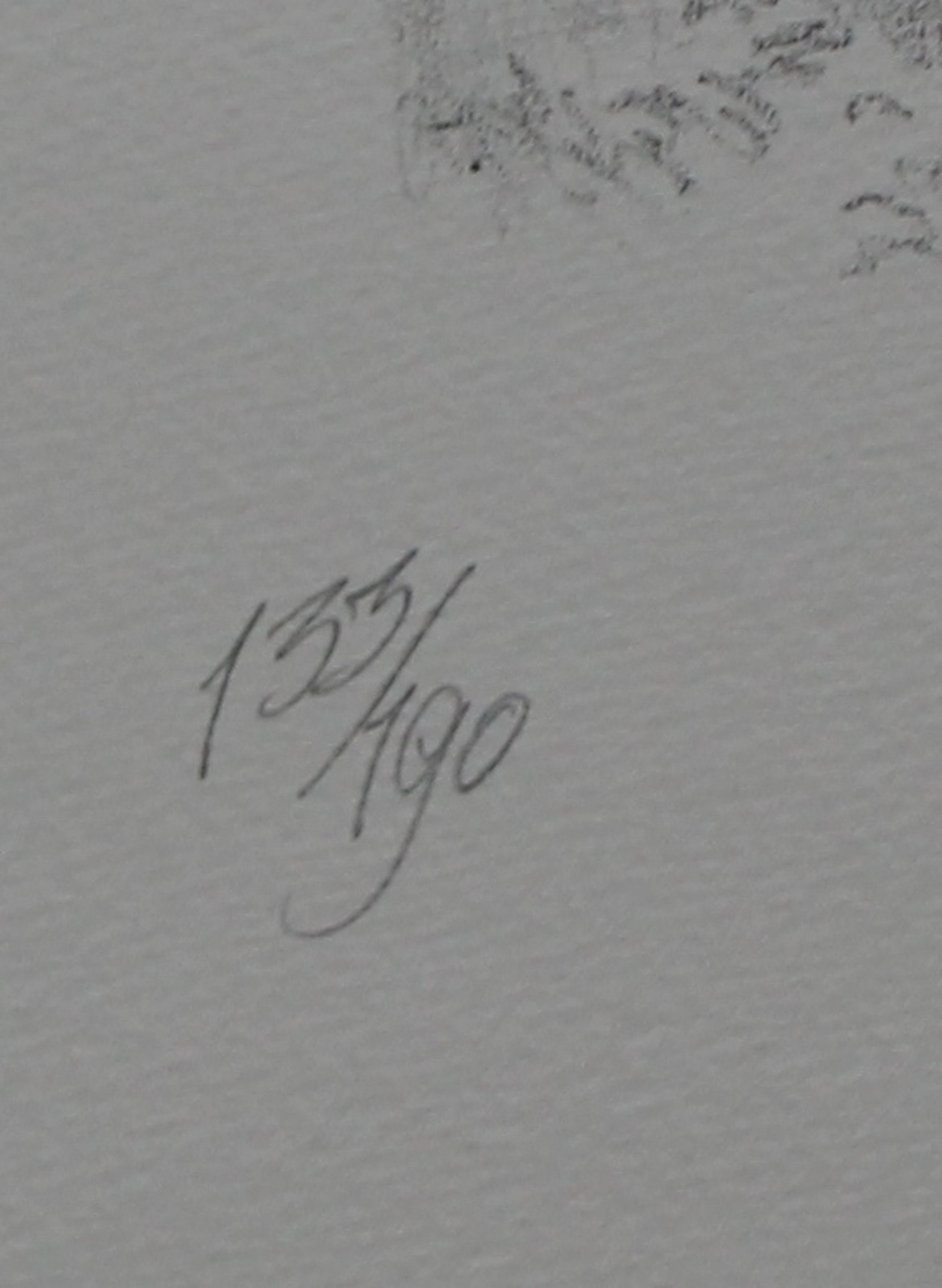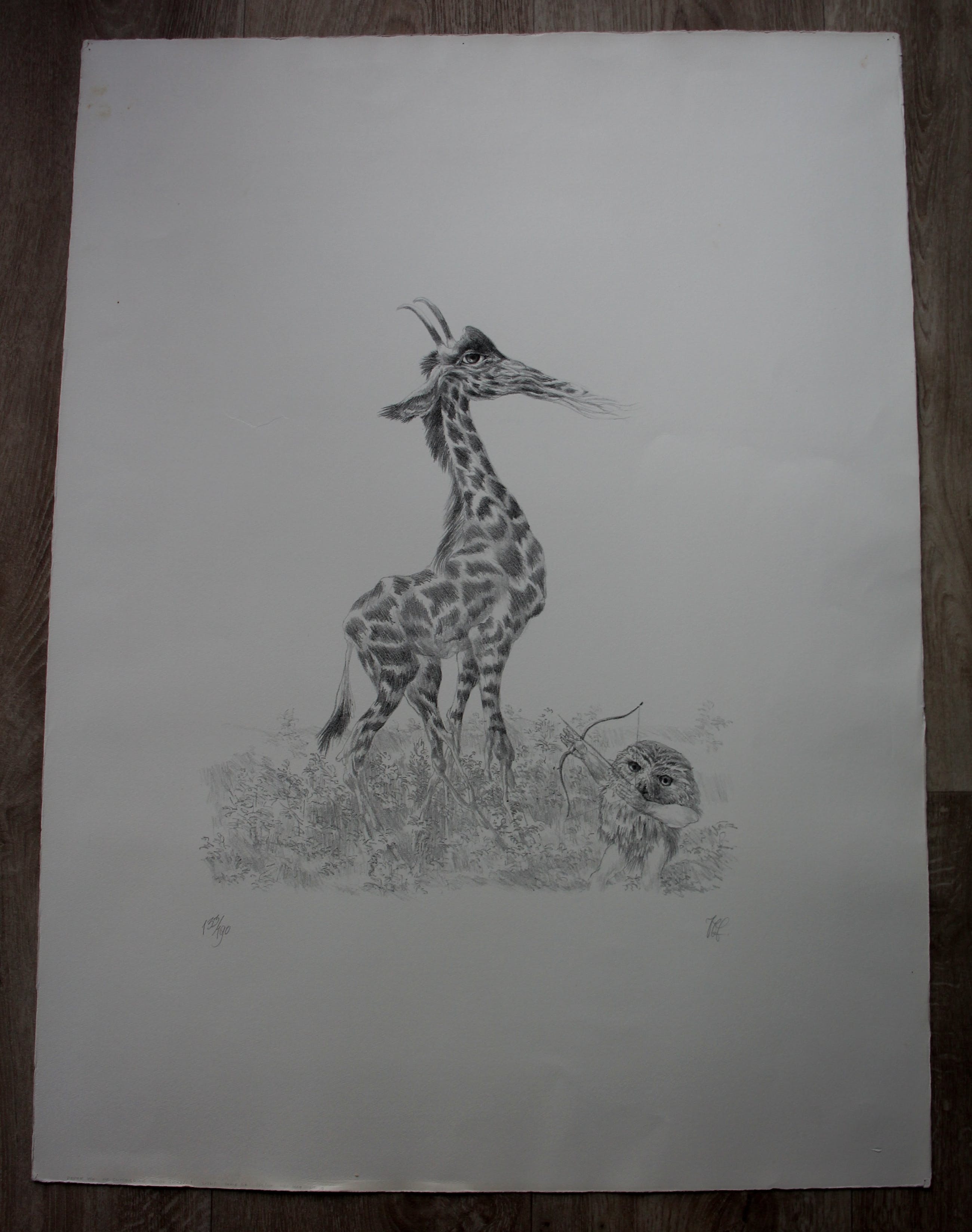 Litho van Peter Vos. Titel: De ontdekking van de giraffe. Jaar: 1969. Nummer: 133/190. Afmetingen blad: H76.5 x b56.5 cm. Afmetingen voorstelling: H40 x b35 cm. Het werk is rechtsonder, met potlood, gesigneerd door de kunstenaar. De authenticiteit van het aangeboden werk wordt voor 100% gegarandeerd. Een certificaat van echtheid kan, op aanvraag, worden meegestuurd. Het werk is in goede staat.