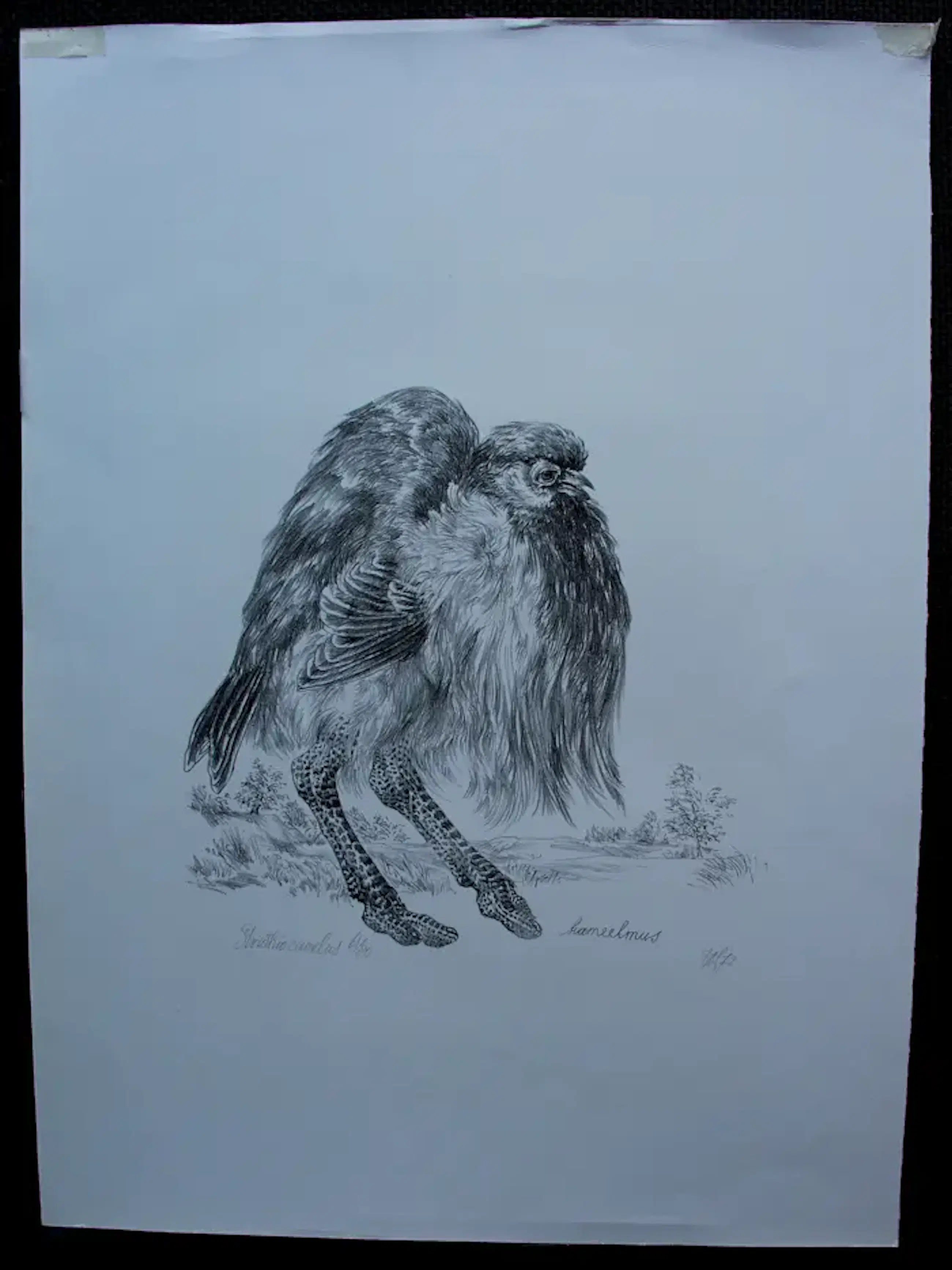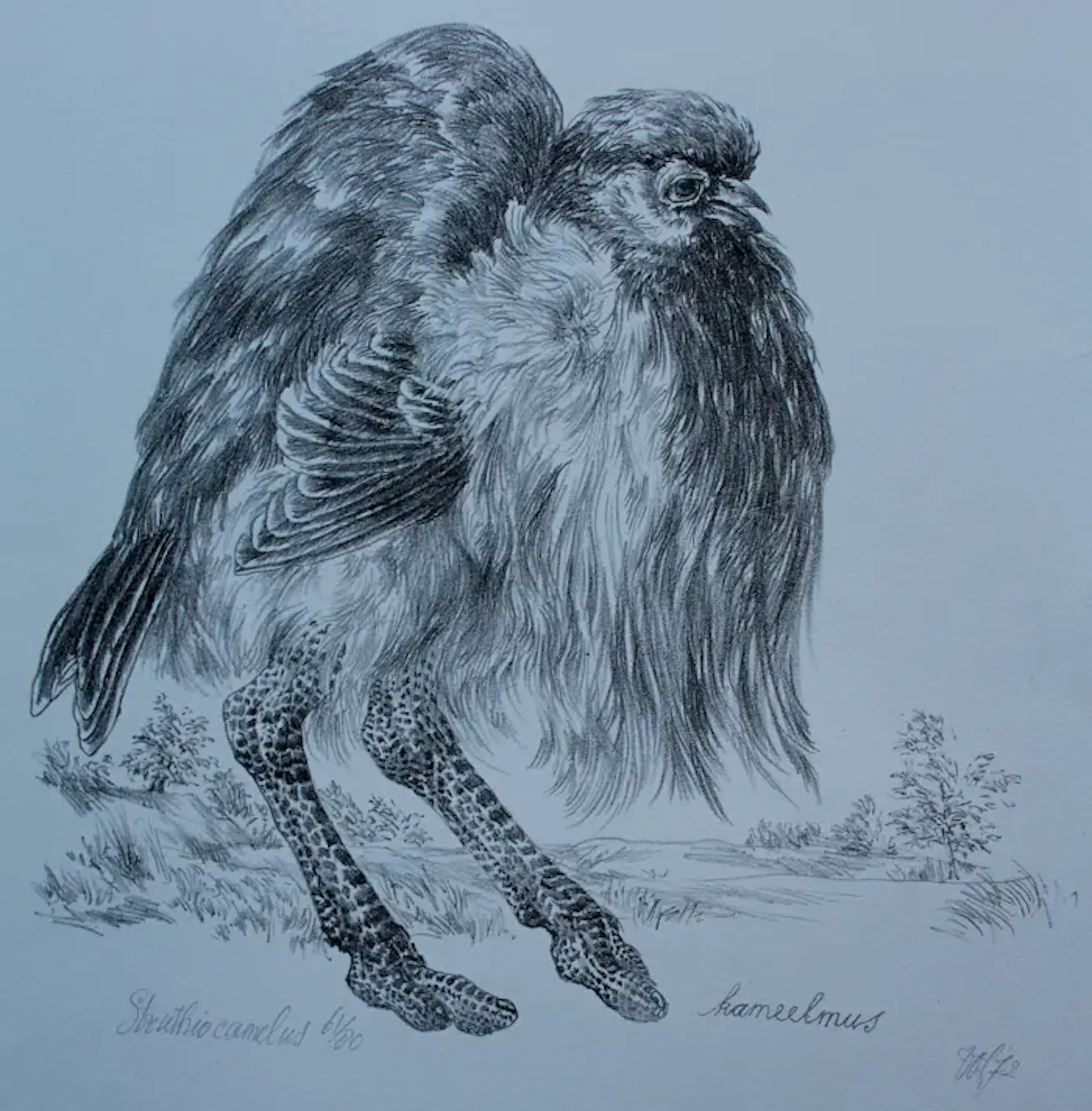Litho van Peter Vos uit 1972. Titel: Struthio camelus(struisvogel). Oplage: 61/80. Afmetingen blad: H54 x b41cmAfmetingen voorstelling: H28,5 x 27cm. Het werk is rechts onderaan gesigneerd en gedateerd door de kunstenaar. De authenticiteit van het aangeboden werk kan volledig worden gegarandeerd. Een certificaat van echtheid kan, op aanvraag worden gemaild.
