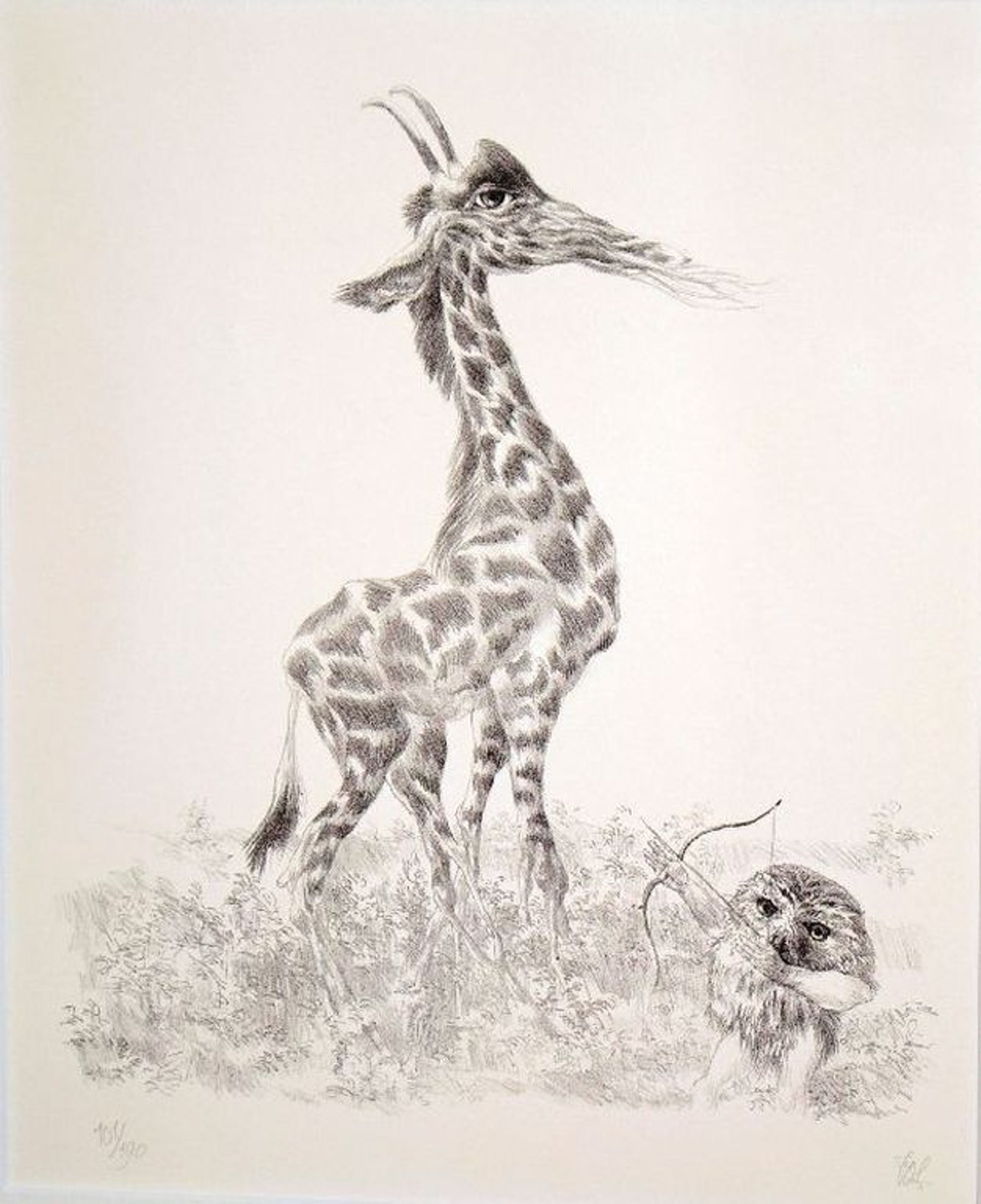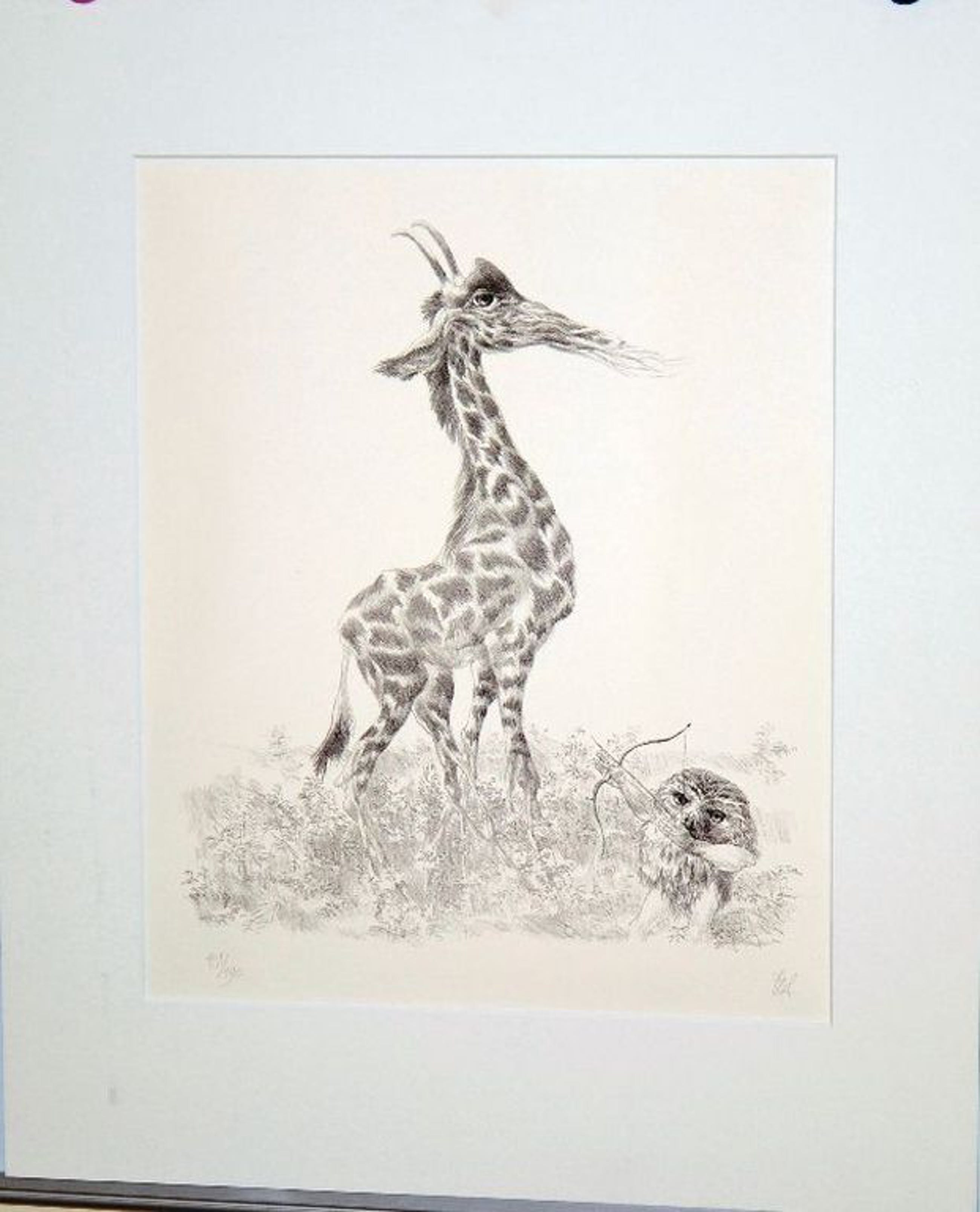 Lithografie De ontdekking van de Giraffe van Peter Vos in opdracht van Prent 190