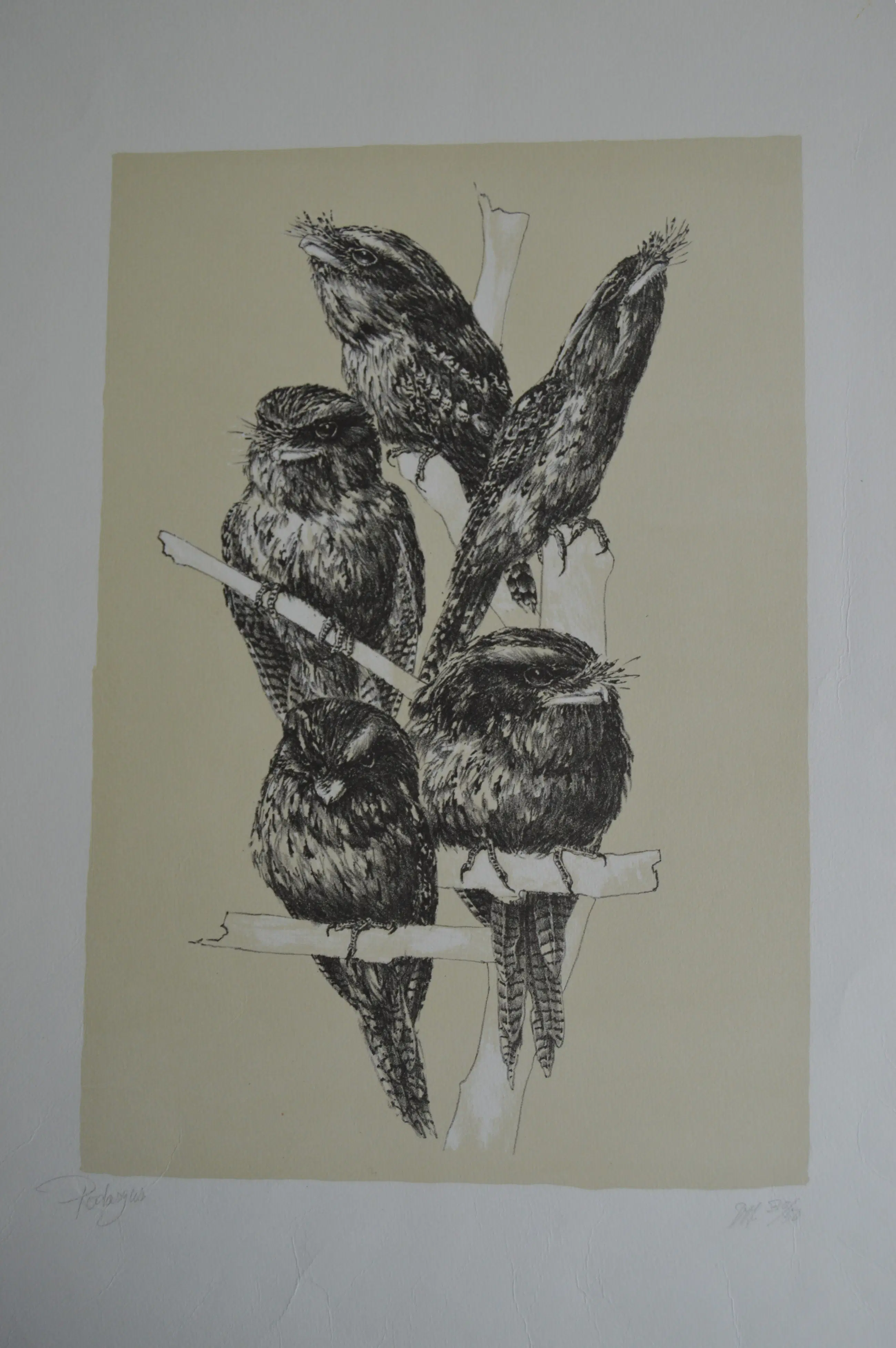 Litho op papier van Peter Vos. Titel: Podargus Strigoides. Uilnachtzwaluw, Australië. Afmetingen compleet blad: 50 x 39 cm. Afmetingen voorstelling: 35 x 24cm. Het werk is, rechts onder de afbeelding, gesigneerd en genummerd in potlood door de kunstenaar. Dit is nummer 30/50