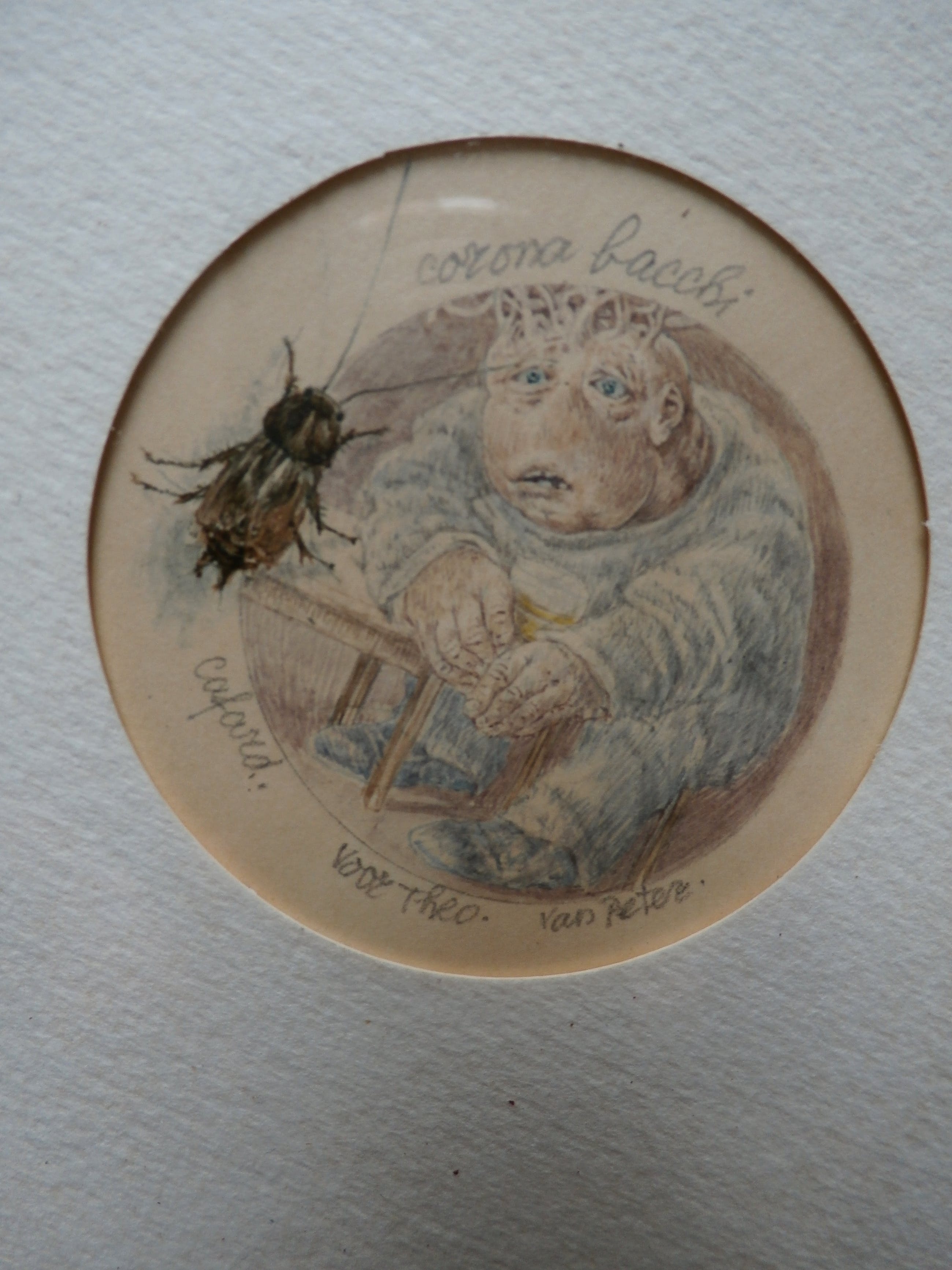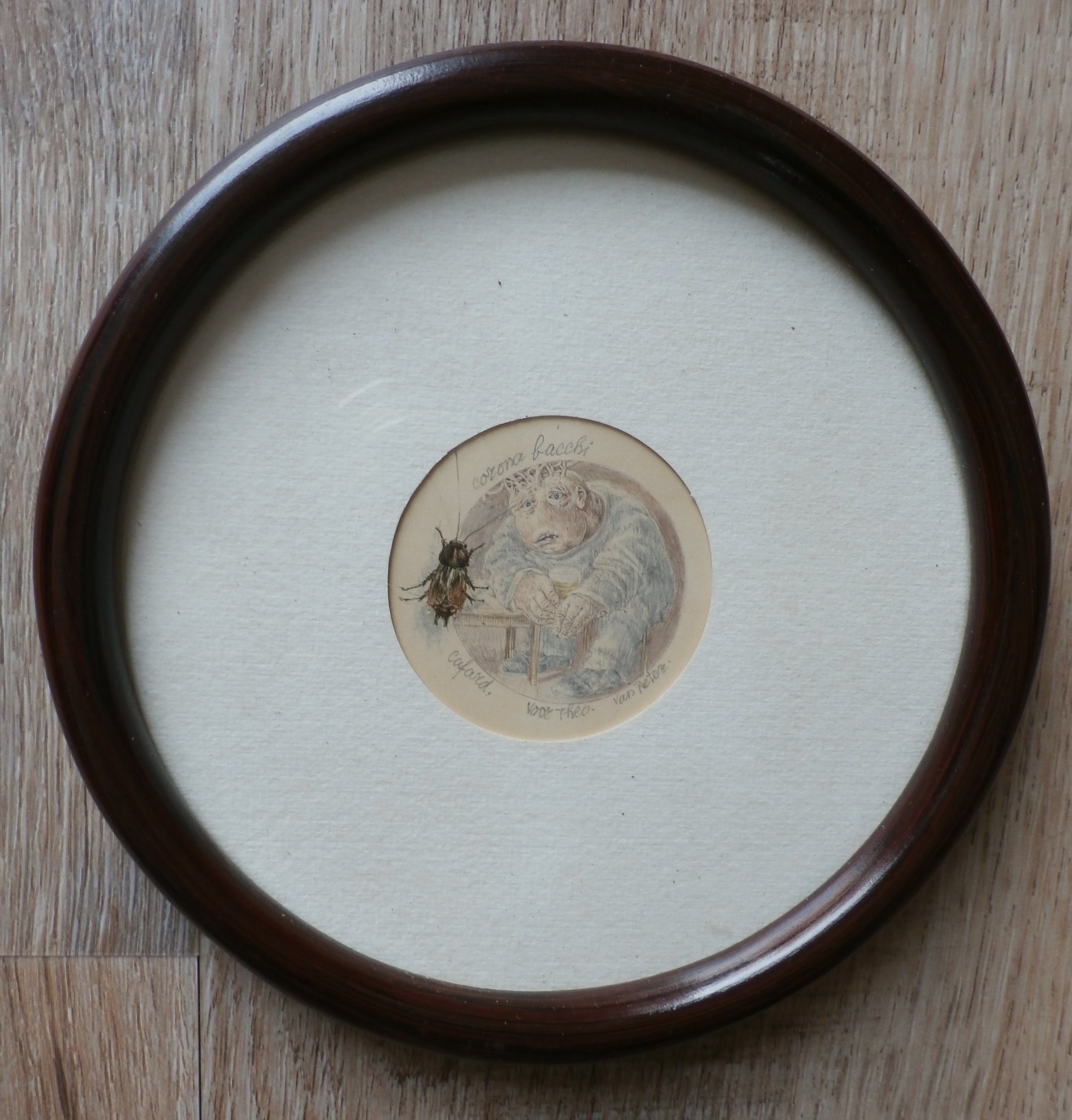 Ronde ingelijste tekening (kleurpotlood en inkt) van Peter Vos. Titel: Corona bacchi...Cafard. Afmetingen werk incl lijst: H13.5 x b13.5 cm. Afmetingen voorstelling: H4.5 x b4.5 cm.