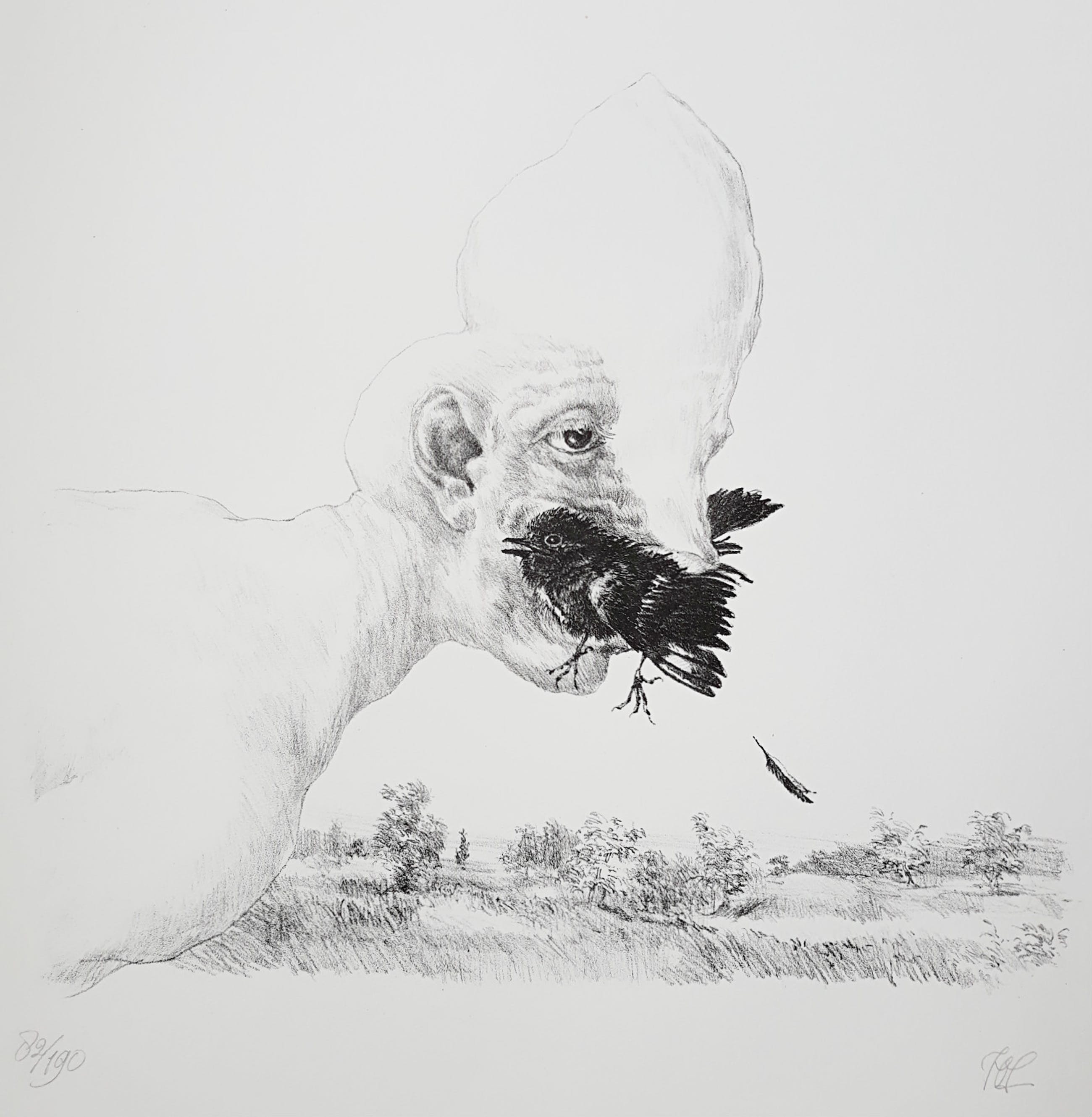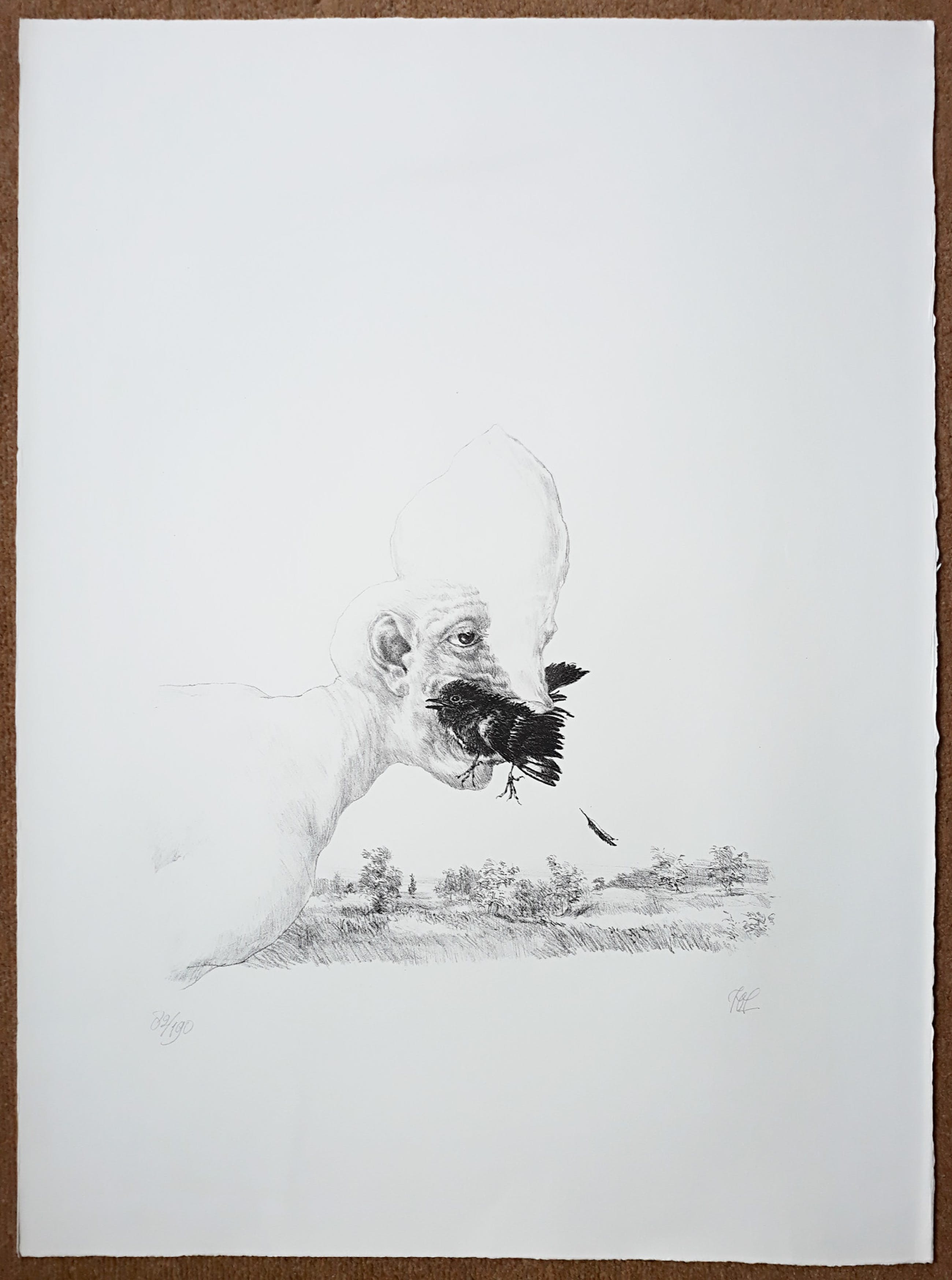 Karakteristiek werk van Peter Vos. Litho op geschept papier, met potlood gesigneerd en genummerd (82/190). In zeer goede conditie, blad heeft altijd in map gelegen, er zit alleen een lichte veeg in het bovenste gedeelte van de (zeer hoge) witte marge. Ingelijst met passe-partout is het werk uitstekend want de lichte veeg zit meer dan 12 centimeter verwijderd van de bovenkant van de voorstelling.