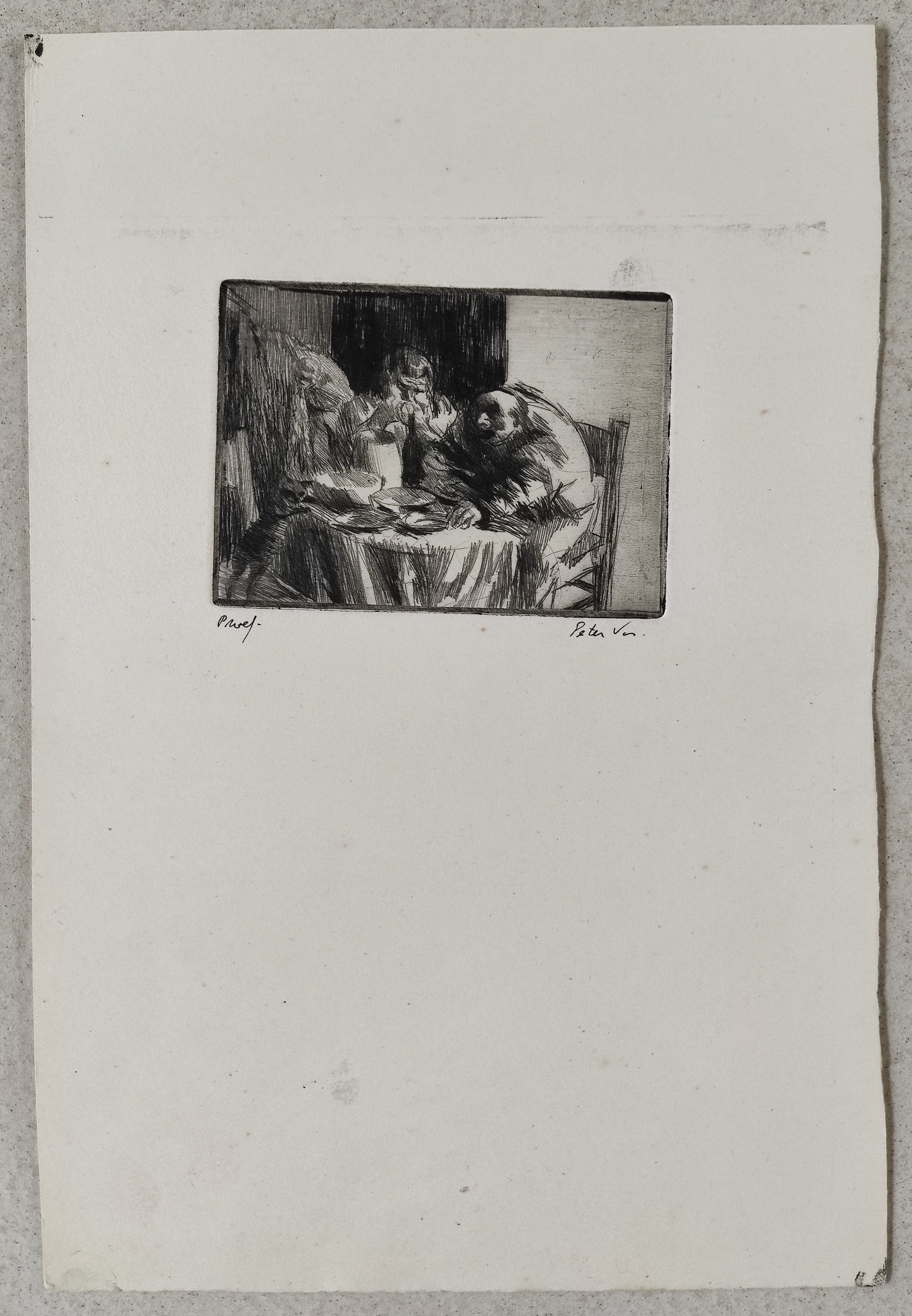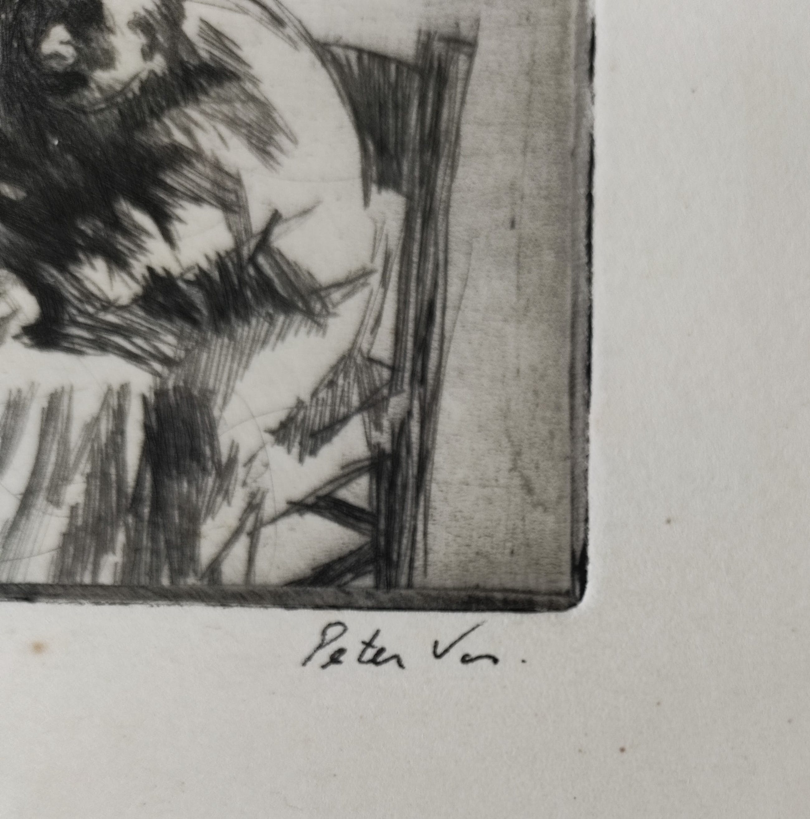 Zeldzame weinig gezien etsje van Peter Vos. Inkt gesigneerd rechtsonder. "Proef" linksonder. Beeldmaat 7x10 cm. Bladmaat 28x18,5 cm. Losbladig. Peter Vos werd geboren te Utrecht op 15 september 1935 en overleed aldaar op 7 november 2010. Opgeleid aan de Rijksacademie voor Beeldende Kunst te Amsterdam. Leerling van Kuno Brinks, Otto B. de Kat en Gé Röling. Lid van het grafisch gezelschap "de Luis"te Utrecht en de Hollandse Aquarellisten kring. Graficus en aquarellist van genre voorstellingen, dieren (vogels) en portretten.