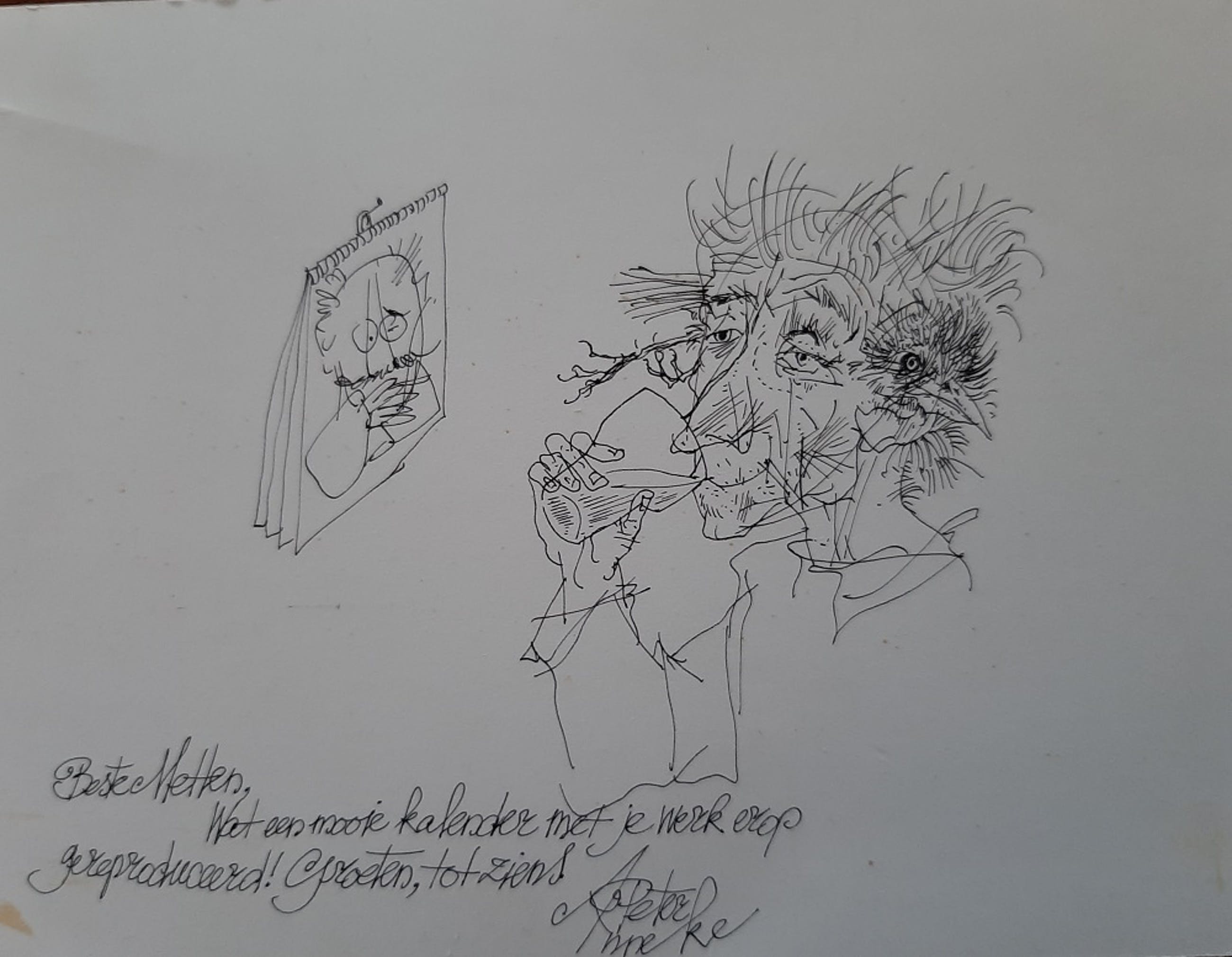De titel is van de inbrenger! Het betreft een bedankje van Peter Vos en zijn Anneke voor een toegezonden kalender van ene Metten (Koornstra?). De kunstenaar kijkt naar de gekregen kalender! Het is een prachtig kunstwerkje waarbij ik de kijker wil attenderen op de magistraal getekende vogel, die door het zelfportret van de kunstenaar vliegt. Rechts het vogelkopje, links de pootjes. Een bijzonder kunstwerkje van deze ras tekenaar.