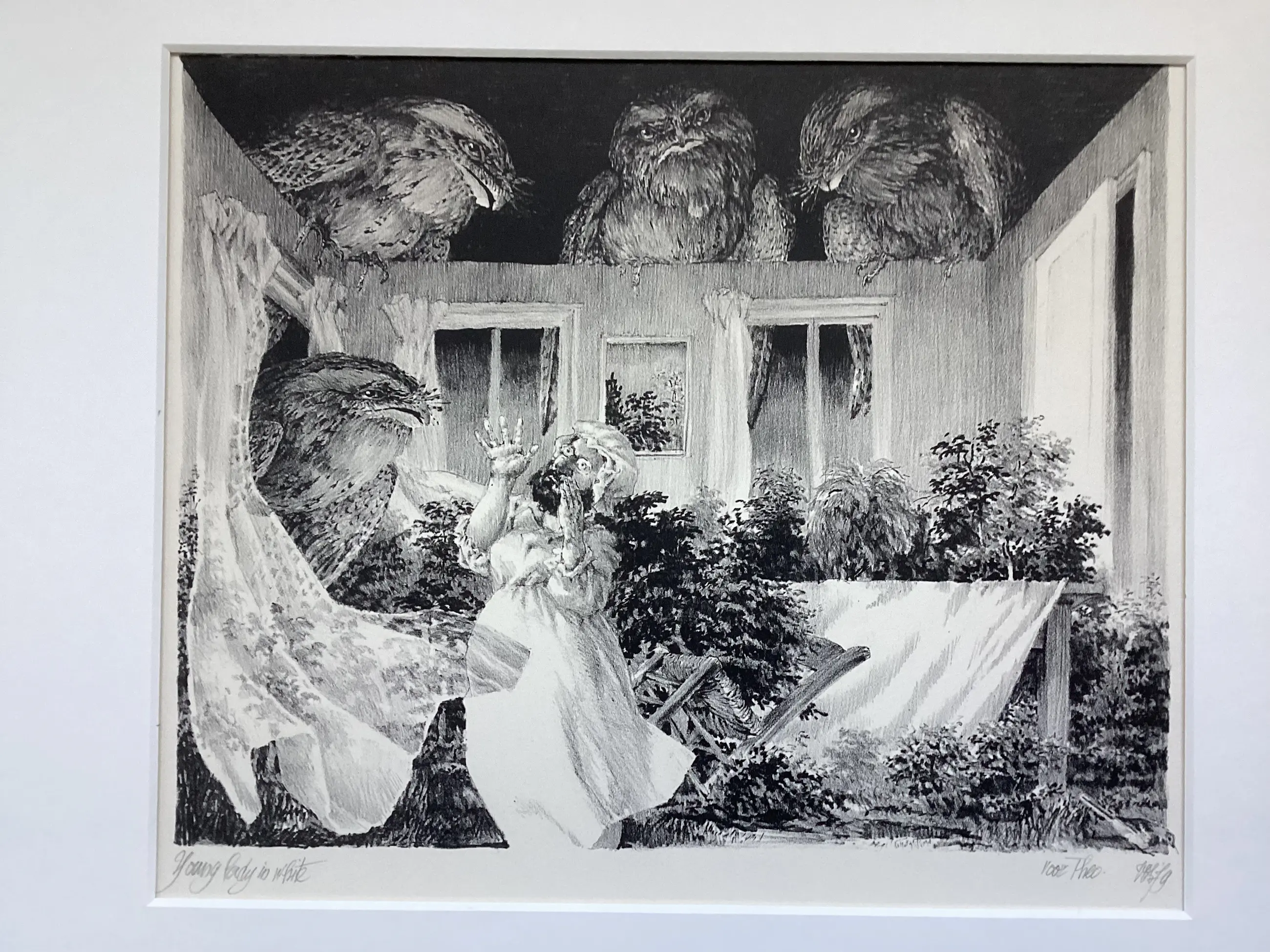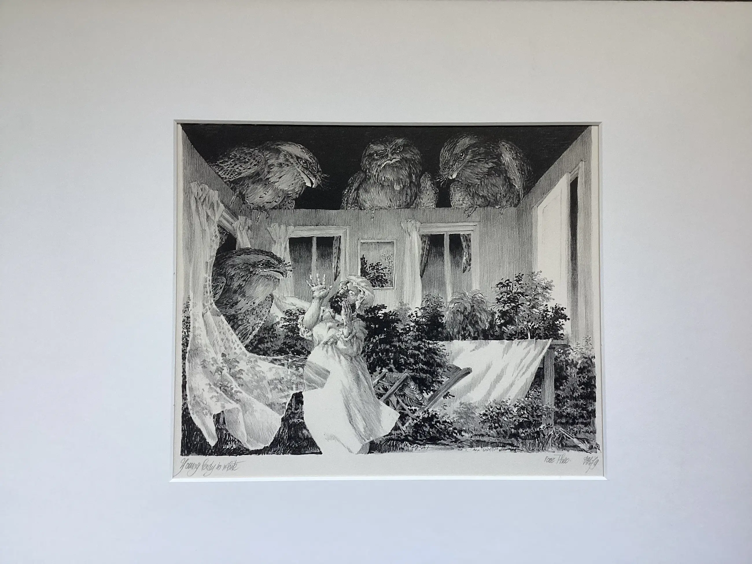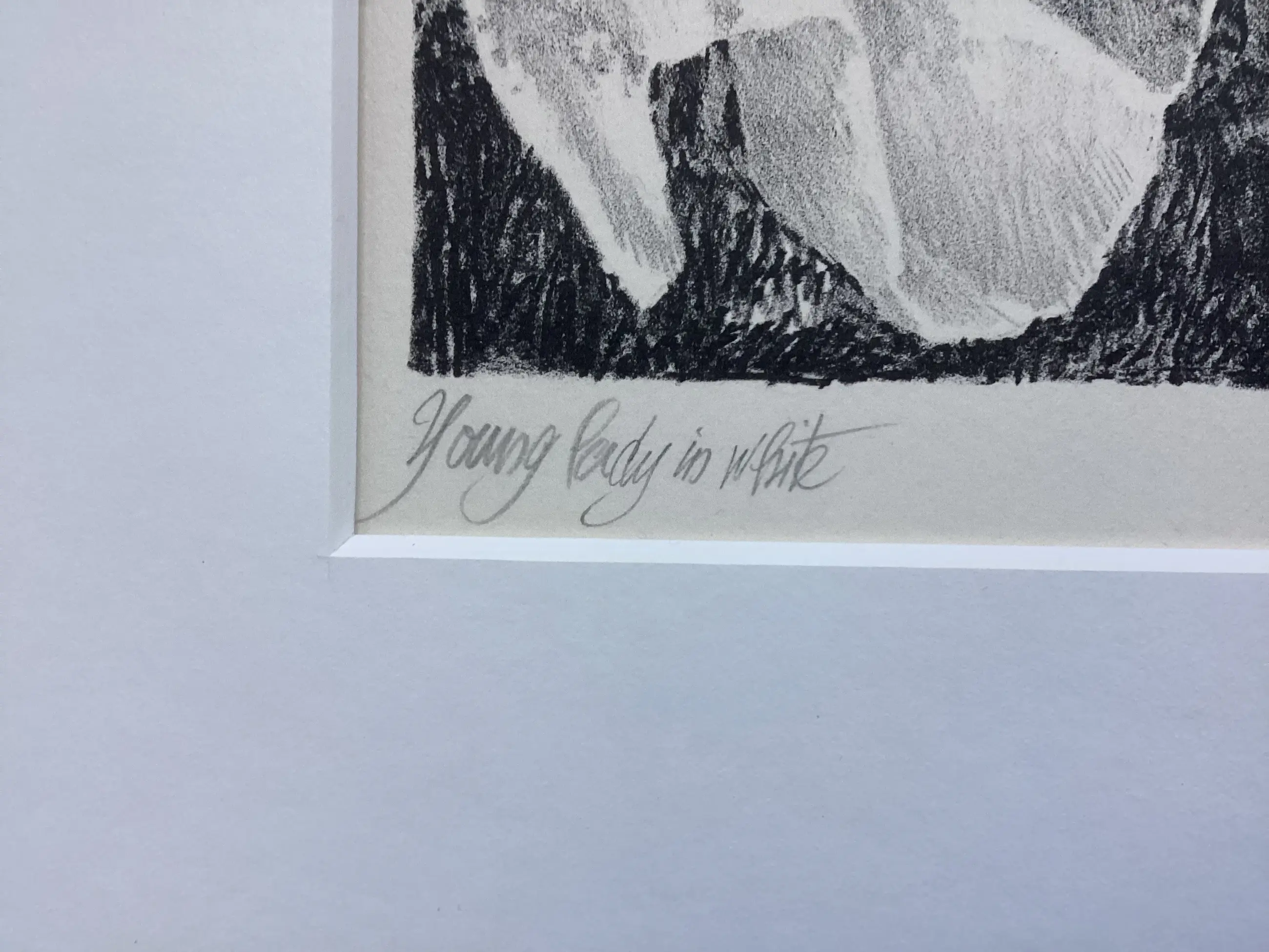 Peter Vos. “Young Lady in White”. Lithografie. “Dame in het wit“. (Edward Lear)